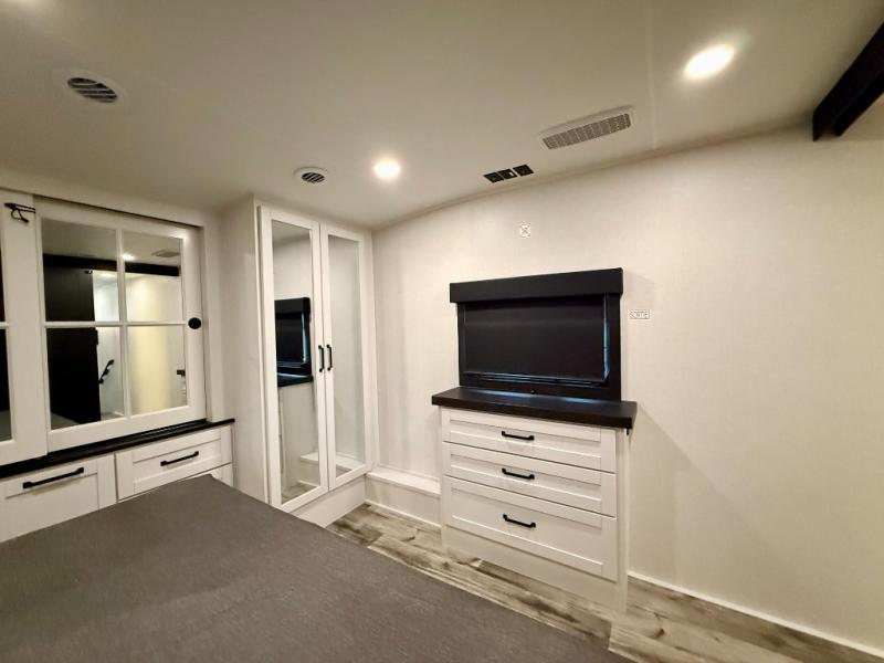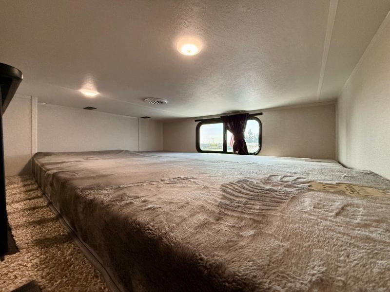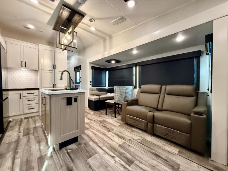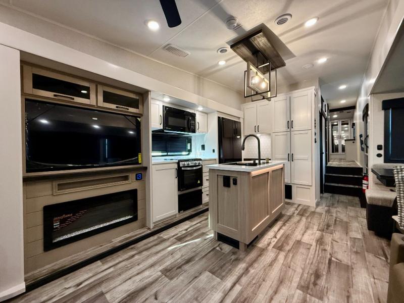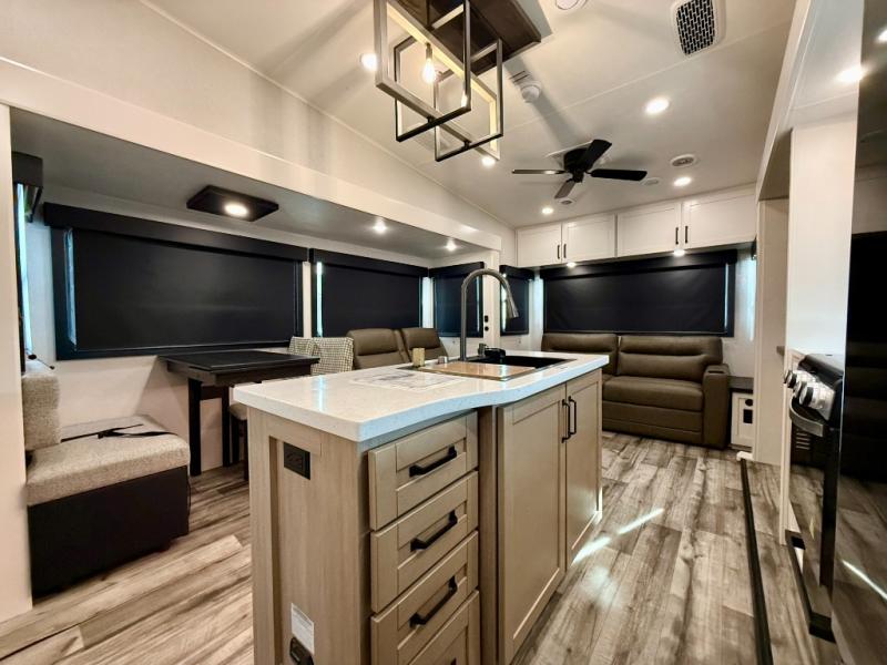 The perfect family-friendly fifth wheel is found with this Roamer! Once you arrive at the campsite, you can put out the two power awnings, then make lunch on the outside kitchen. There are plenty of comfortable seating spaces in the rear living area, including a tri-fold sofa, theater seat, plus table and chairs with a bench. The kitchen island provides extra counter space, along with a multi-functional sink, and you'll love having a pantry, hutch, and Hi Sense 12V black glass refrigerator for storage. The middle den includes a tri-fold sofa and a desk, perfect for a guest bedroom or office, plus there is a loft above for extra sleeping or storage space! And the owners will enjoy their own space up front in the private bedroom, complete with an Olympic queen bed, a closet with shelves and drawers below, a storage chest, plus washer and dryer prep!