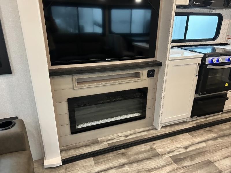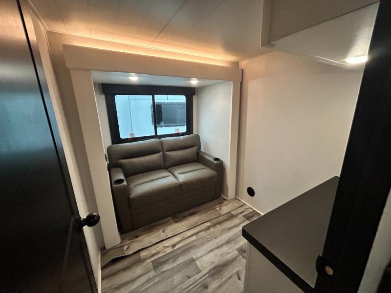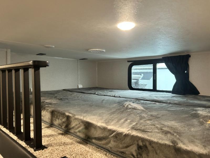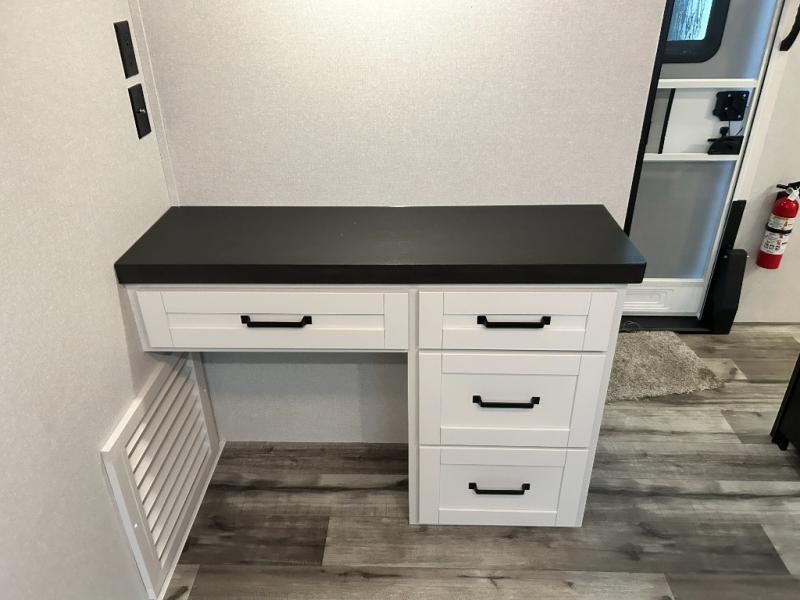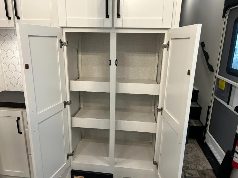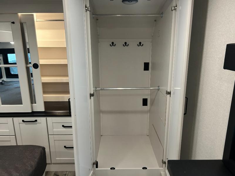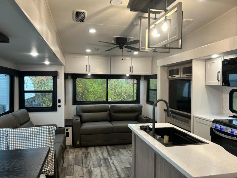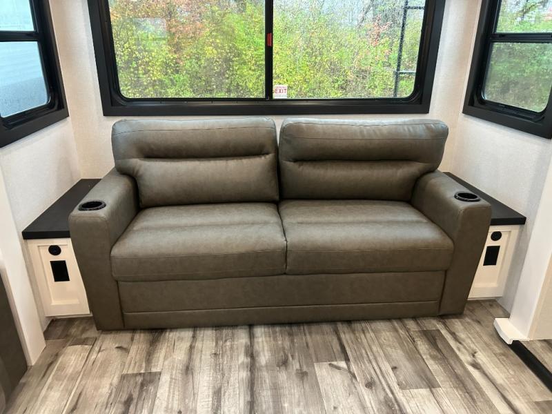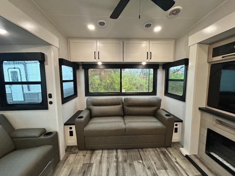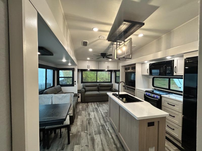 The perfect family-friendly fifth wheel is found with this Roamer! Once you arrive at the campsite, you can put out the two power awnings, then make lunch on the outside kitchen. There are plenty of comfortable seating spaces in the rear living area, including a tri-fold sofa, theater seat, plus table and chairs with a bench. The kitchen island provides extra counter space, along with a multi-functional sink, and you'll love having a pantry, hutch, and Hi Sense 12V black glass refrigerator for storage. The middle den includes a tri-fold sofa and a desk, perfect for a guest bedroom or office, plus there is a loft above for extra sleeping or storage space! And the owners will enjoy their own space up front in the private bedroom, complete with an Olympic queen bed, a closet with shelves and drawers below, a storage chest, plus washer and dryer prep!