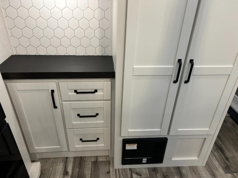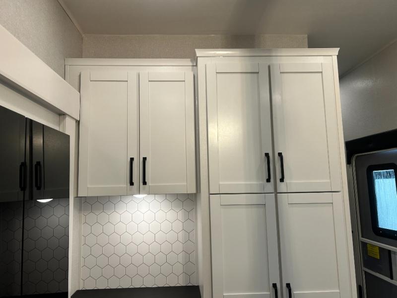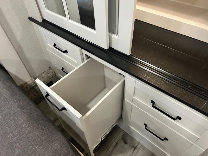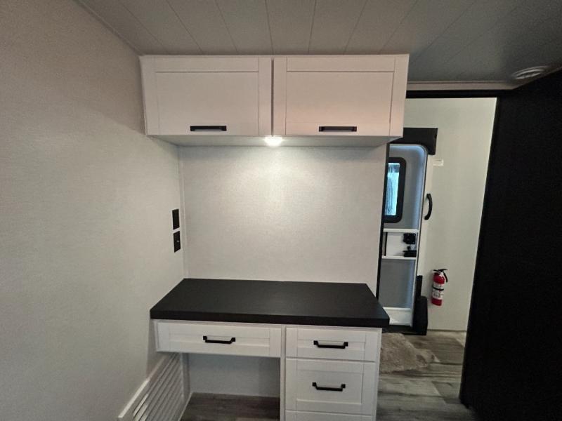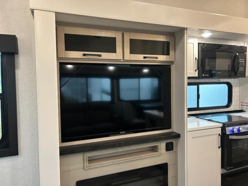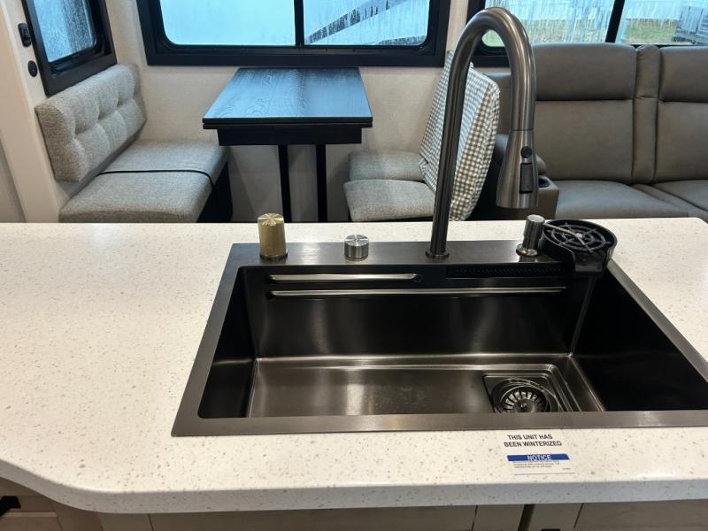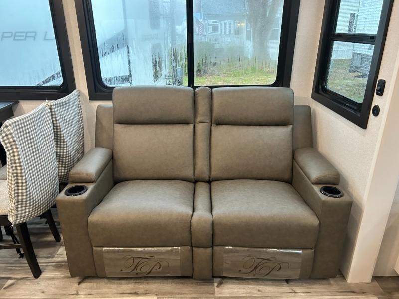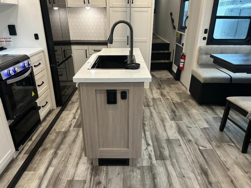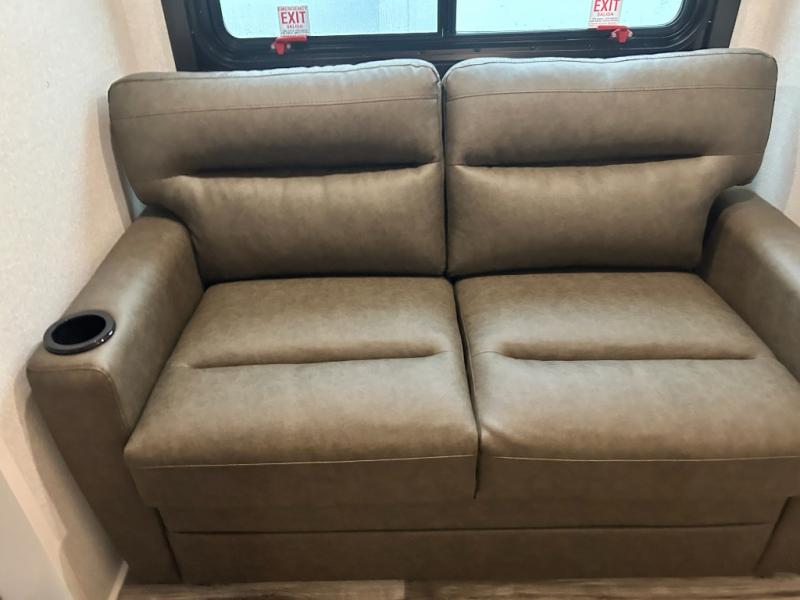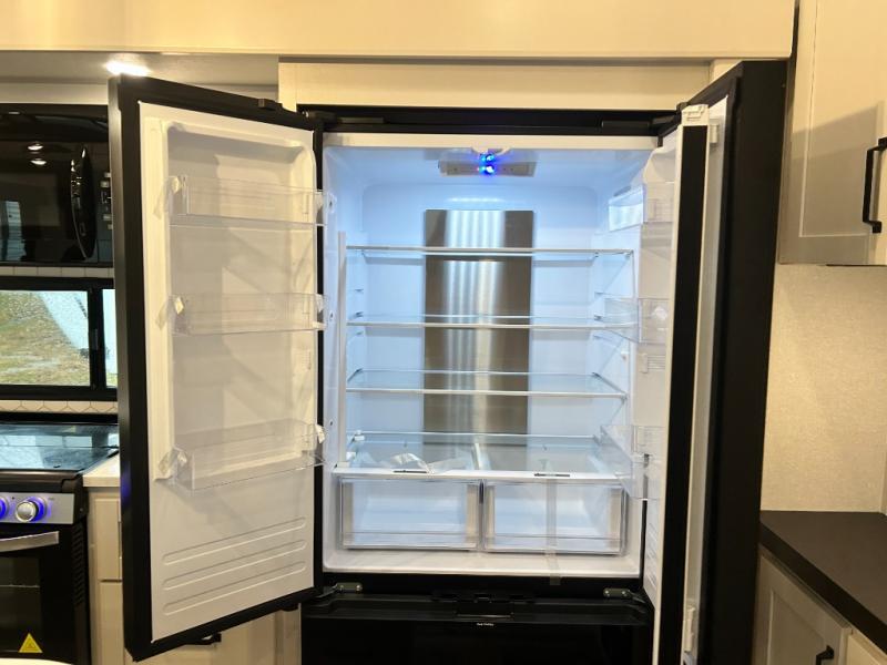 The perfect family-friendly fifth wheel is found with this Roamer! Once you arrive at the campsite, you can put out the two power awnings, then make lunch on the outside kitchen. There are plenty of comfortable seating spaces in the rear living area, including a tri-fold sofa, theater seat, plus table and chairs with a bench. The kitchen island provides extra counter space, along with a multi-functional sink, and you'll love having a pantry, hutch, and Hi Sense 12V black glass refrigerator for storage. The middle den includes a tri-fold sofa and a desk, perfect for a guest bedroom or office, plus there is a loft above for extra sleeping or storage space! And the owners will enjoy their own space up front in the private bedroom, complete with an Olympic queen bed, a closet with shelves and drawers below, a storage chest, plus washer and dryer prep!