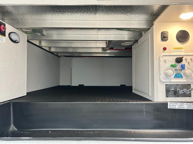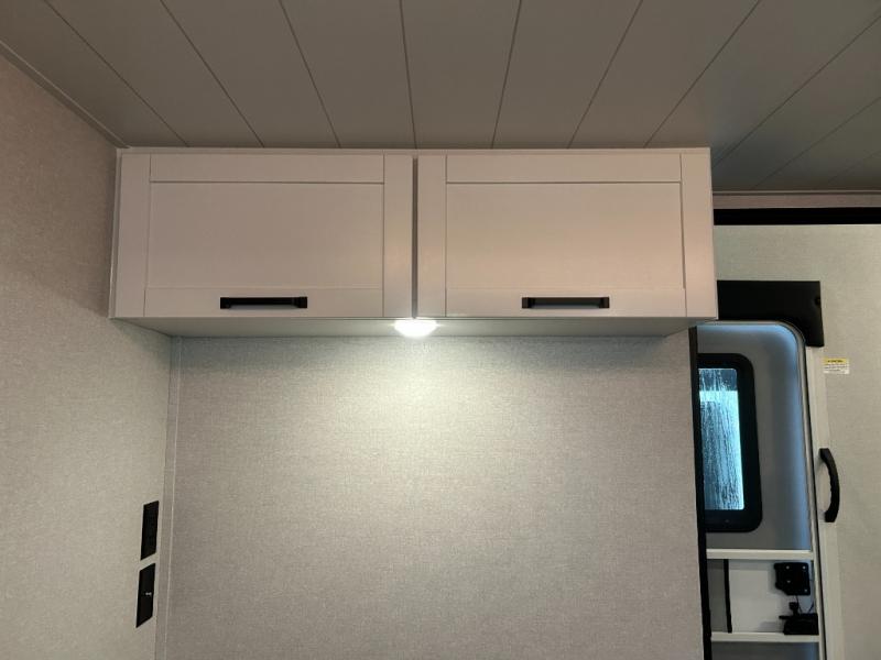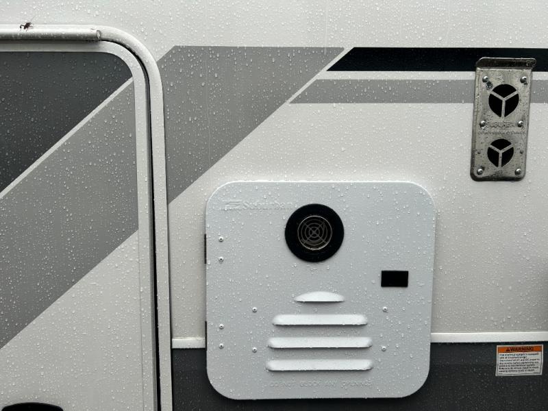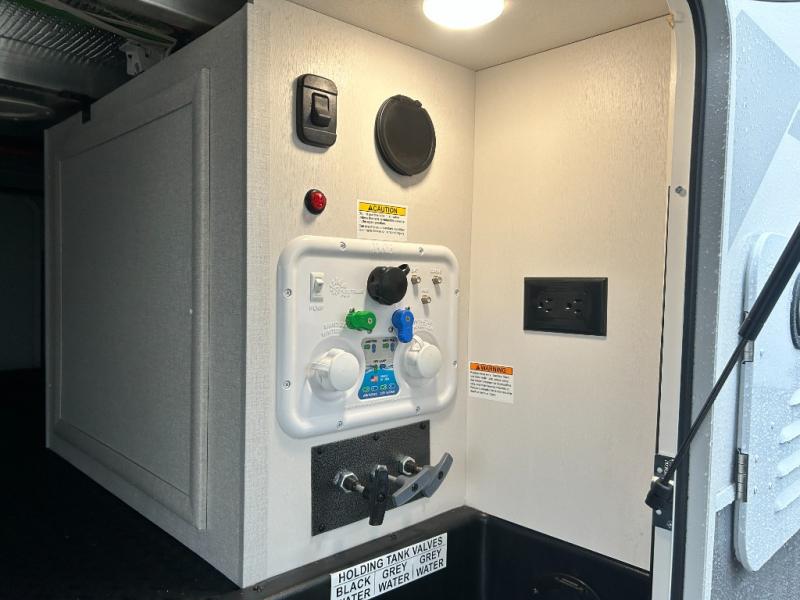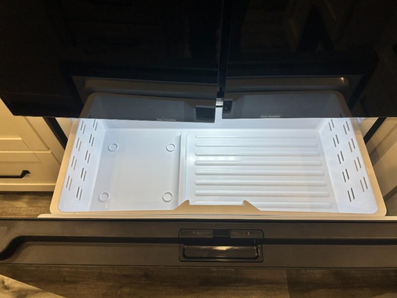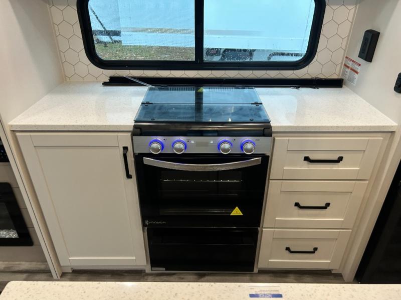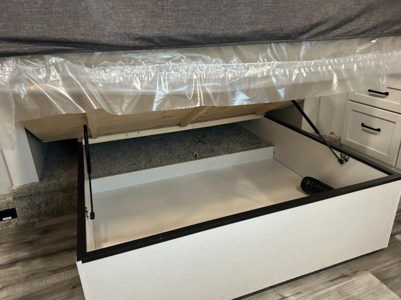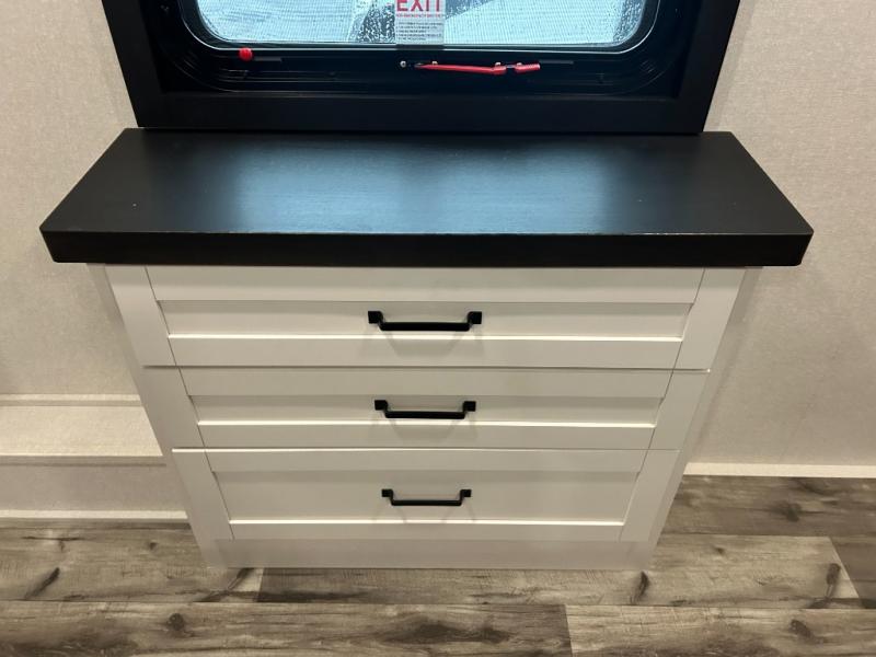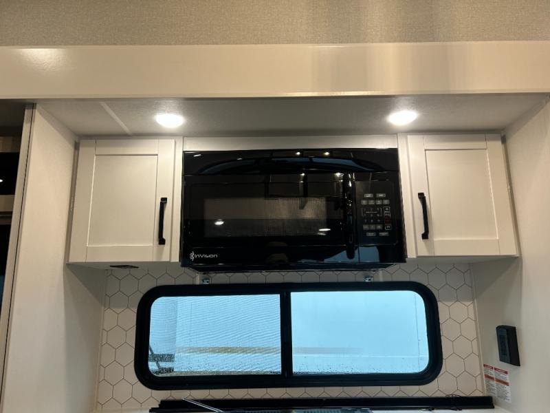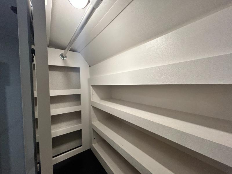 The perfect family-friendly fifth wheel is found with this Roamer! Once you arrive at the campsite, you can put out the two power awnings, then make lunch on the outside kitchen. There are plenty of comfortable seating spaces in the rear living area, including a tri-fold sofa, theater seat, plus table and chairs with a bench. The kitchen island provides extra counter space, along with a multi-functional sink, and you'll love having a pantry, hutch, and Hi Sense 12V black glass refrigerator for storage. The middle den includes a tri-fold sofa and a desk, perfect for a guest bedroom or office, plus there is a loft above for extra sleeping or storage space! And the owners will enjoy their own space up front in the private bedroom, complete with an Olympic queen bed, a closet with shelves and drawers below, a storage chest, plus washer and dryer prep!