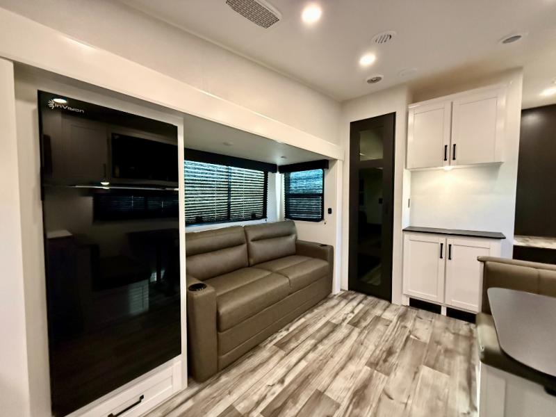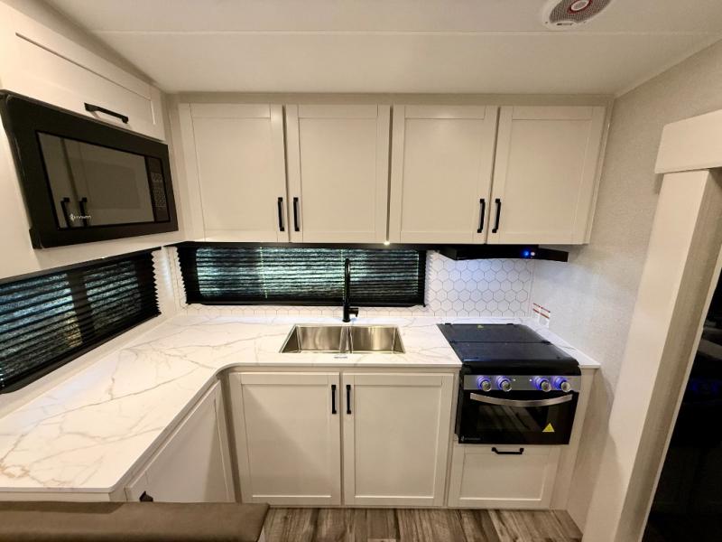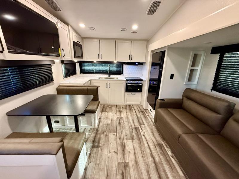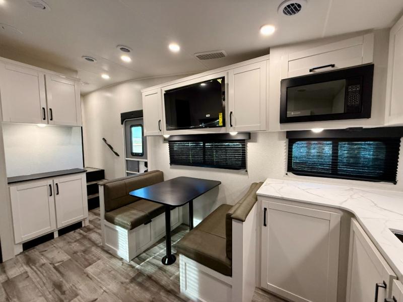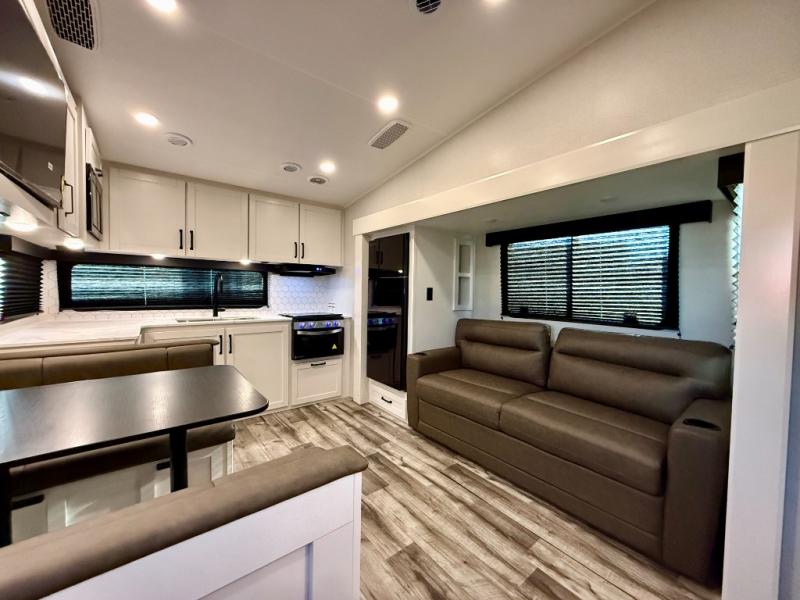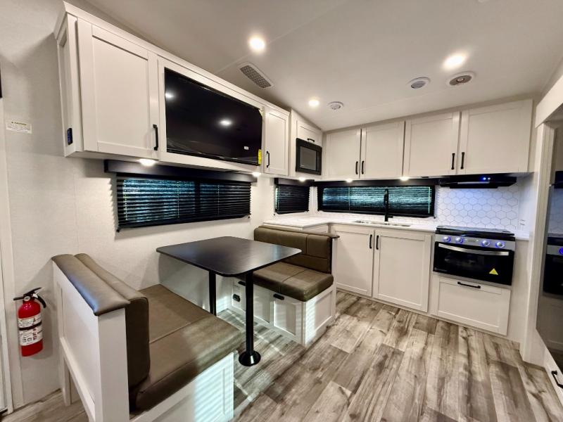 Pack your bags and head to the campground in this rear kitchen fifth wheel! There is ample counter space to prep meals, along with a range and over-the-range microwave. The booth dinette provides a place to dine together, and the tri-fold sofa will be the perfect place to relax in the evenings. There is also a Smart TV across from the sofa to make movie nights complete! The centrally located full bath includes a 30" x 36" shower with a skylight to give you more head room as you get ready each day, and the front private bedroom with a wardrobe slide gives you more space to get dressed in the morning. There is also a queen bed here, dual nightstands, TV prep, and additional storage for shoes and clothes!