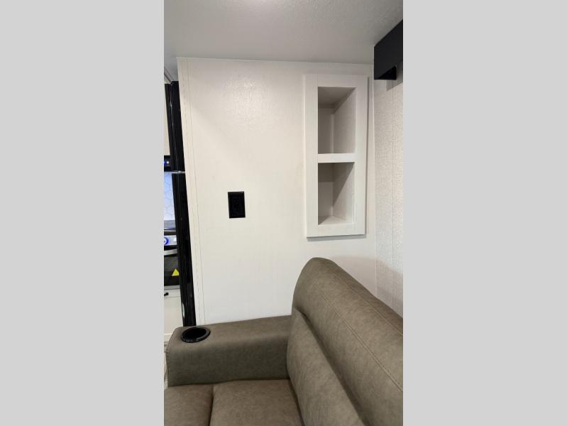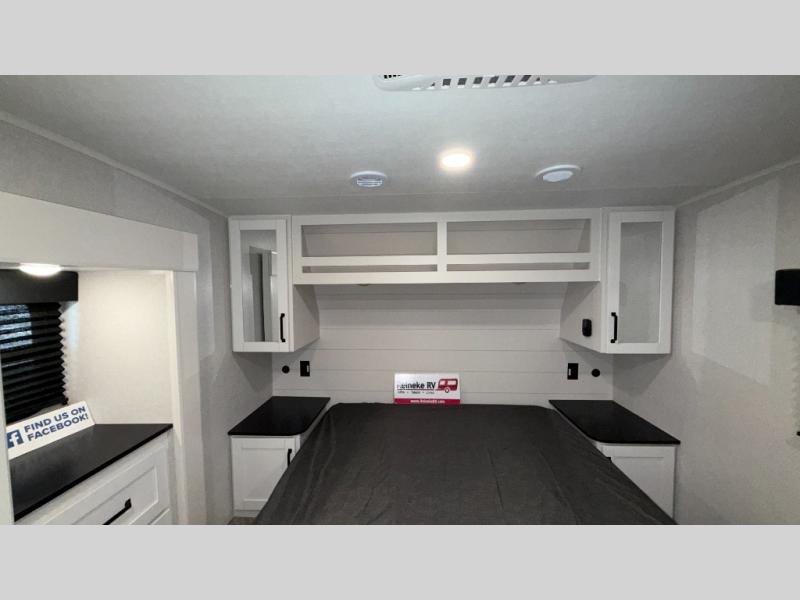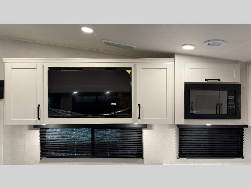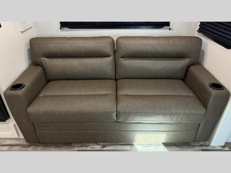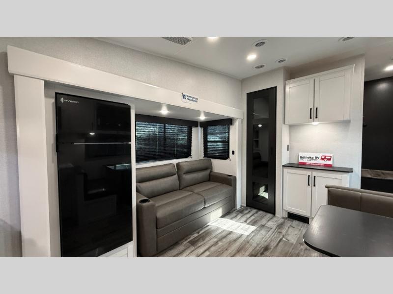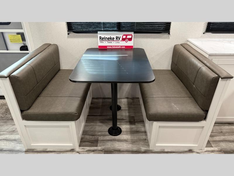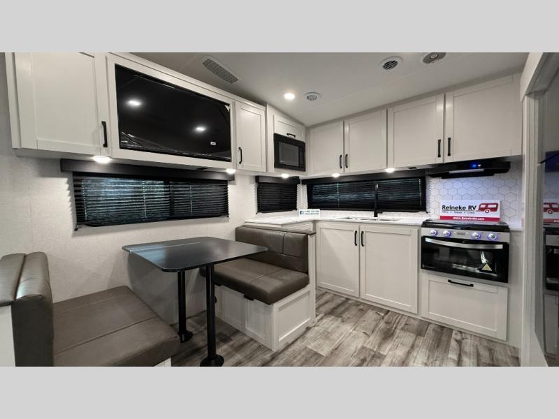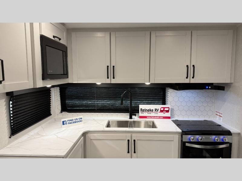 Pack your bags and head to the campground in this rear kitchen fifth wheel! There is ample counter space to prep meals, along with a range and over-the-range microwave. The booth dinette provides a place to dine together, and the tri-fold sofa will be the perfect place to relax in the evenings. There is also a Smart TV across from the sofa to make movie nights complete! The centrally located full bath includes a 30" x 36" shower with a skylight to give you more head room as you get ready each day, and the front private bedroom with a wardrobe slide gives you more space to get dressed in the morning. There is also a queen bed here, dual nightstands, TV prep, and additional storage for shoes and clothes!