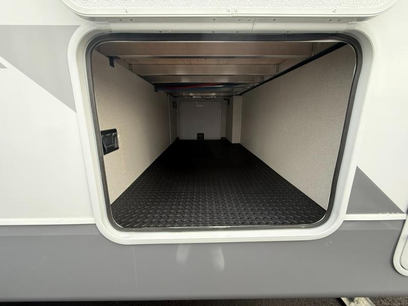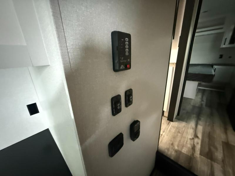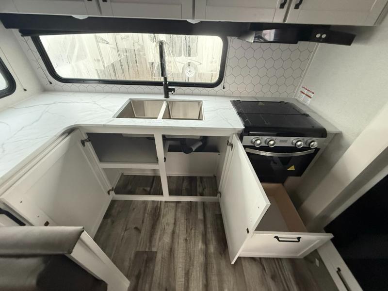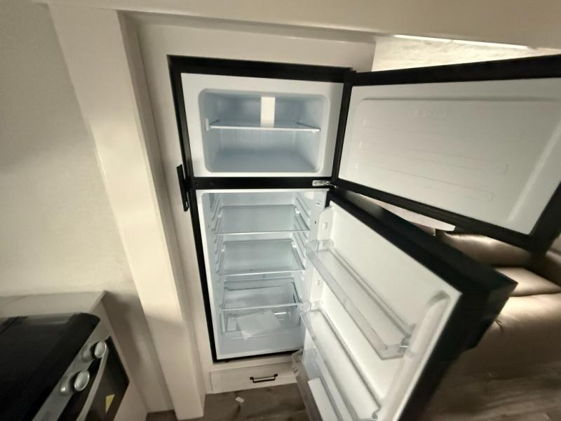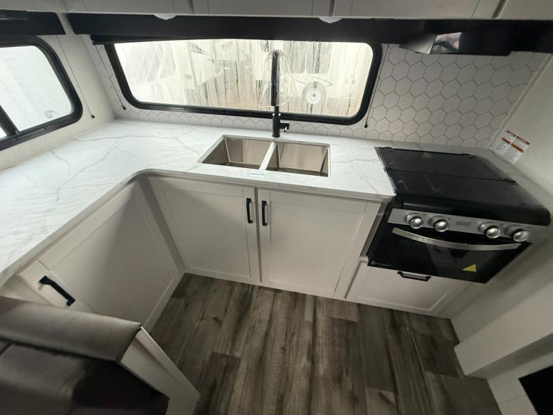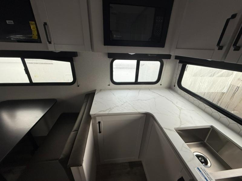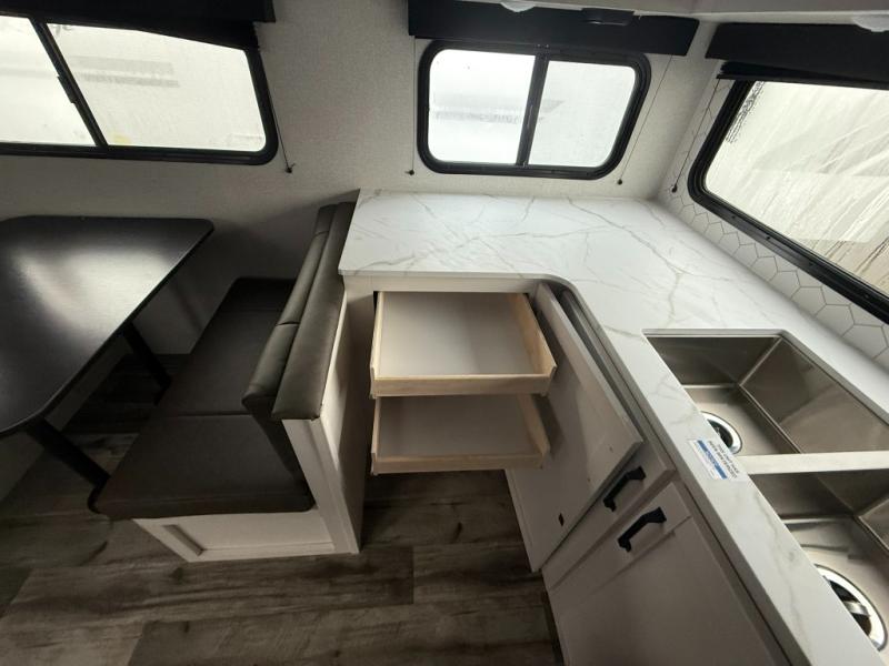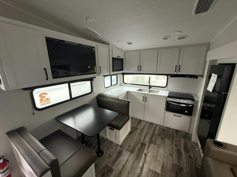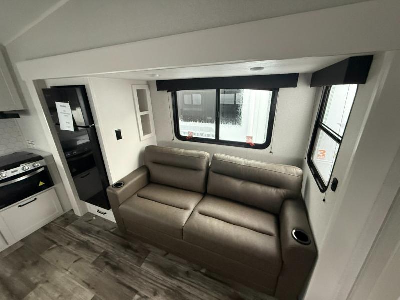 Pack your bags and head to the campground in this rear kitchen fifth wheel! There is ample counter space to prep meals, along with a range and over-the-range microwave. The booth dinette provides a place to dine together, and the tri-fold sofa will be the perfect place to relax in the evenings. There is also a Smart TV across from the sofa to make movie nights complete! The centrally located full bath includes a 30" x 36" shower with a skylight to give you more head room as you get ready each day, and the front private bedroom with a wardrobe slide gives you more space to get dressed in the morning. There is also a queen bed here, dual nightstands, TV prep, and additional storage for shoes and clothes!