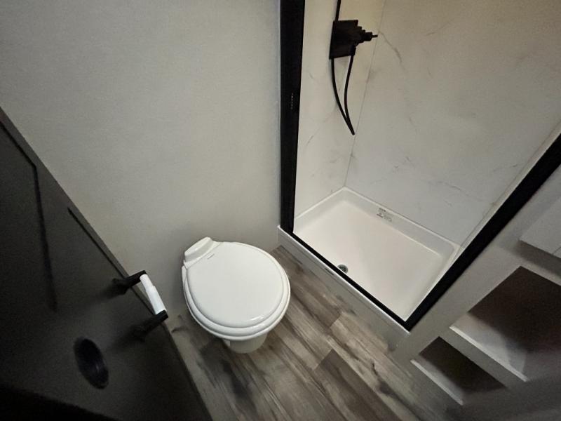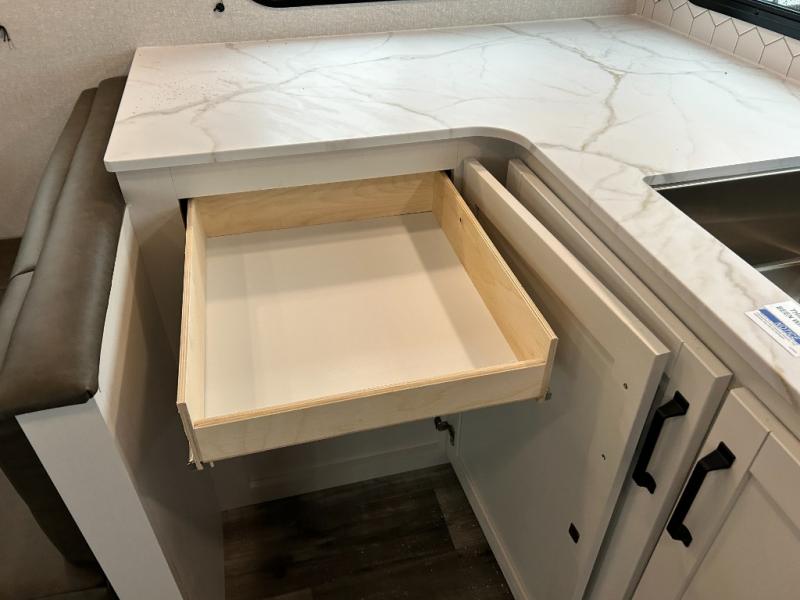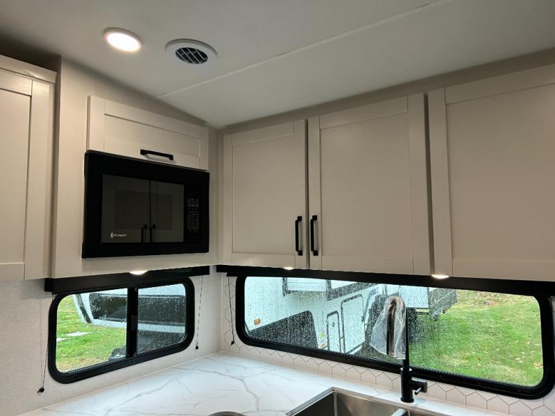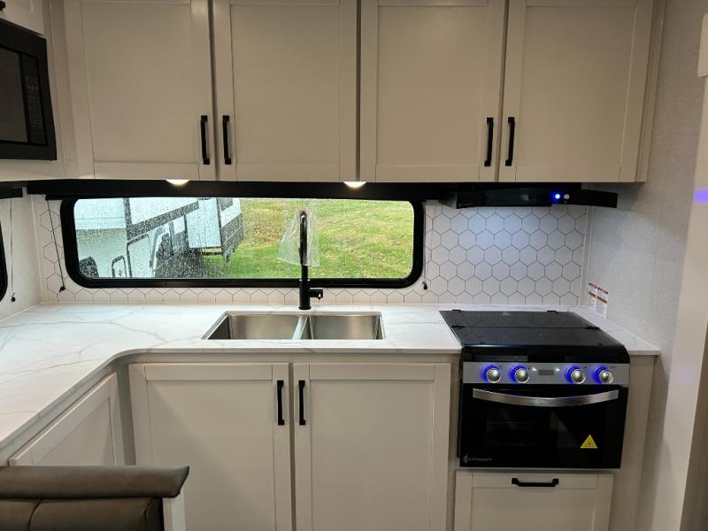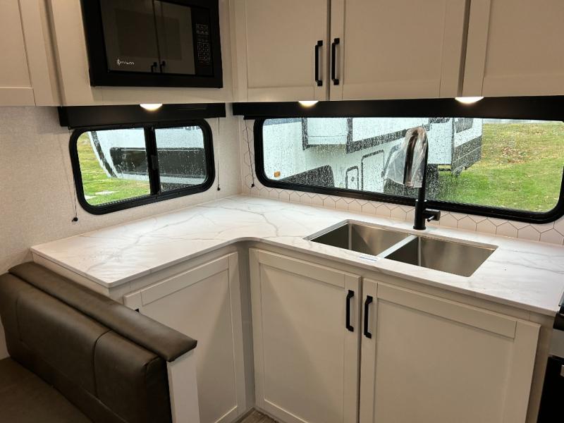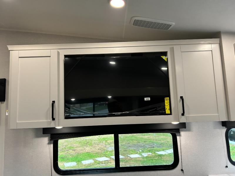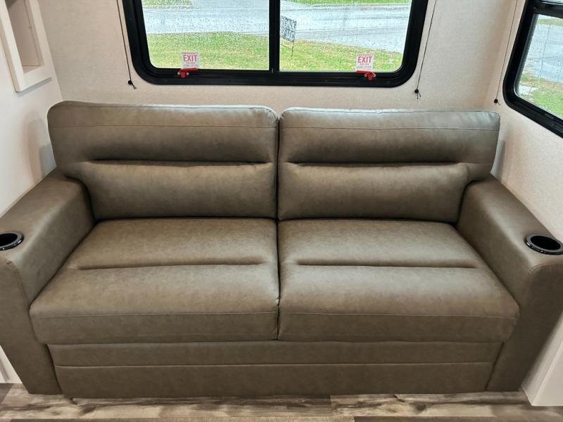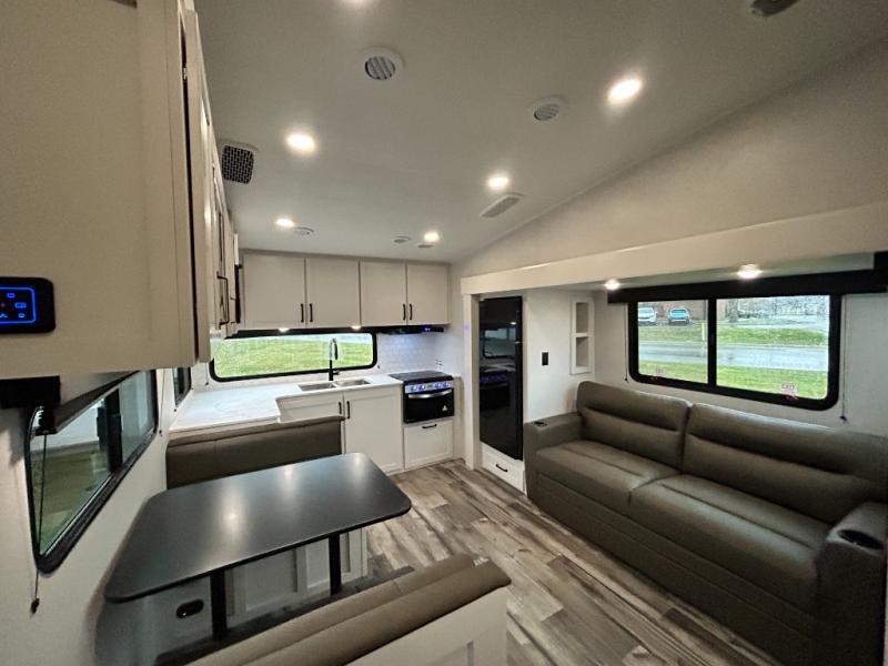 Pack your bags and head to the campground in this rear kitchen fifth wheel! There is ample counter space to prep meals, along with a range and over-the-range microwave. The booth dinette provides a place to dine together, and the tri-fold sofa will be the perfect place to relax in the evenings. There is also a Smart TV across from the sofa to make movie nights complete! The centrally located full bath includes a 30" x 36" shower with a skylight to give you more head room as you get ready each day, and the front private bedroom with a wardrobe slide gives you more space to get dressed in the morning. There is also a queen bed here, dual nightstands, TV prep, and additional storage for shoes and clothes!