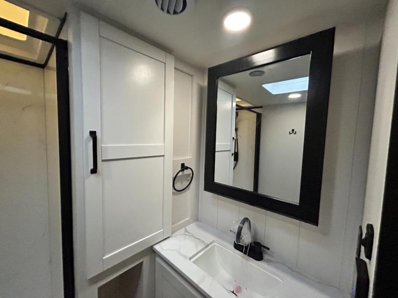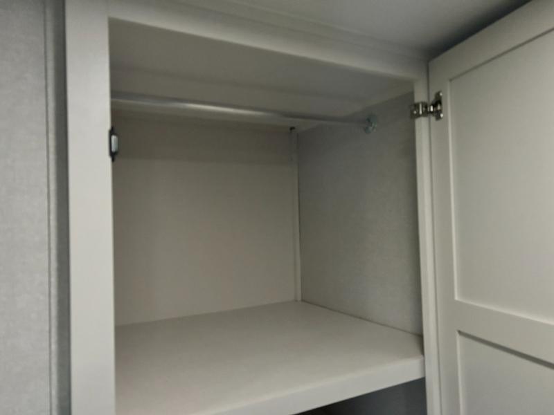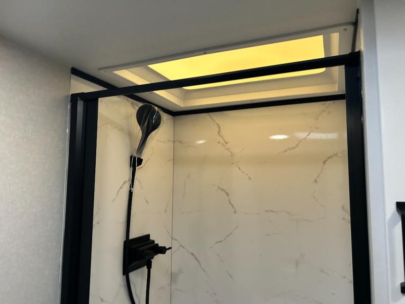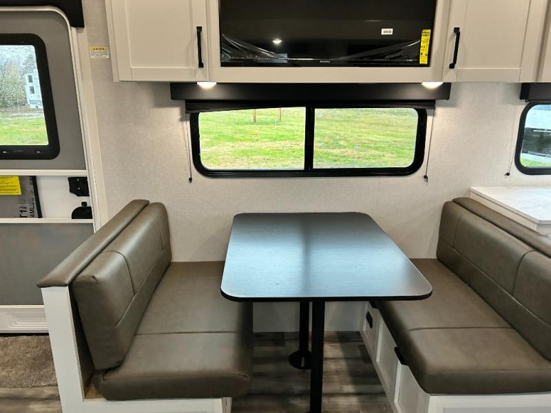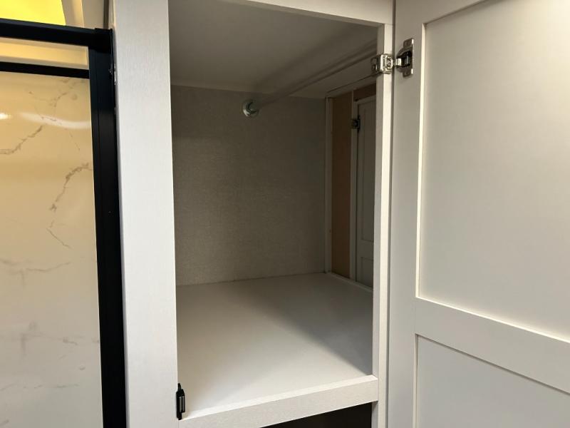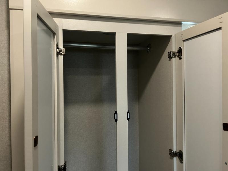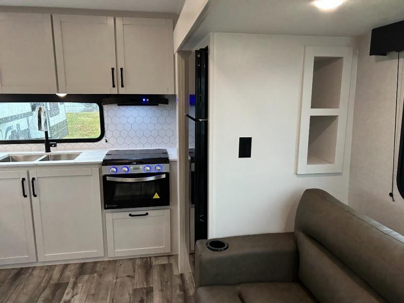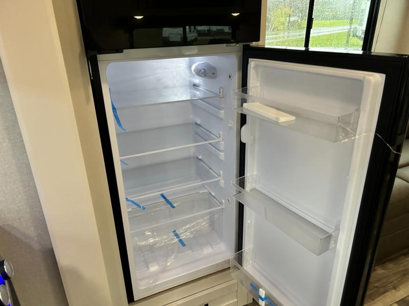 Pack your bags and head to the campground in this rear kitchen fifth wheel! There is ample counter space to prep meals, along with a range and over-the-range microwave. The booth dinette provides a place to dine together, and the tri-fold sofa will be the perfect place to relax in the evenings. There is also a Smart TV across from the sofa to make movie nights complete! The centrally located full bath includes a 30" x 36" shower with a skylight to give you more head room as you get ready each day, and the front private bedroom with a wardrobe slide gives you more space to get dressed in the morning. There is also a queen bed here, dual nightstands, TV prep, and additional storage for shoes and clothes!