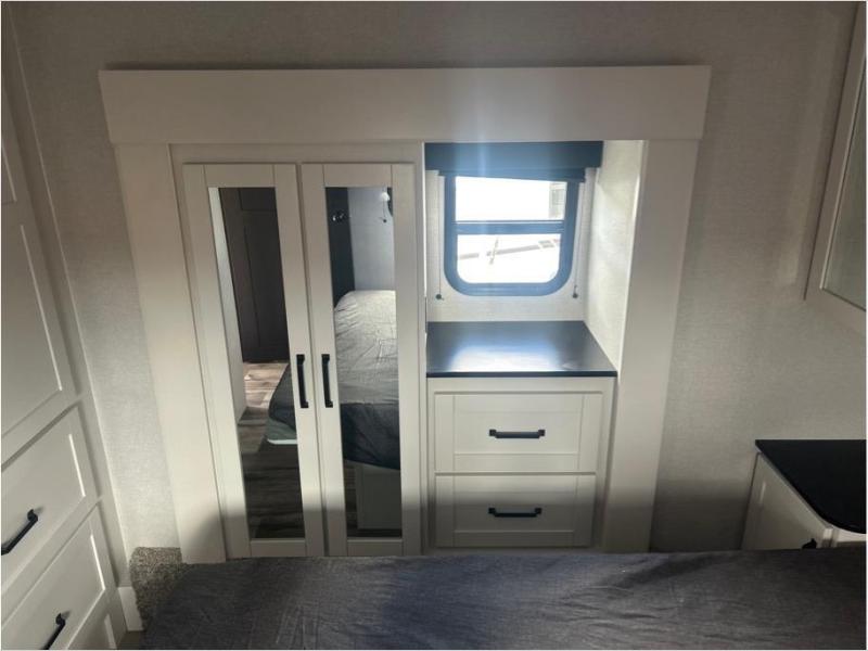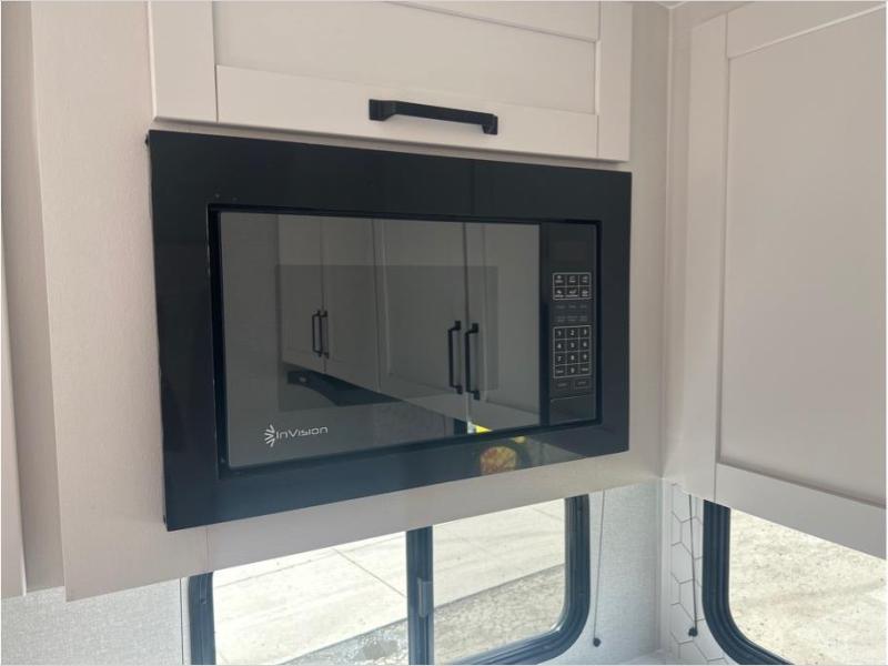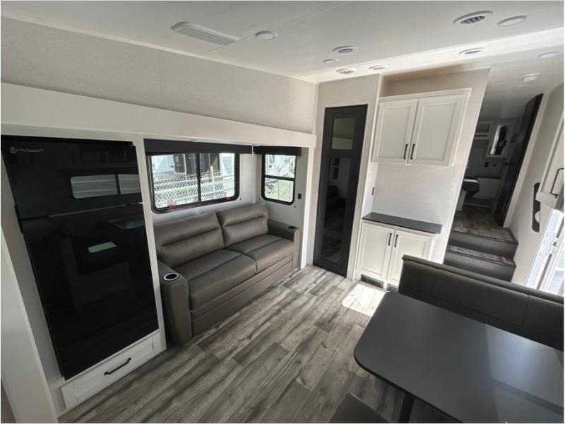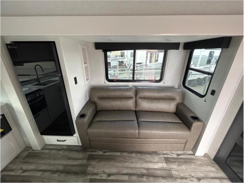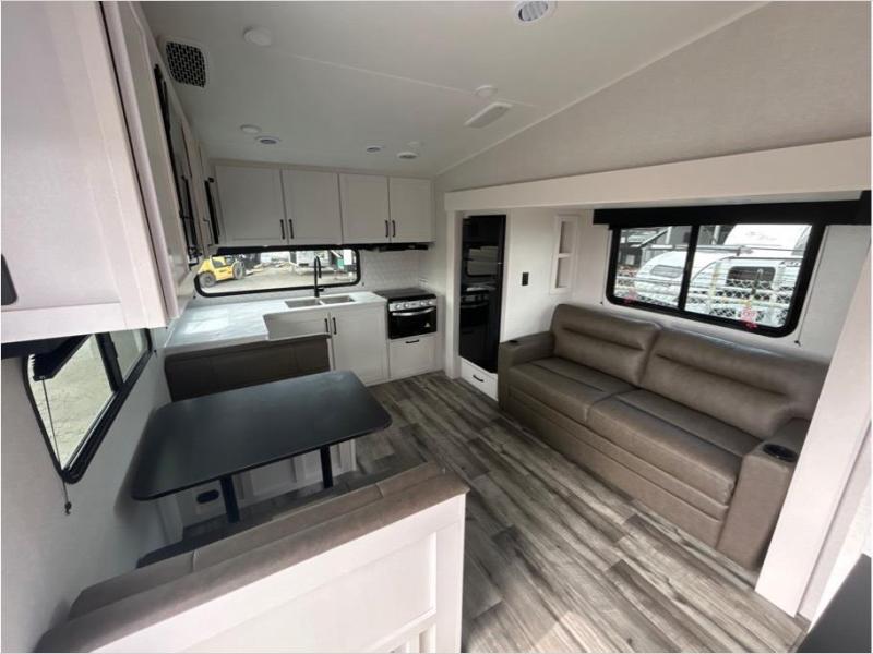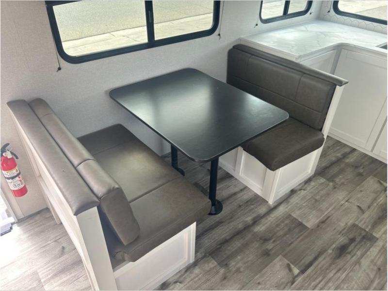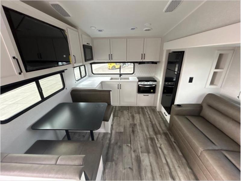 Pack your bags and head to the campground in this rear kitchen fifth wheel! There is ample counter space to prep meals, along with a range and over-the-range microwave. The booth dinette provides a place to dine together, and the tri-fold sofa will be the perfect place to relax in the evenings. There is also a Smart TV across from the sofa to make movie nights complete! The centrally located full bath includes a 30" x 36" shower with a skylight to give you more head room as you get ready each day, and the front private bedroom with a wardrobe slide gives you more space to get dressed in the morning. There is also a queen bed here, dual nightstands, TV prep, and additional storage for shoes and clothes!