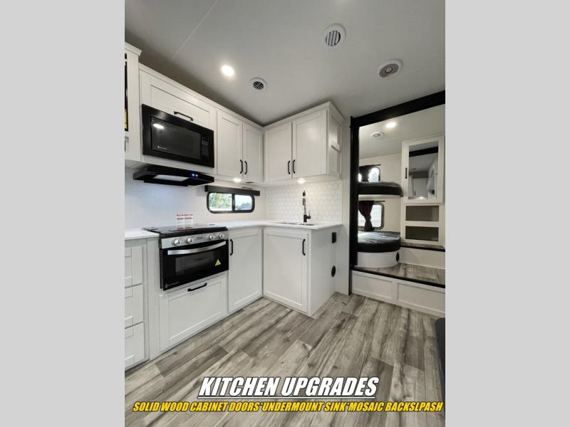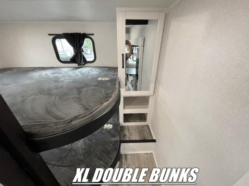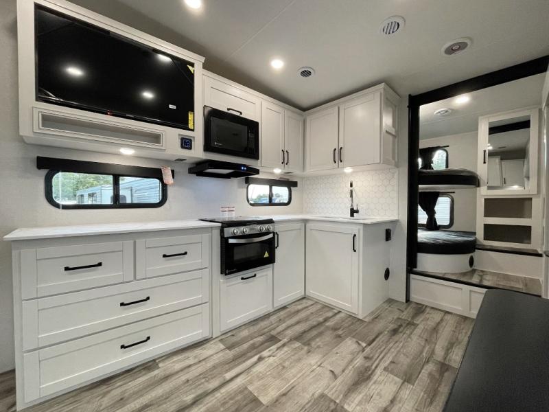 You can easily sleep ten in this fifth wheel, making it perfect for a family or larger group of friends! You can claim the front private bedroom with a queen bed for yourselves, while your guests take the rear double-size bunks. The combined kitchen and living area includes all the appliances needed to create meals each day, along with a U-shaped dinette and tri-fold sofa for extra seating and sleeping spaces. You will also find ample storage space throughout, including overhead cabinets, a bunkhouse wardrobe, bedroom storage, and four exterior storage compartments!