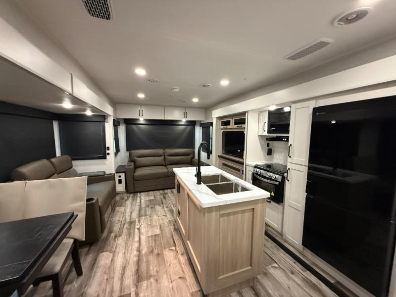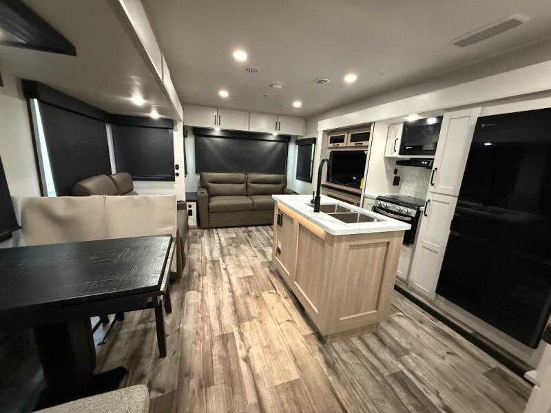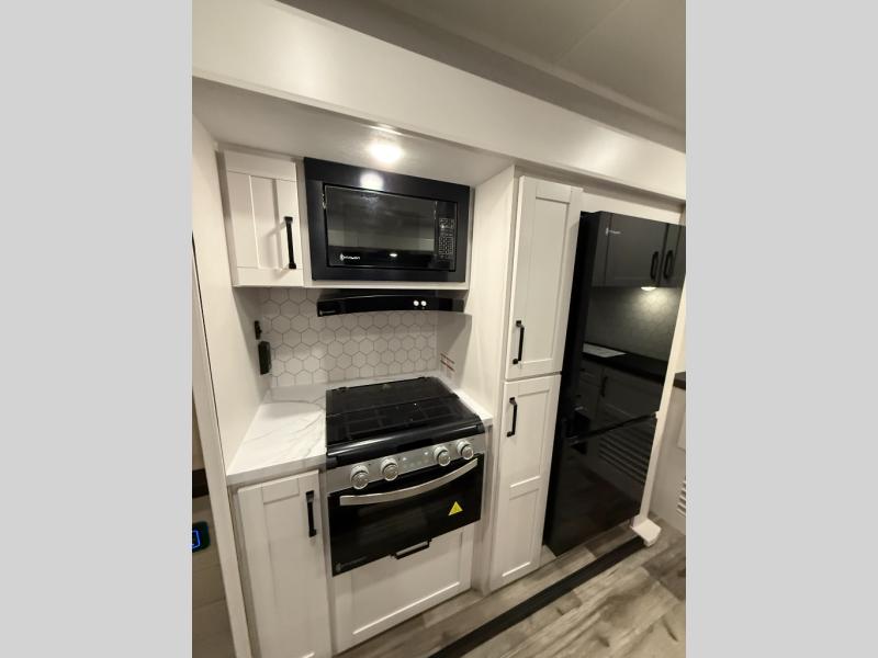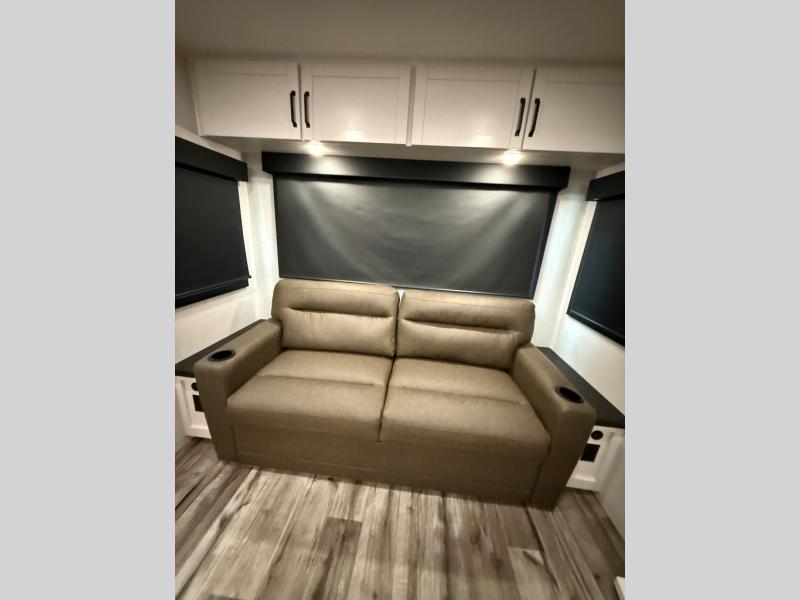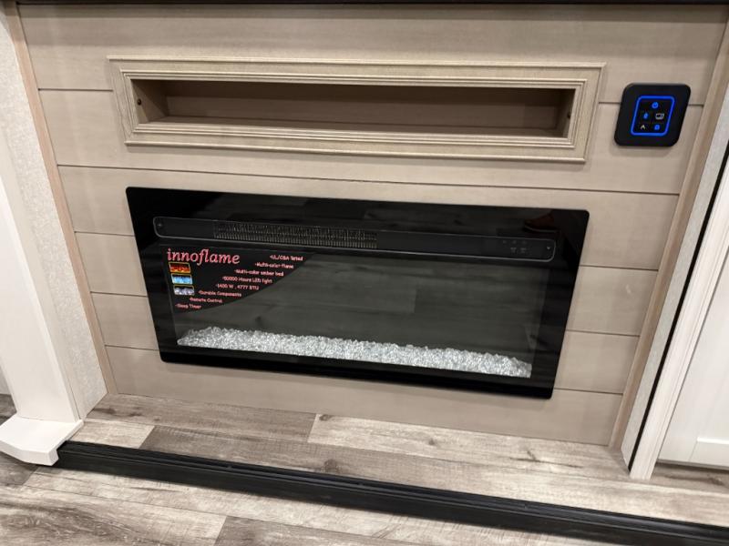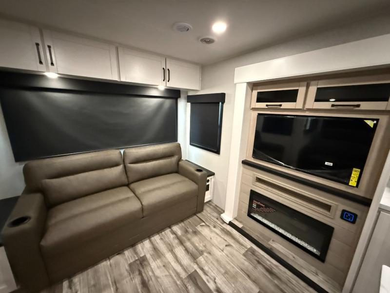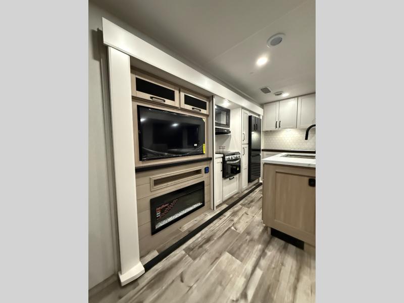 Your crew of four will love spending time at the campground in this travel trailer with a rear living area! Here, you can let your guests sleep on the tri-fold sofa, dine at the table and chairs with a bench, and relax on the theater seat, which is directly across from the entertainment center with a fireplace. The chef of your group will love the kitchen island for more prep space, plus a 12V refrigerator, pantry and hutch for extra storage. The full bath is spacious, allowing you plenty of space to freshen up each day, and the front private bedroom with an Olympic queen bed is sure to bring a great night's rest. And the bedroom includes a wardrobe with washer and dryer prep if you want to add these appliances!
