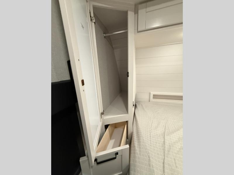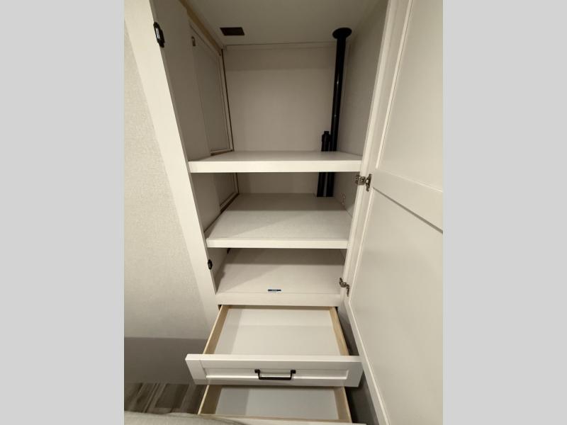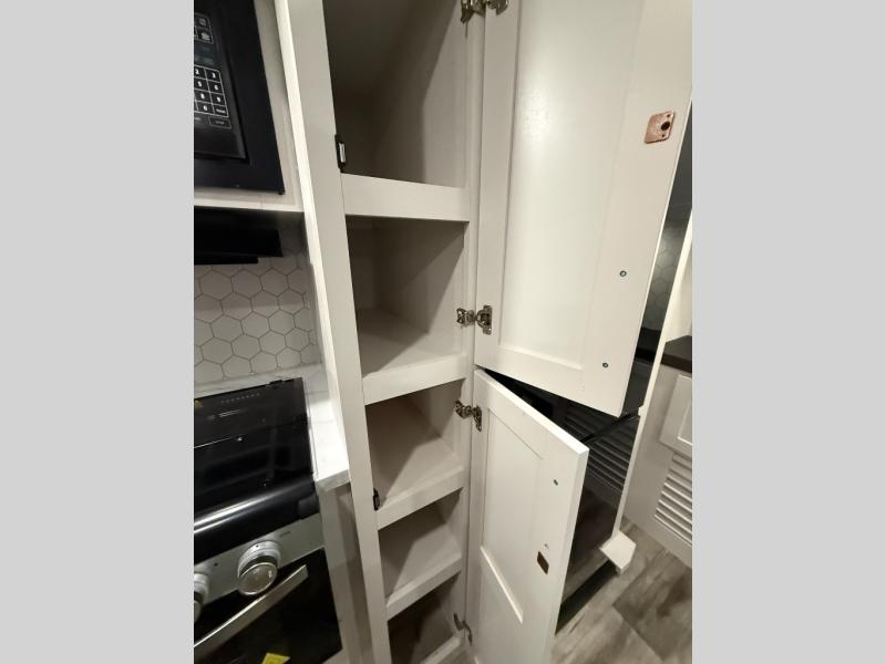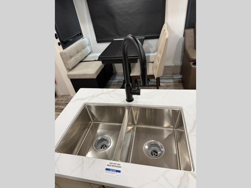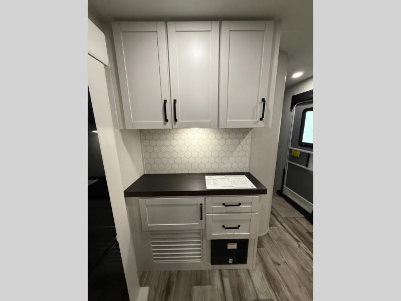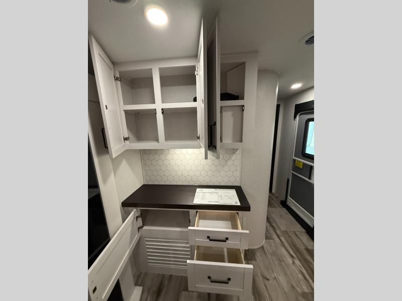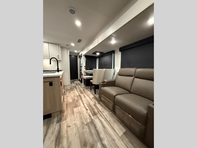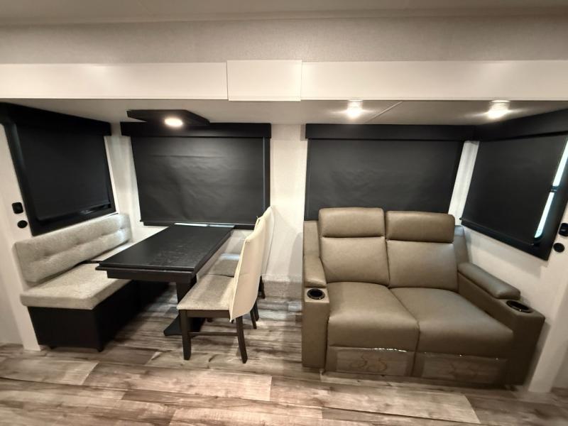 Your crew of four will love spending time at the campground in this travel trailer with a rear living area! Here, you can let your guests sleep on the tri-fold sofa, dine at the table and chairs with a bench, and relax on the theater seat, which is directly across from the entertainment center with a fireplace. The chef of your group will love the kitchen island for more prep space, plus a 12V refrigerator, pantry and hutch for extra storage. The full bath is spacious, allowing you plenty of space to freshen up each day, and the front private bedroom with an Olympic queen bed is sure to bring a great night's rest. And the bedroom includes a wardrobe with washer and dryer prep if you want to add these appliances!