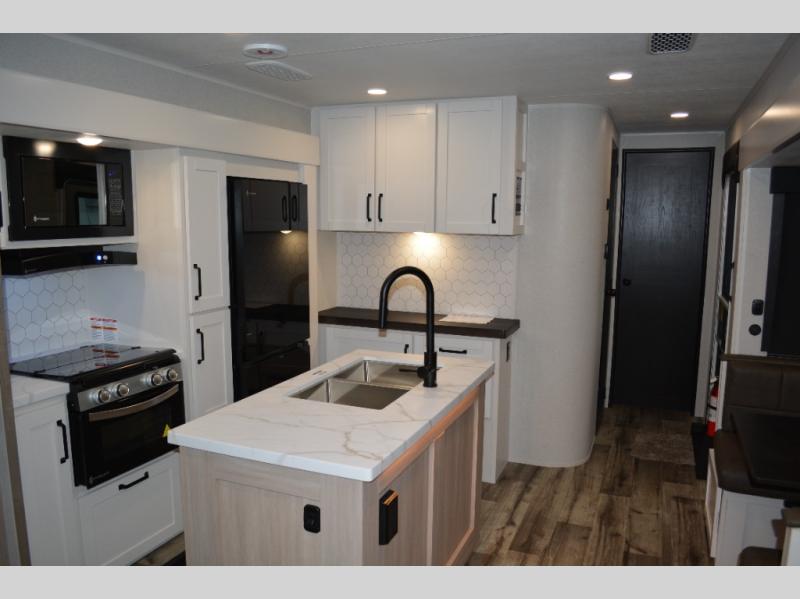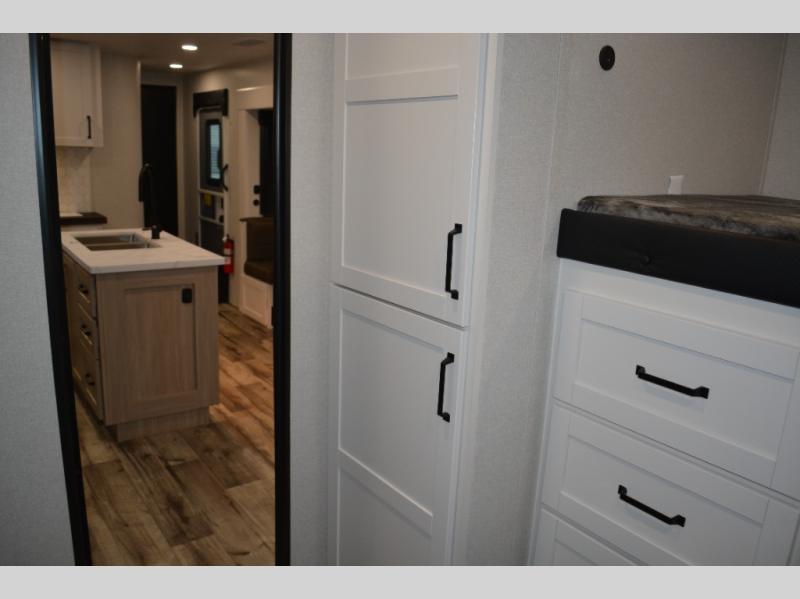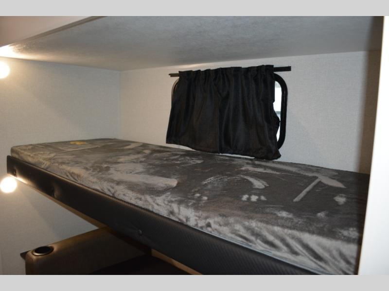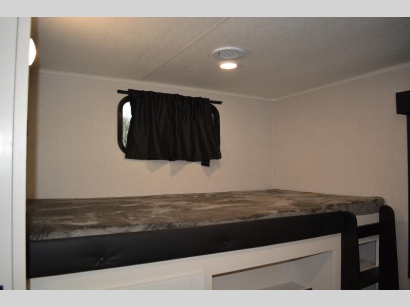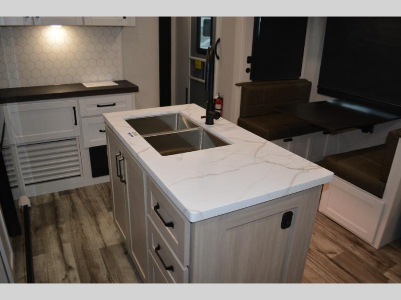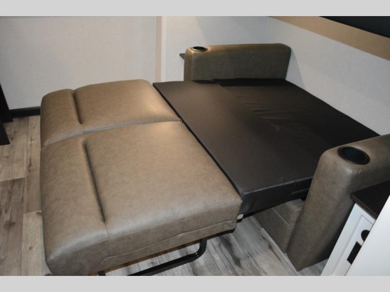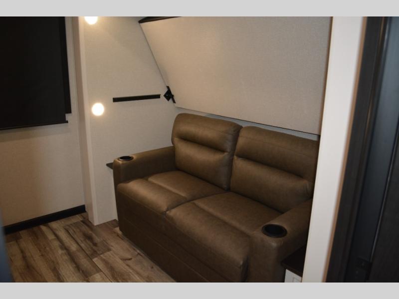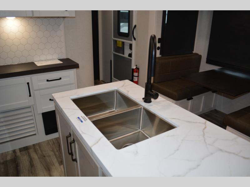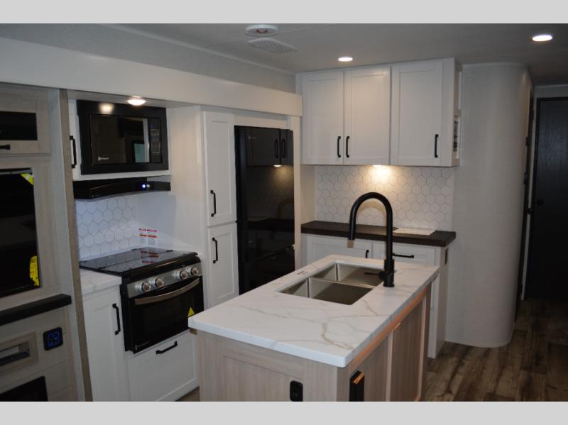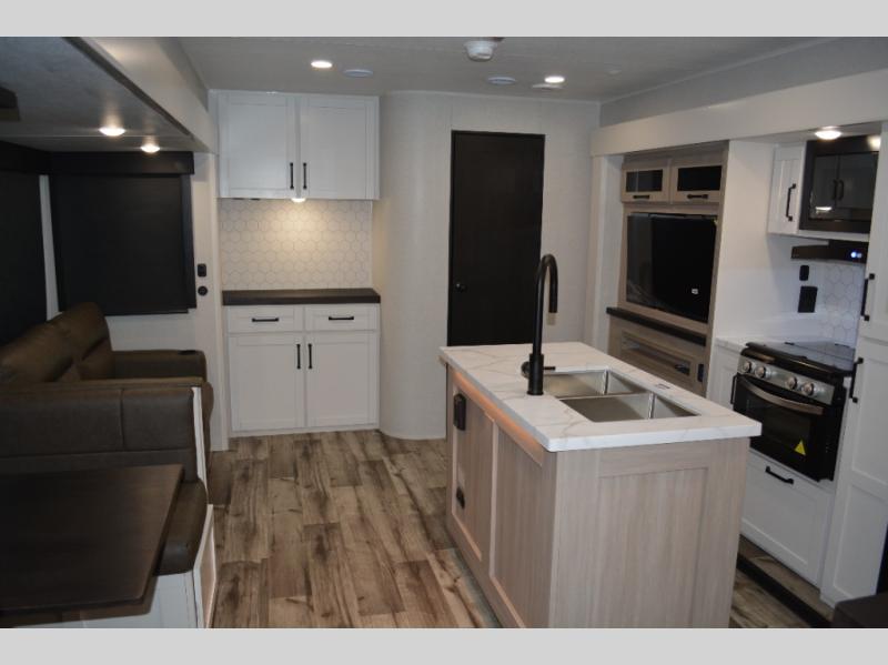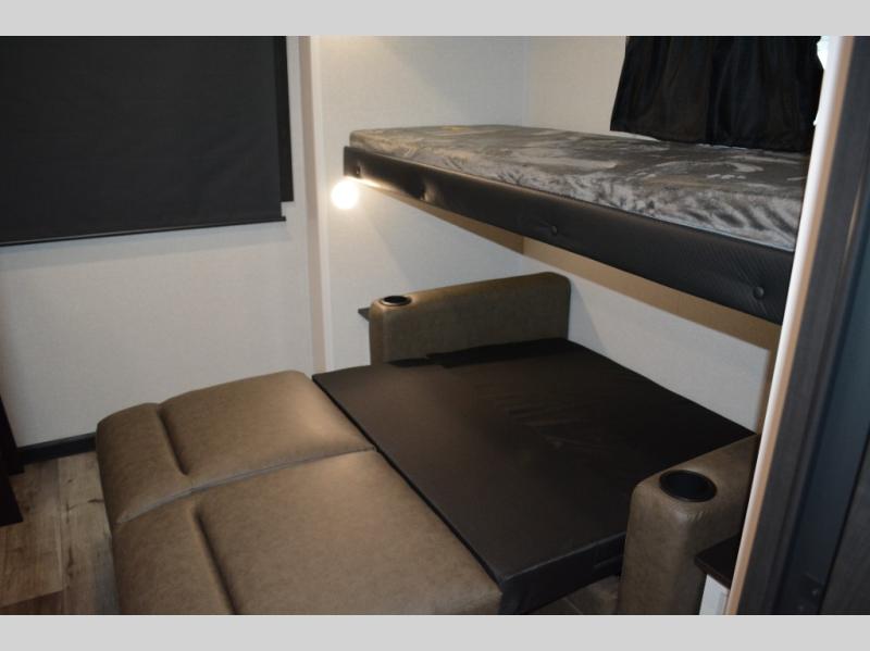 If you enjoy camping with a large group, this travel trailer is for you! There is a rear private bunkhouse with a bunk above a wardrobe and TV prep, with a tri-fold sofa and flip-up top bunk across the room. The combined kitchen and living area includes dual opposing slides for more space, a booth dinette, and a tri-fold sofa for even more seating and sleeping options. The chef of your group will love the kitchen island with a multi-functional sink, plus a 12V refrigerator, pantry and hutch for extra storage. The full bath is spacious, allowing you plenty of space to freshen up each day, and the front private bedroom with an Olympic queen bed is sure to bring a great night's rest. And the bedroom includes a wardrobe with washer and dryer prep if you want to add these appliances!