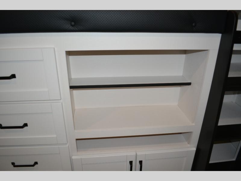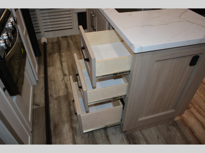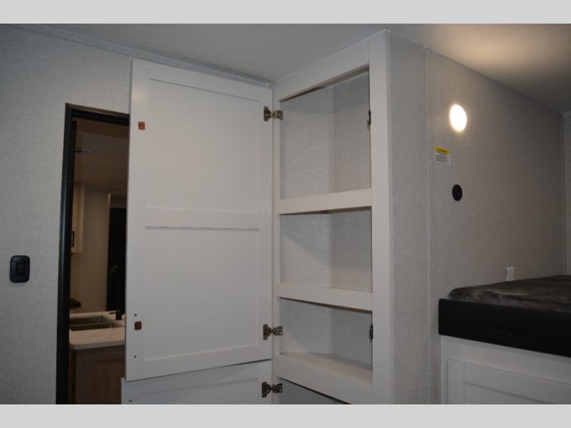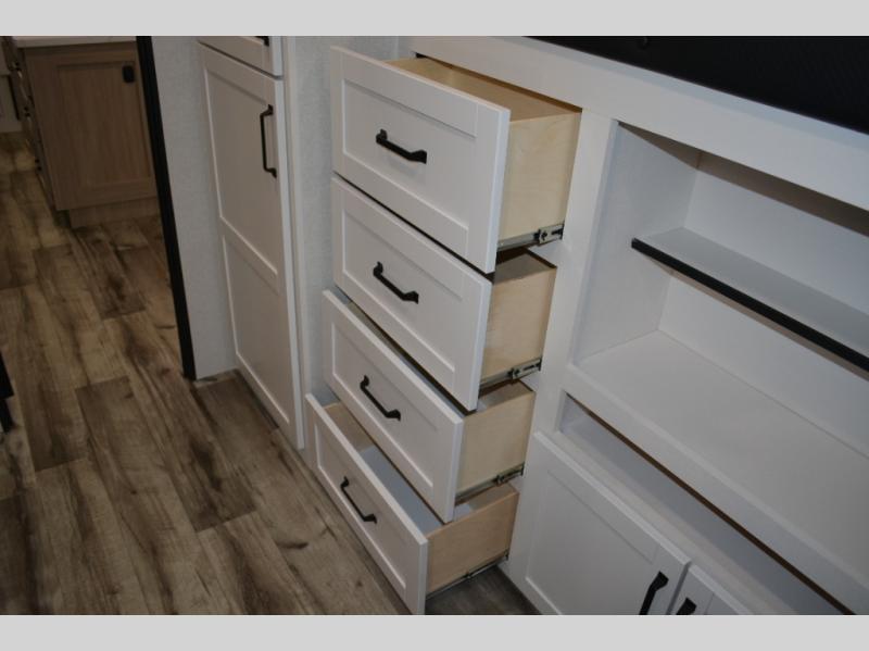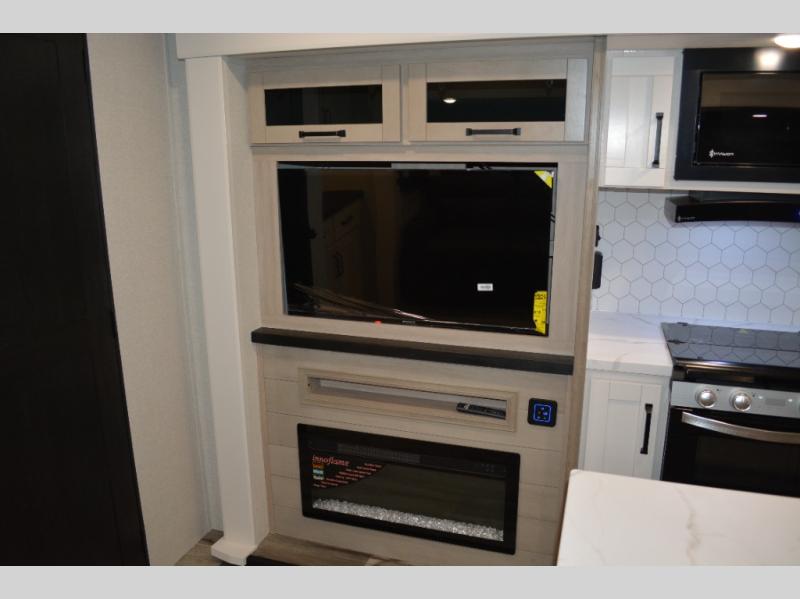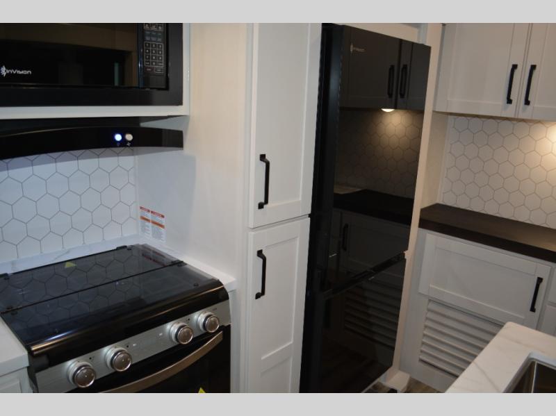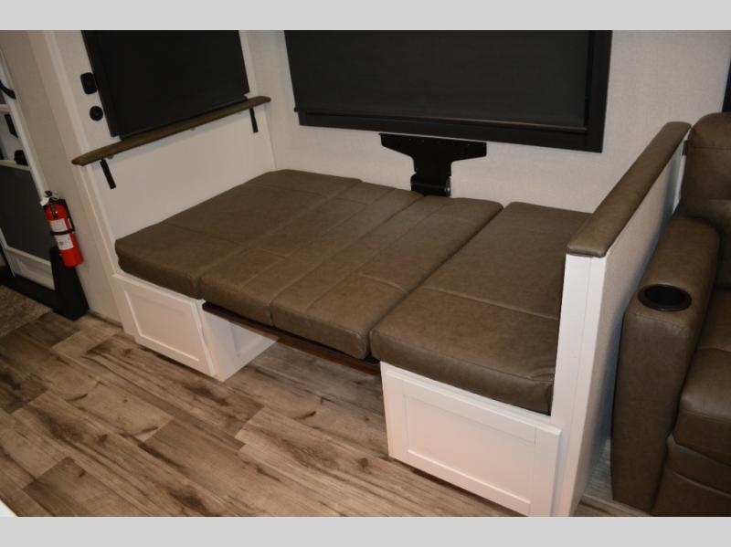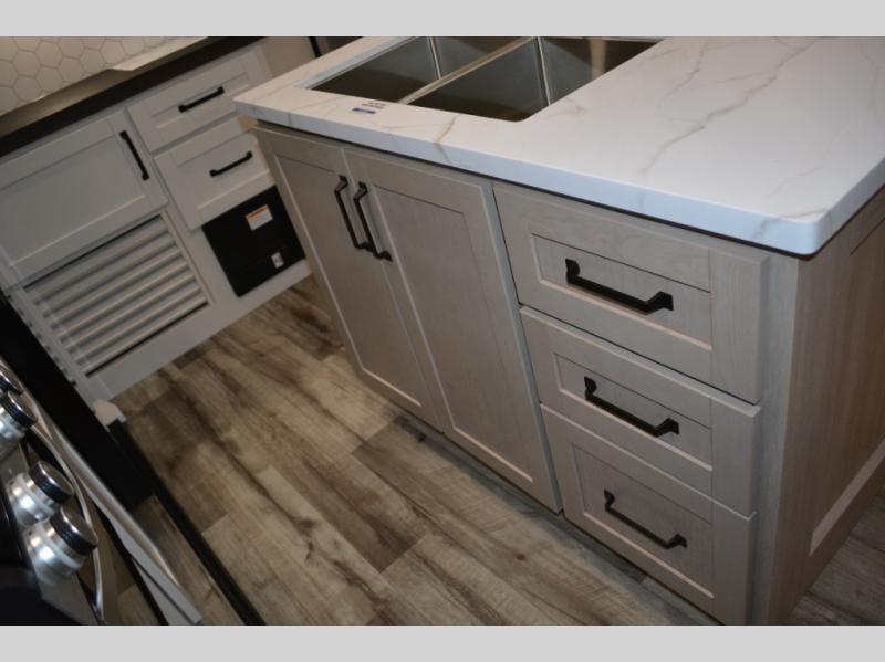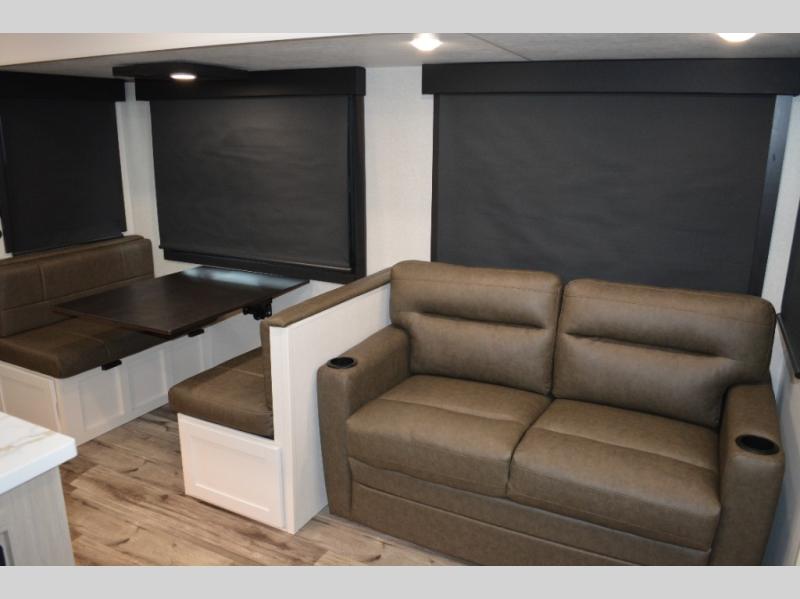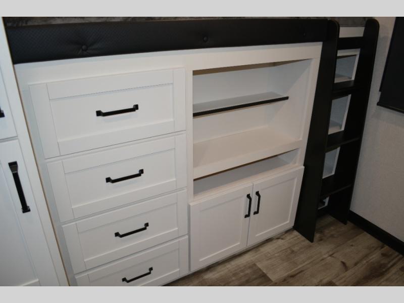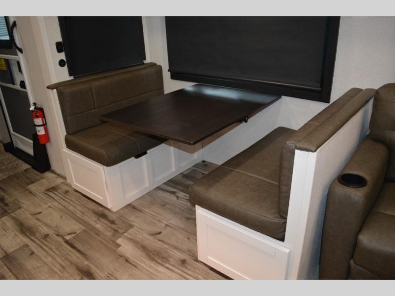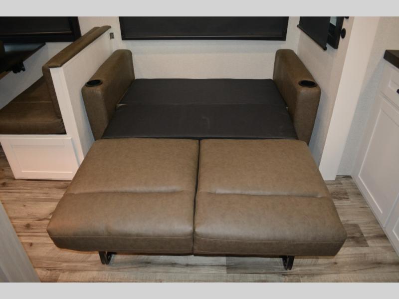 If you enjoy camping with a large group, this travel trailer is for you! There is a rear private bunkhouse with a bunk above a wardrobe and TV prep, with a tri-fold sofa and flip-up top bunk across the room. The combined kitchen and living area includes dual opposing slides for more space, a booth dinette, and a tri-fold sofa for even more seating and sleeping options. The chef of your group will love the kitchen island with a multi-functional sink, plus a 12V refrigerator, pantry and hutch for extra storage. The full bath is spacious, allowing you plenty of space to freshen up each day, and the front private bedroom with an Olympic queen bed is sure to bring a great night's rest. And the bedroom includes a wardrobe with washer and dryer prep if you want to add these appliances!