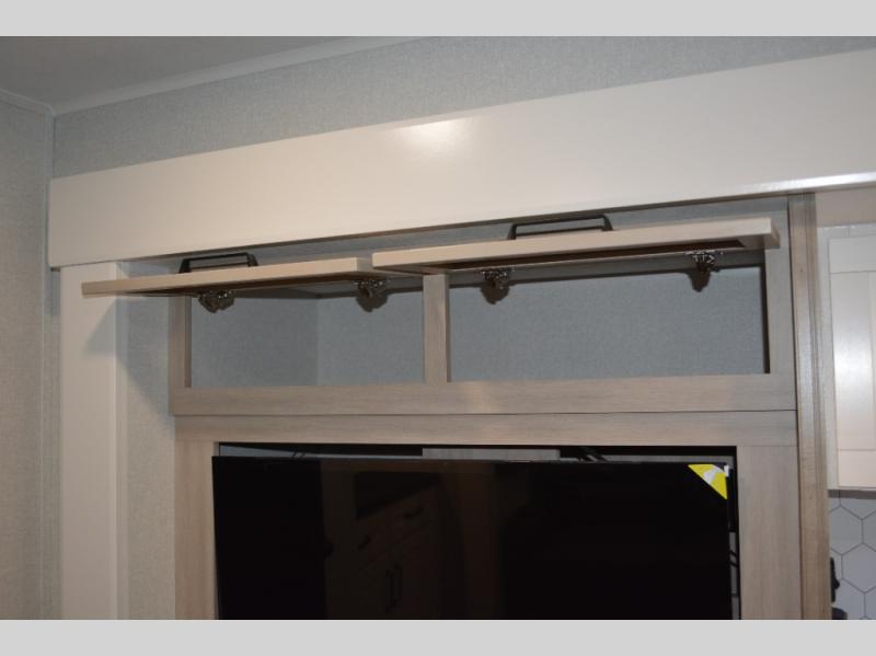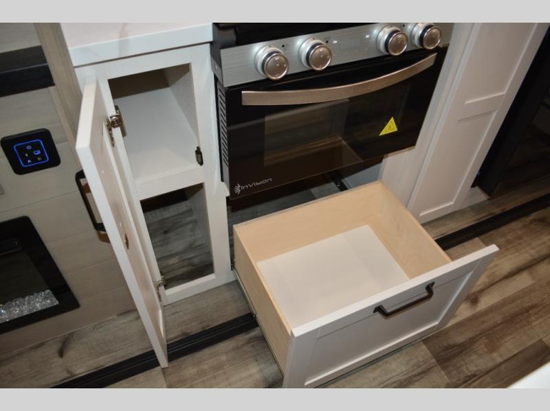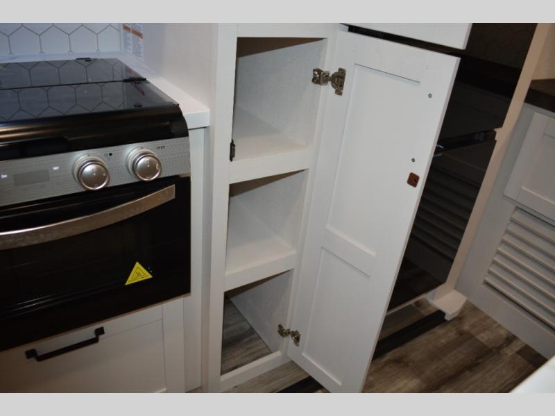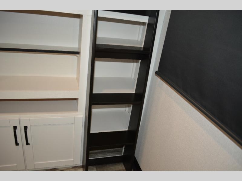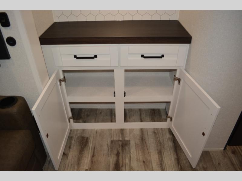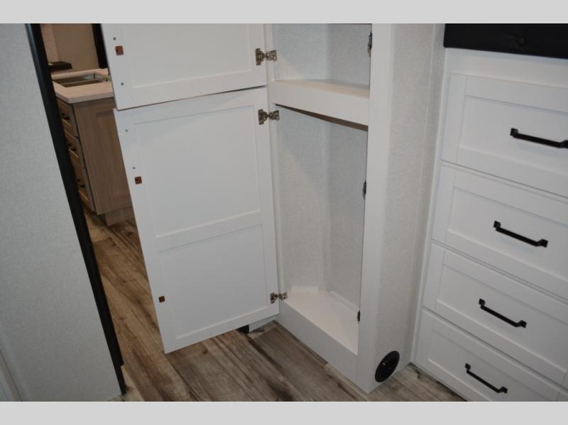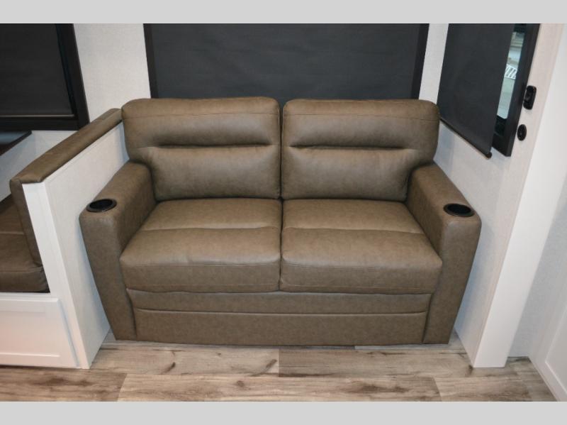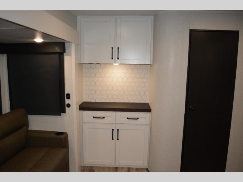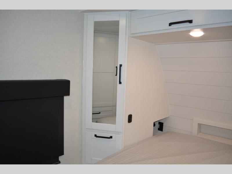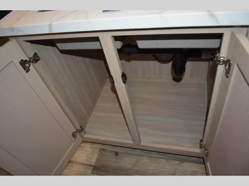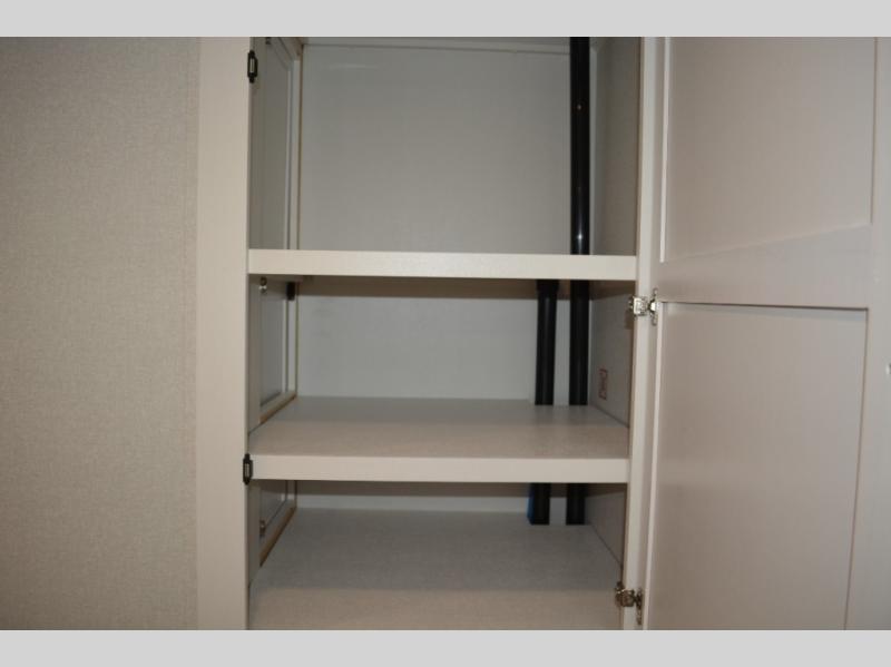 If you enjoy camping with a large group, this travel trailer is for you! There is a rear private bunkhouse with a bunk above a wardrobe and TV prep, with a tri-fold sofa and flip-up top bunk across the room. The combined kitchen and living area includes dual opposing slides for more space, a booth dinette, and a tri-fold sofa for even more seating and sleeping options. The chef of your group will love the kitchen island with a multi-functional sink, plus a 12V refrigerator, pantry and hutch for extra storage. The full bath is spacious, allowing you plenty of space to freshen up each day, and the front private bedroom with an Olympic queen bed is sure to bring a great night's rest. And the bedroom includes a wardrobe with washer and dryer prep if you want to add these appliances!