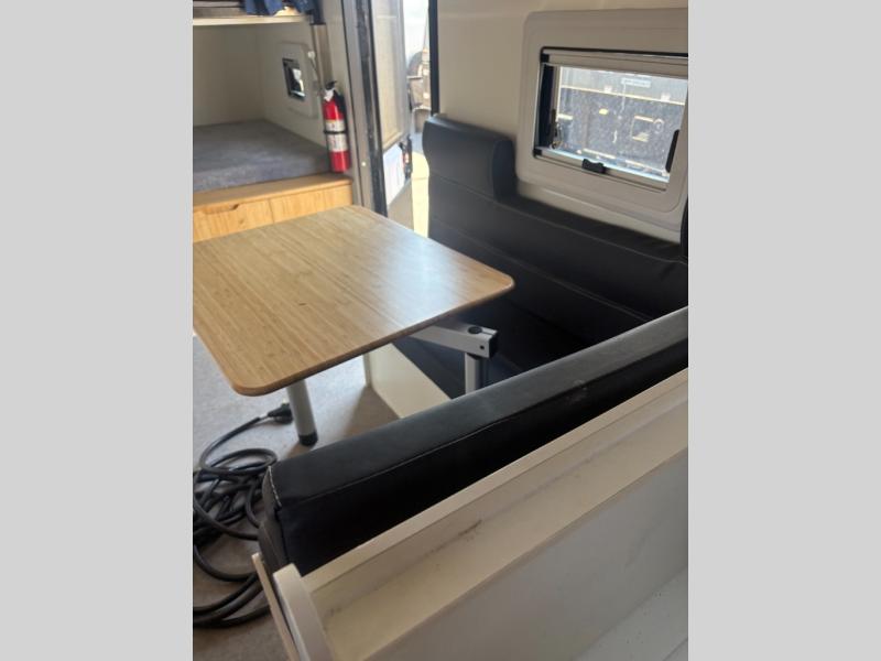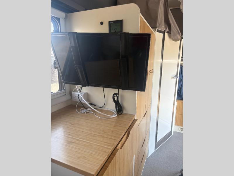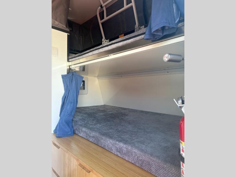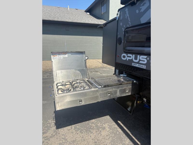 With this OPUS travel trailer, you will enjoy the luxurious interior cabin including leatherette dining, a full-size bamboo wardrobe, and a shower/toilet combo to freshen up after exploring outside. Stay cool or warm with the Truma heater and hot water system and the 13,500 BTU air conditioner as you sleep on the king-size bed, the bunk beds, or the lounge which will sleep one more. The cook can make breakfast on the exterior stainless steel kitchen slide with a four-burner stovetop, a chopping board, plus more. And the 12V refrigerator will keep your leftovers and drinks cool. There is storage inside for your clothing and such as well as outside for your outdoor gear, and the expanding roof is a bonus feature for more head room.