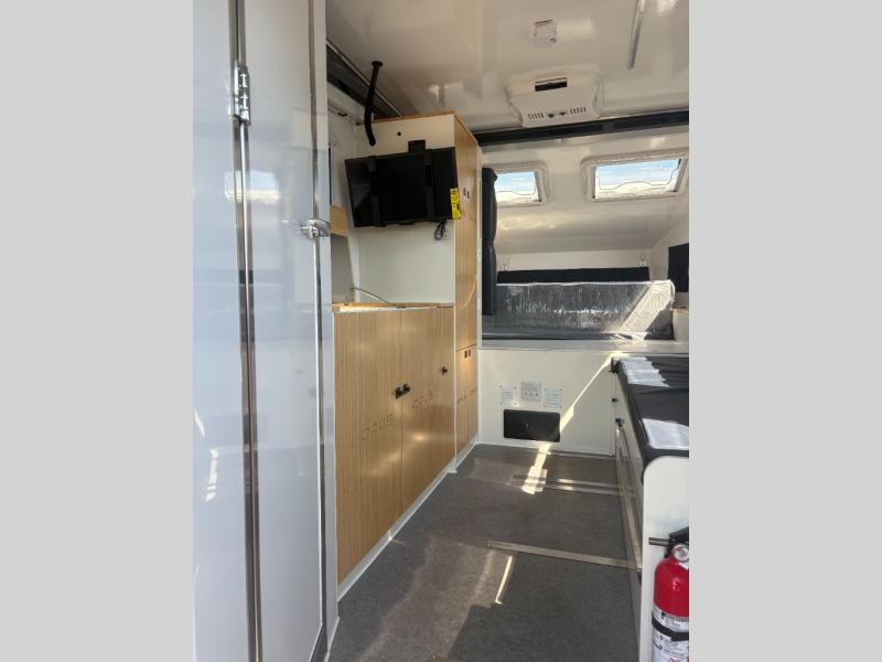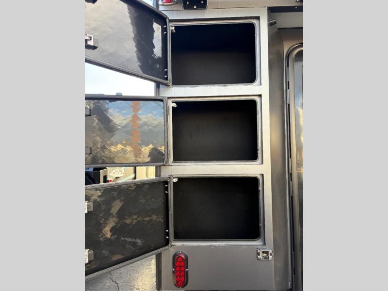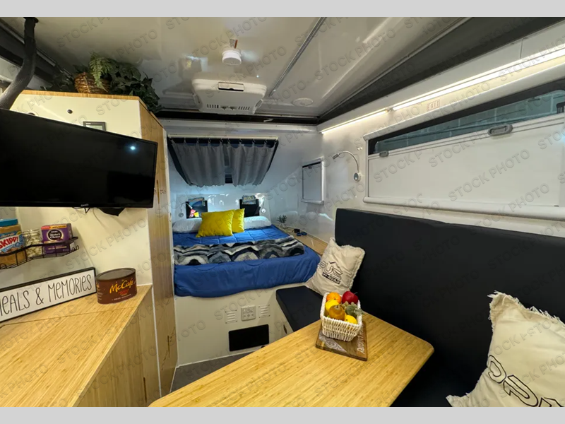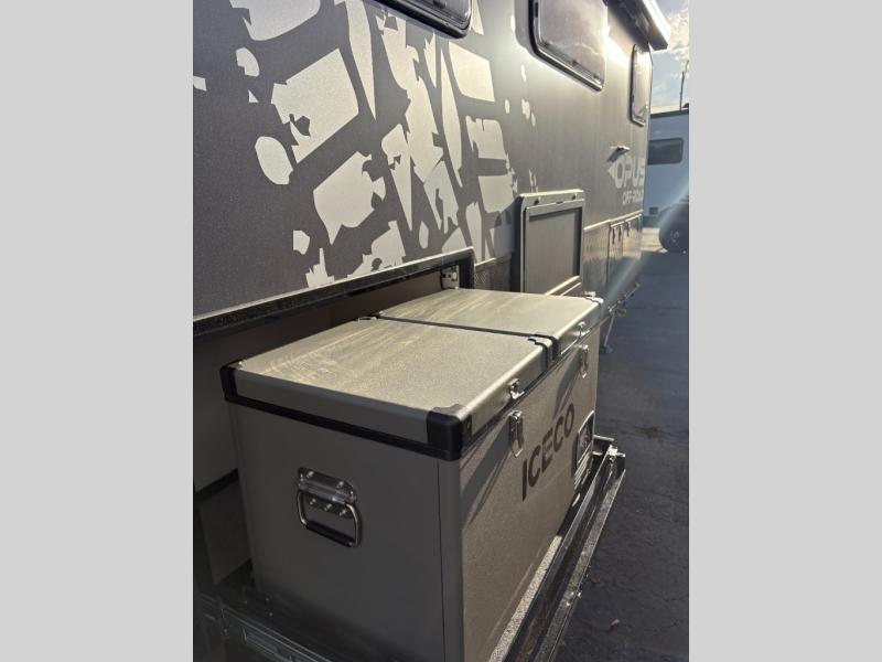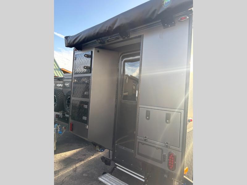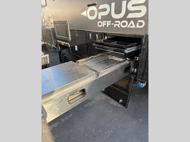 The largest travel trailer in the OPUS lineup, this unit is the way to go for more space, power, and off-grid capabilities! There is an impressive 600-watt solar panel set up plus four 100ah lithium batteries and two 20 lb. LP tanks. The interior kitchen includes a two burner propane stove and a hot water sink, and the outdoor kitchen includes a four burner stove, a pantry, sink, and more! You will sleep soundly each night on the queen-size bed, and optional bunk beds can be added if you need more sleeping space.