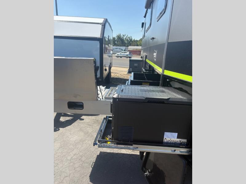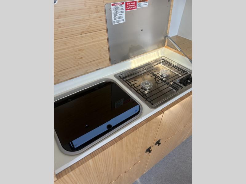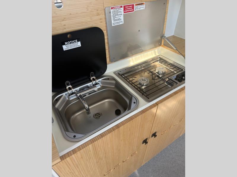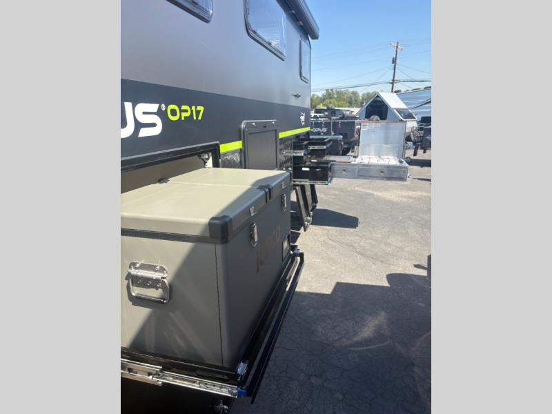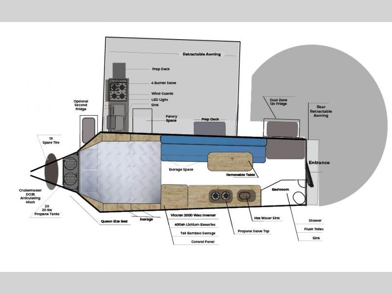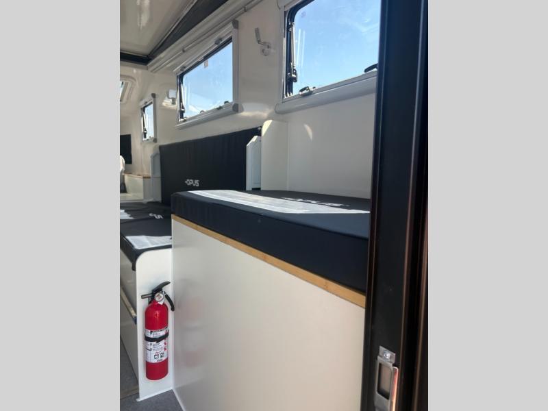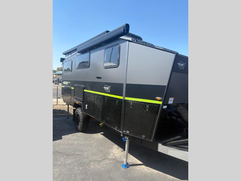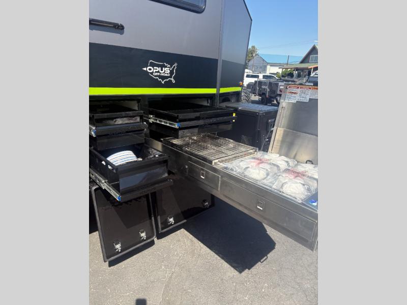 The largest travel trailer in the OPUS lineup, this unit is the way to go for more space, power, and off-grid capabilities! There is an impressive 600-watt solar panel set up plus four 100ah lithium batteries and two 20 lb. LP tanks. The interior kitchen includes a two burner propane stove and a hot water sink, and the outdoor kitchen includes a four burner stove, a pantry, sink, and more! You will sleep soundly each night on the queen-size bed, and optional bunk beds can be added if you need more sleeping space.