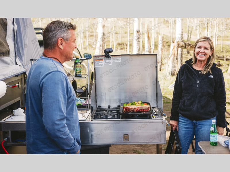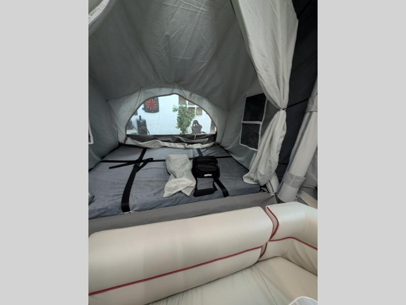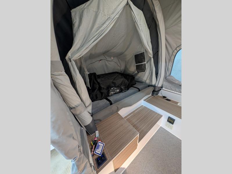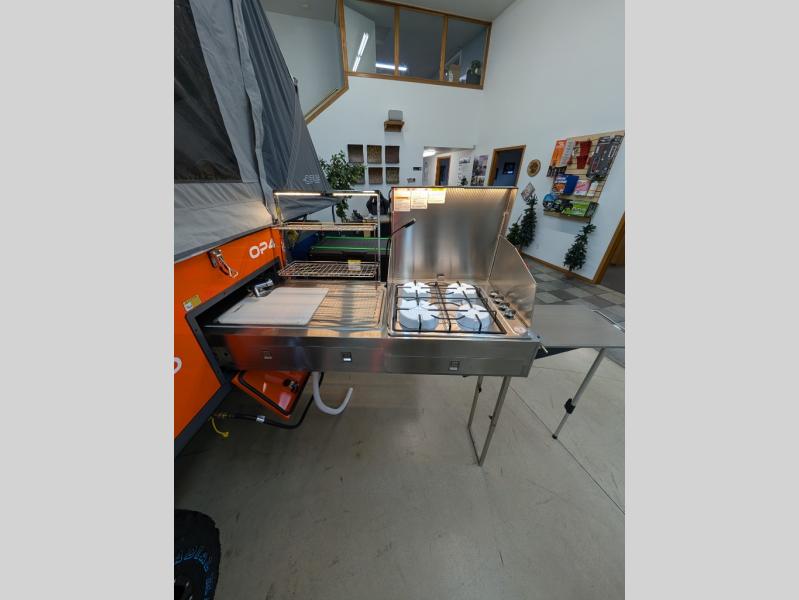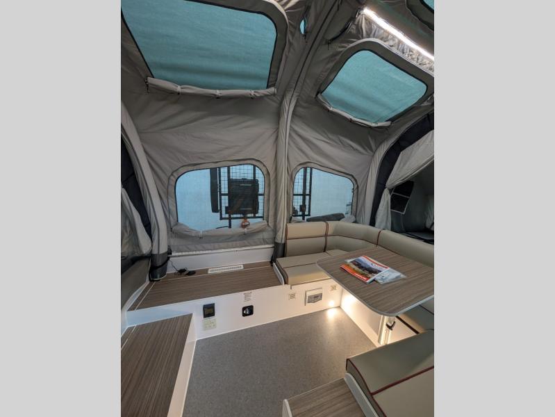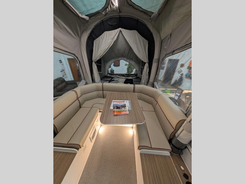 From the rapid deployment of the AIR inflation technology, the tent on this OPUS folding pop-up camper is easily ready in ninety seconds, and all you have to do is open and secure the two double-size tent beds and turn on the switch. You will experience more storage than you thought could be found in a pop-up and on-board water. The cook can whip up a warm meal on the four-burner cooktop within the outside stainless steel kitchen which includes a stainless steel chopping board and pantry at arm's reach, and then you can dine at the U-shaped leatherette lounge that can easily be converted into extra sleeping space for two. There are several windows to open up your space to enjoy the weather, and there are several options to customize your OPUS just like you want.