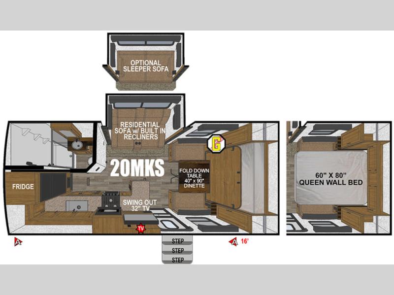 This versatile travel trailer is the perfect couple's unit! There is a front queen wall bed that can be put up each morning so you can dine at the fold down table/dinette. The full kitchen with a three-burner range and 12V refrigerator will let you make meals each day, and the residential sofa with built-in recliners are within a slide out for more space and comfort! And the sofa is in perfect view of the 32" swing-out TV! You can relax outdoors in the evenings under the 16' awning, then head inside to wash up in the full bath before bed!