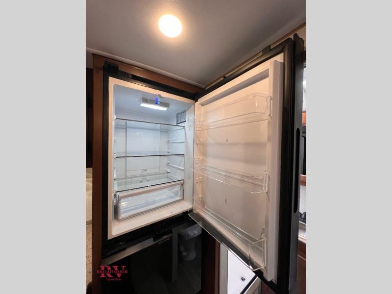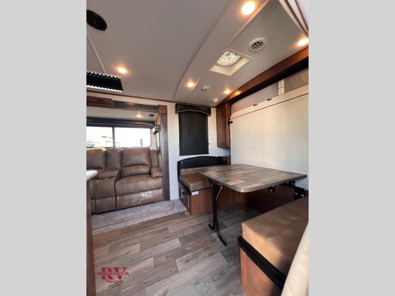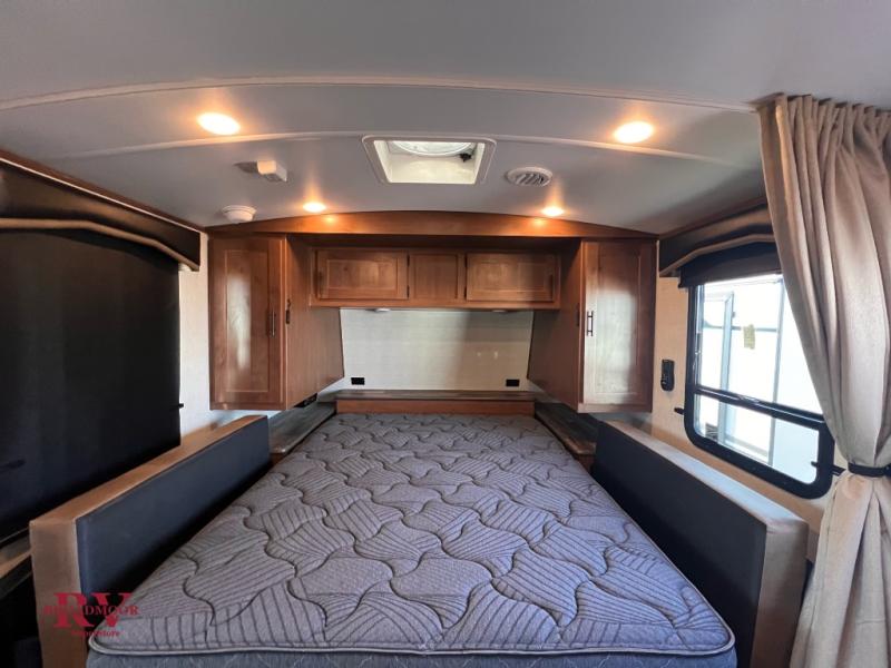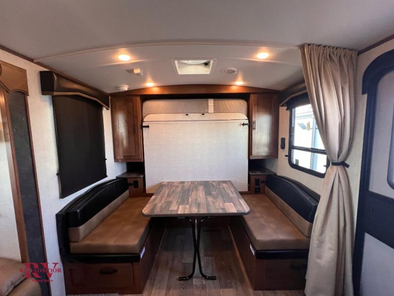 This versatile travel trailer is the perfect couple's unit! There is a front queen wall bed that can be put up each morning so you can dine at the fold down table/dinette. The full kitchen with a three-burner range and 12V refrigerator will let you make meals each day, and the residential sofa with built-in recliners are within a slide out for more space and comfort! And the sofa is in perfect view of the 32" swing-out TV! You can relax outdoors in the evenings under the 16' awning, then head inside to wash up in the full bath before bed!
