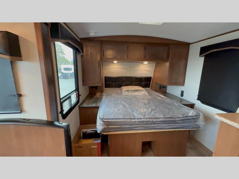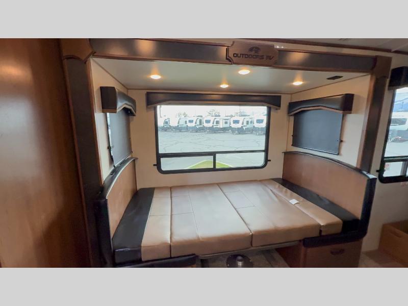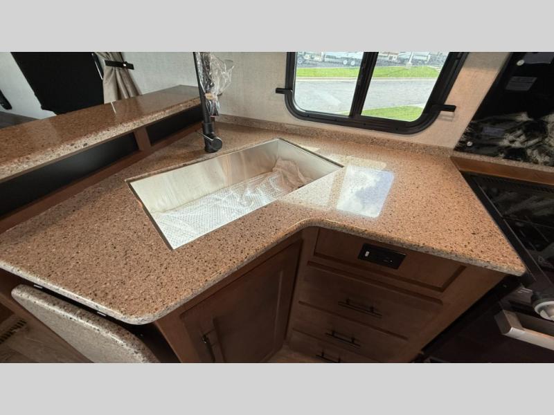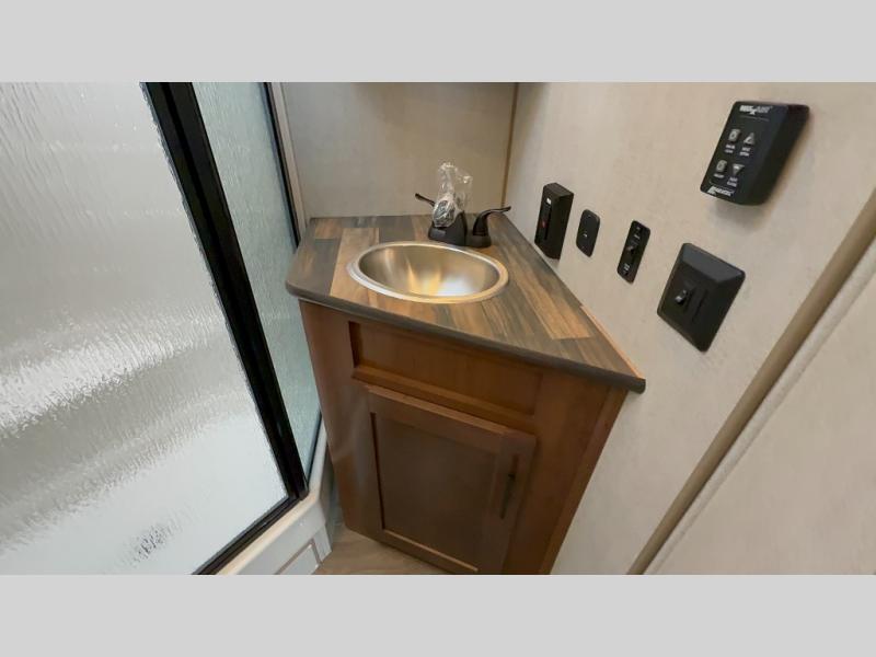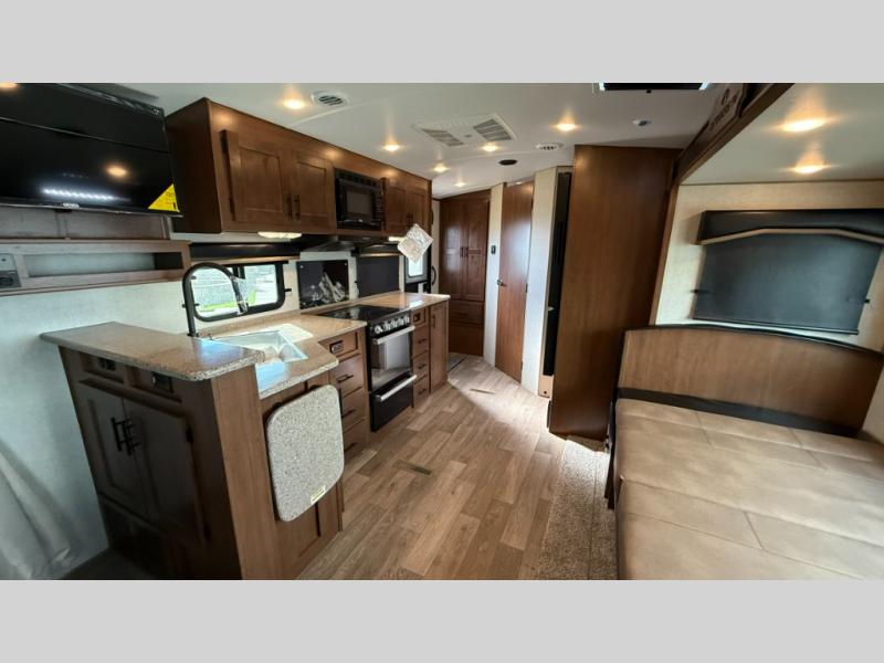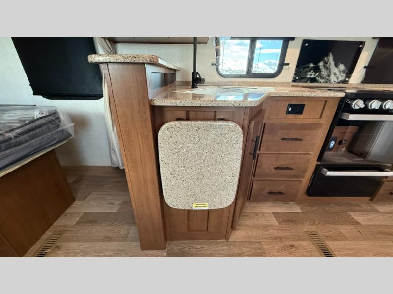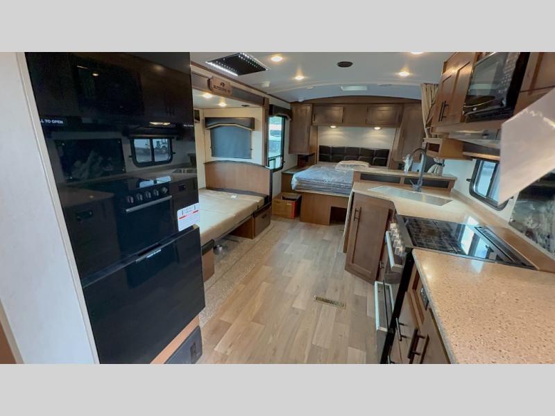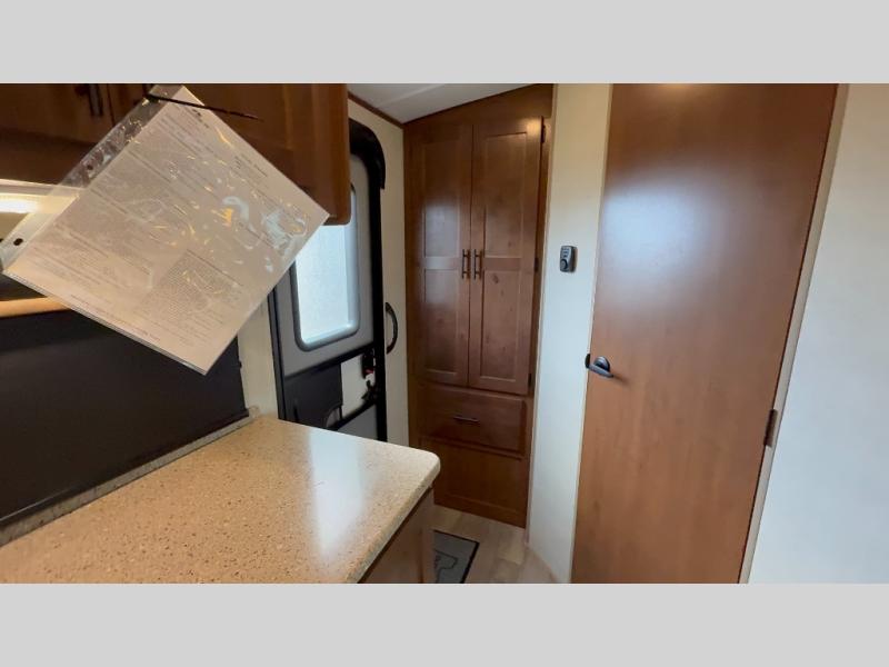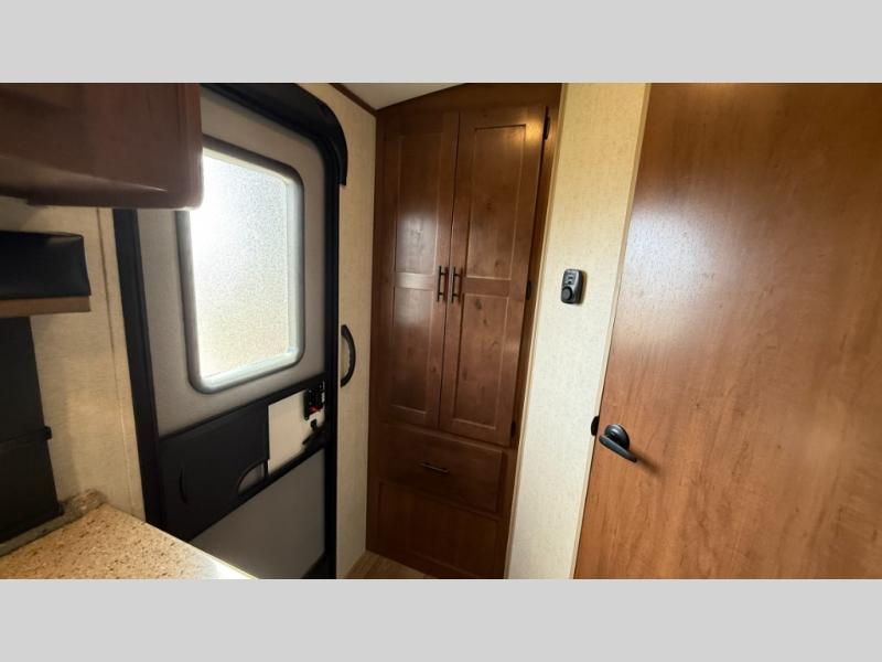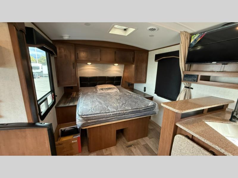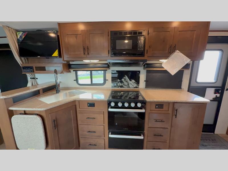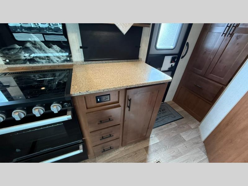 This is the perfect adventurist travel trailer with off-road and off-grid capability, plus the queen bed up front sleeps two and allows you to rest up after all the fun outdoors! You will find storage on each side as well as USB ports to keep your iPad and cell phones charged. The swing-out 32" TV can be viewed from pretty much anywhere giving you inside entertainment, and the mountain dinette slide out offers dining and sleeping space plus more interior floor space to move about. The cook can make meals in the galley kitchen with a flip-up counter, and everyone will stay refreshed with the full bathroom in the rear corner next to the handy entry closet.