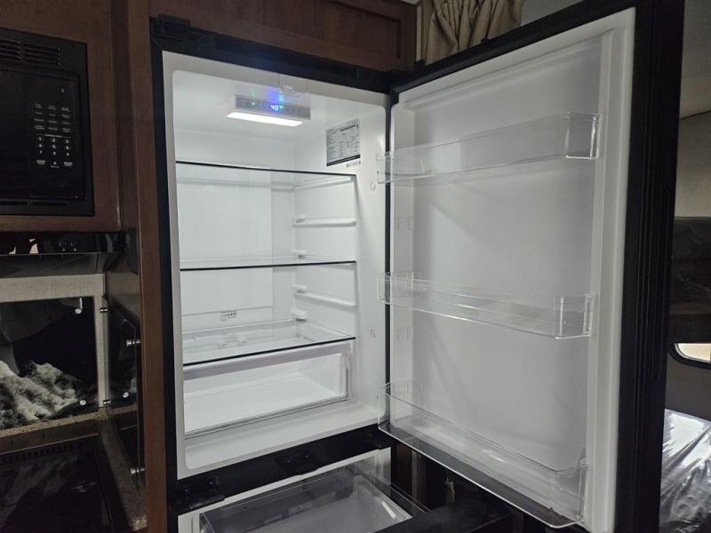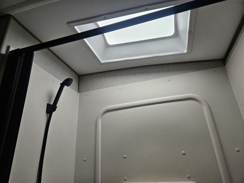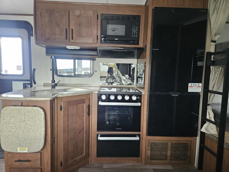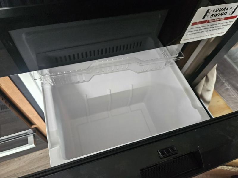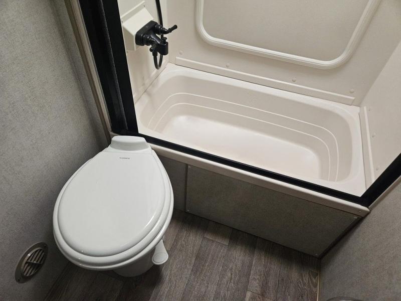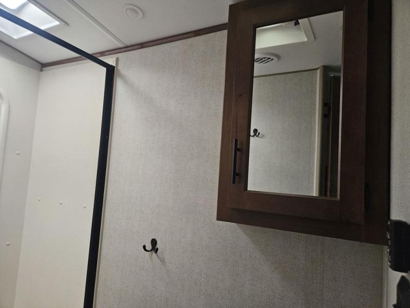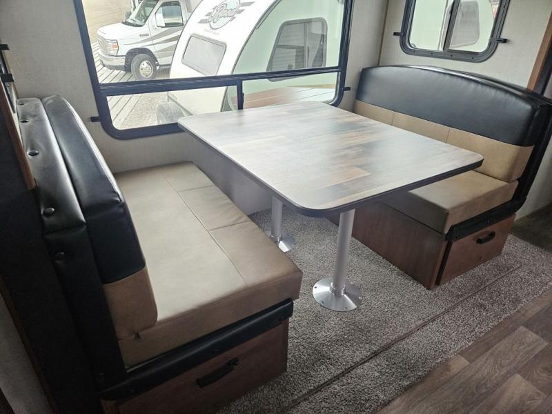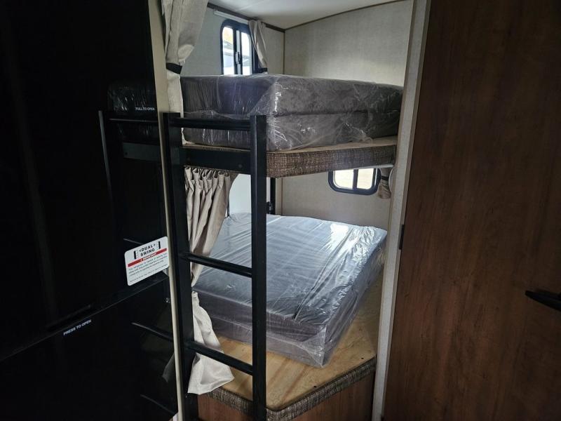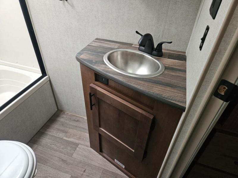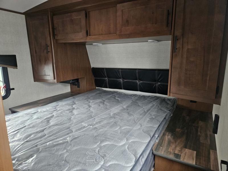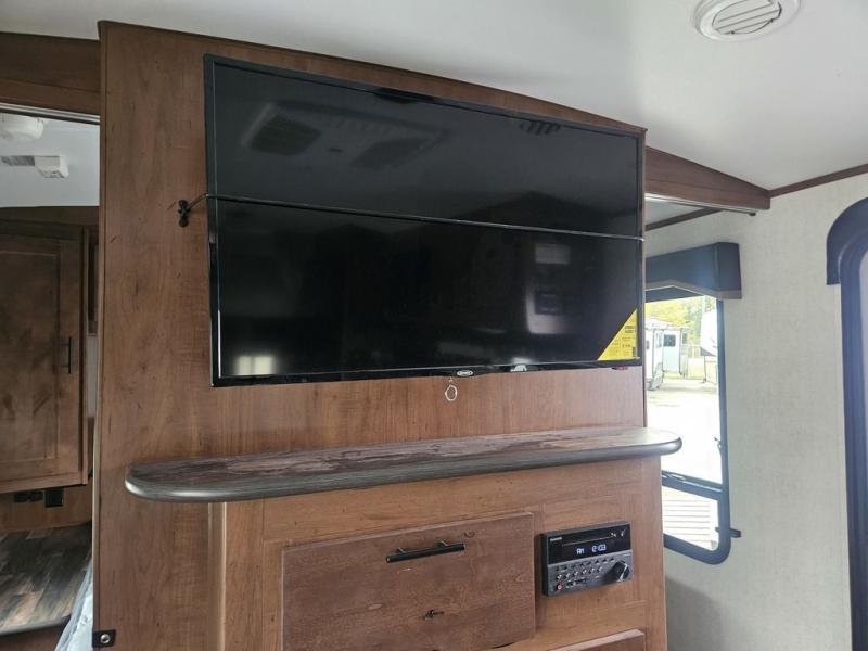 You will have everything you need for a comfortable camping trip in this travel trailer! The front private bedroom has a queen bed with wardrobes on either side to keep your clothes out of the way. There is a set of 50" x 74" bunk beds with a garage storage door and next to the rear corner bathroom. The chef can either prepare their best home cooked meals indoors with the sunken range, flip-up counter, and 12V fridge, or head to the exterior pull-out kitchen. Enjoy your meals at the 45" x 84" mountain dinette slide while a show plays on the swing out 40" TV at the entertainment center.