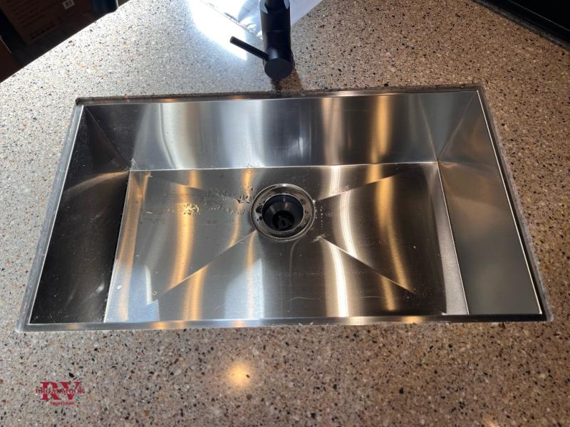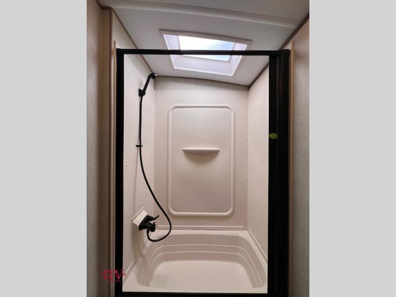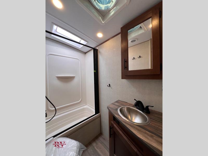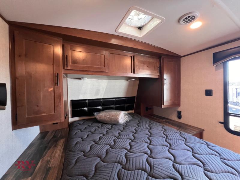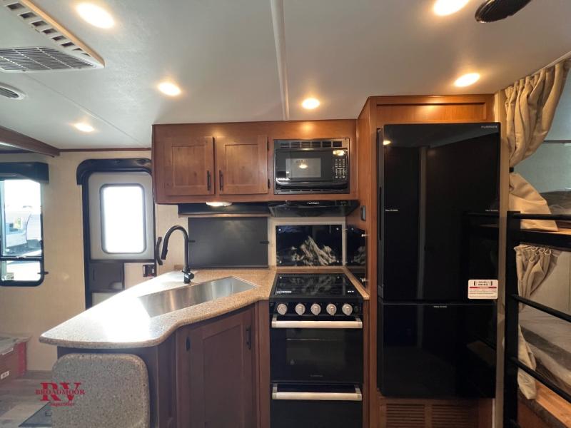 You will have everything you need for a comfortable camping trip in this travel trailer! The front private bedroom has a queen bed with wardrobes on either side to keep your clothes out of the way. There is a set of 50" x 74" bunk beds with a garage storage door and next to the rear corner bathroom. The chef can either prepare their best home cooked meals indoors with the sunken range, flip-up counter, and 12V fridge, or head to the exterior pull-out kitchen. Enjoy your meals at the 45" x 84" mountain dinette slide while a show plays on the swing out 40" TV at the entertainment center.