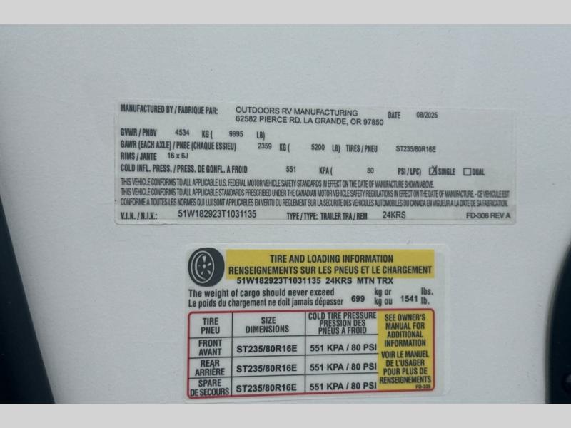 Outdoors RV Back Country Series MTN TRX travel trailer 24KRS highlights:
