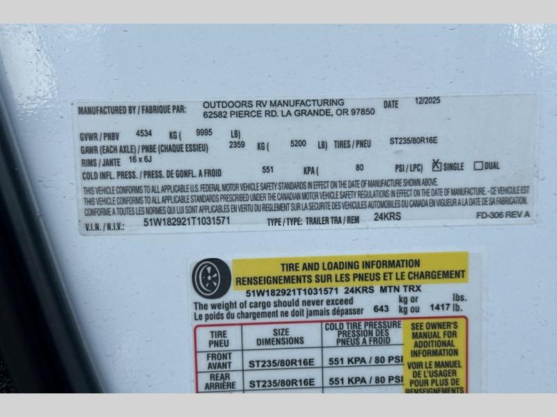 Outdoors RV Back Country Series MTN TRX travel trailer 24KRS highlights: