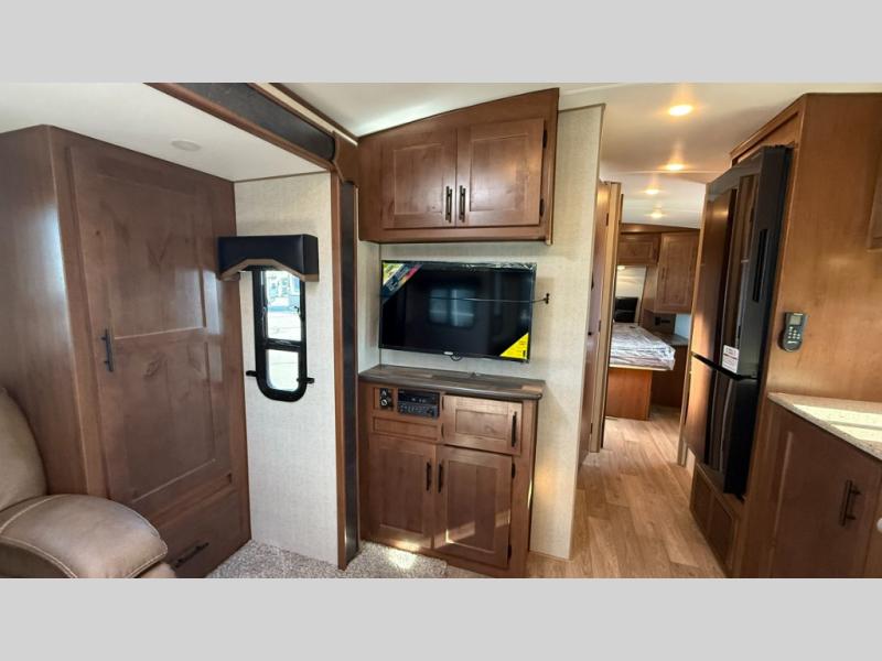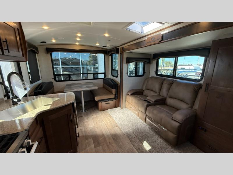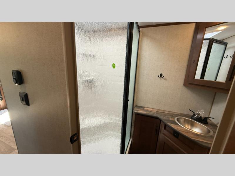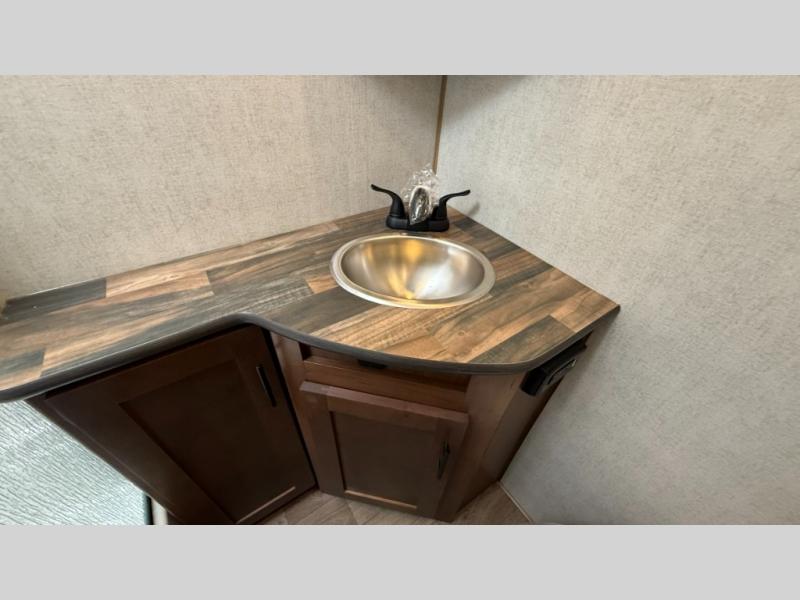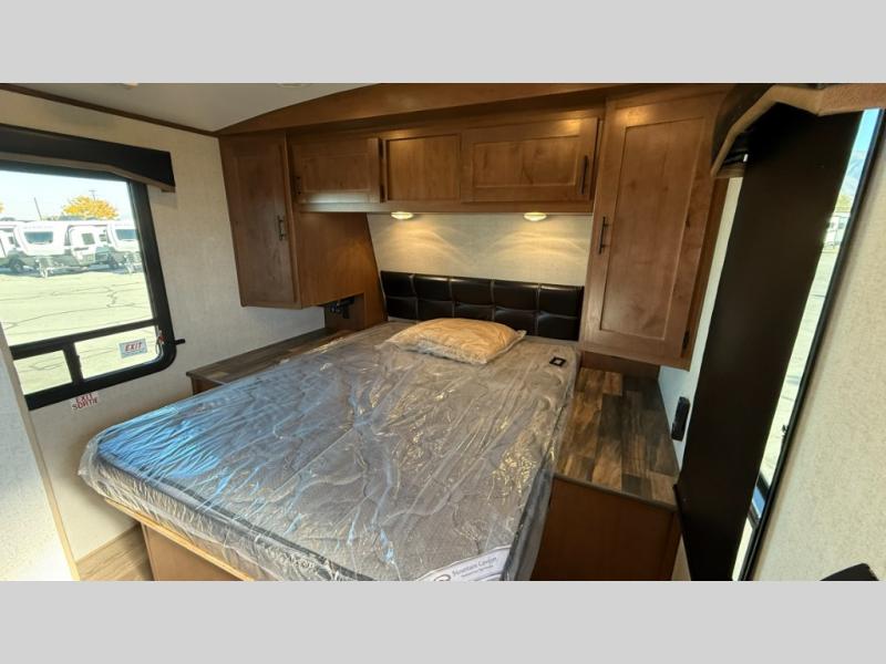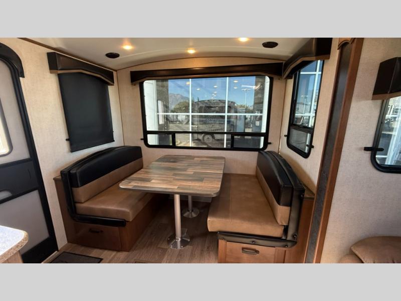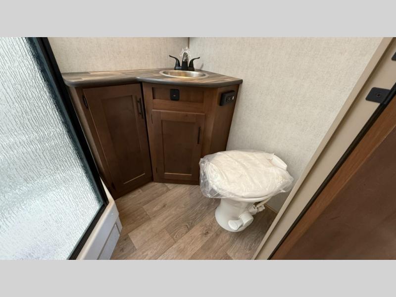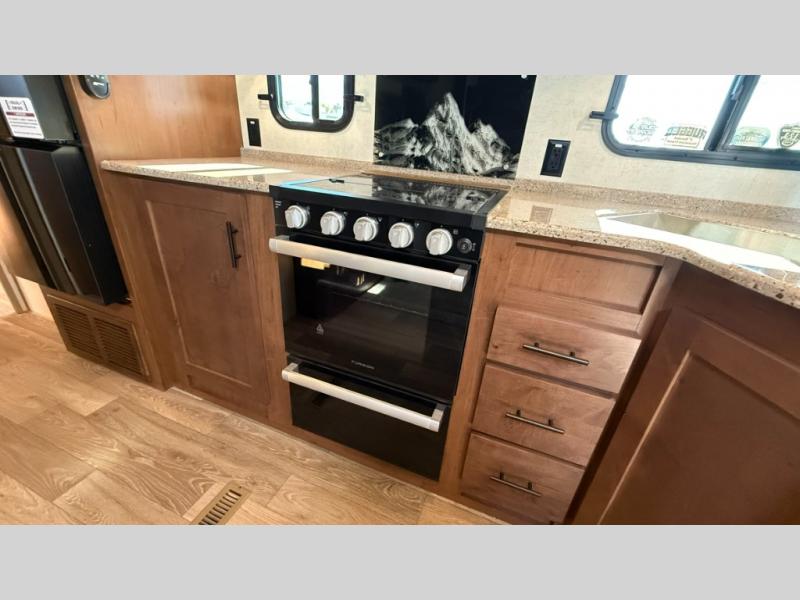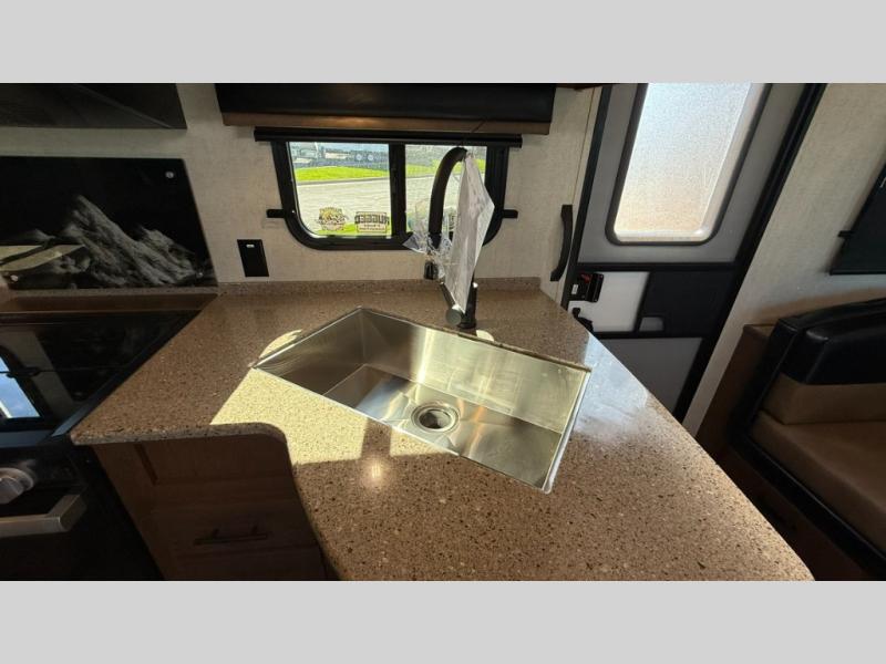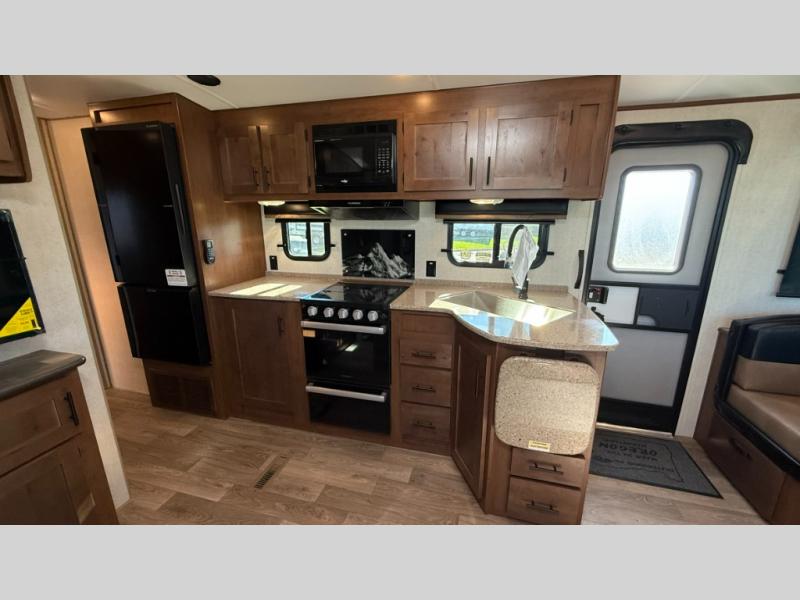 Camping trips are made complete when you have this travel trailer in tow. The rear mountain dinette provides a place to enjoy meals together, and the sleeper sofa slide out is close to the entertainment center for easy viewing of your movies. And if you're not needing the extra sleeping space, you can choose the optional residential sofa with built-in recliners! The chef of your group can prepare home-cooked meals in the kitchen, especially with a flip-up counter for more space. There is also a pantry, sunken range, 10 cu. ft. 12V refrigerator, plus a high-rise pull out faucet for easy clean up. The full bath is towards the front of the unit where you'll find the private bedroom, complete with a queen bed and plenty of storage space for clothes, shoes, and more!