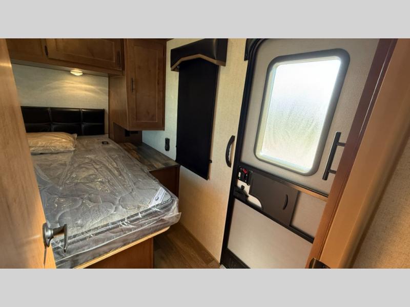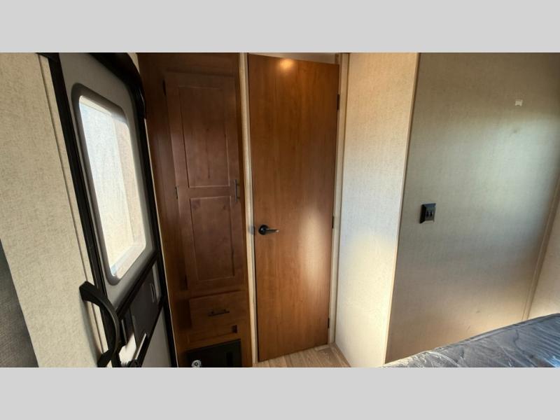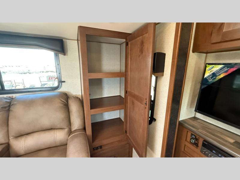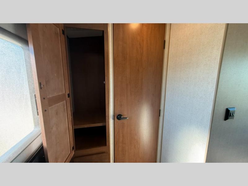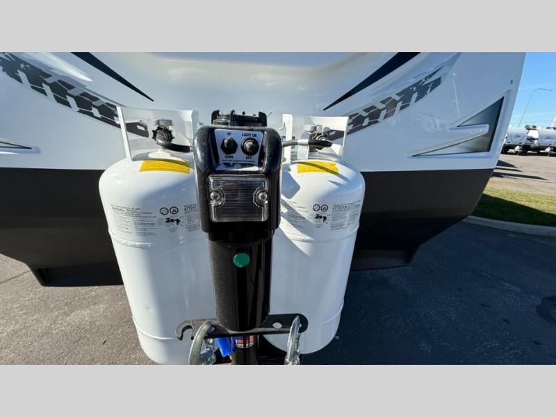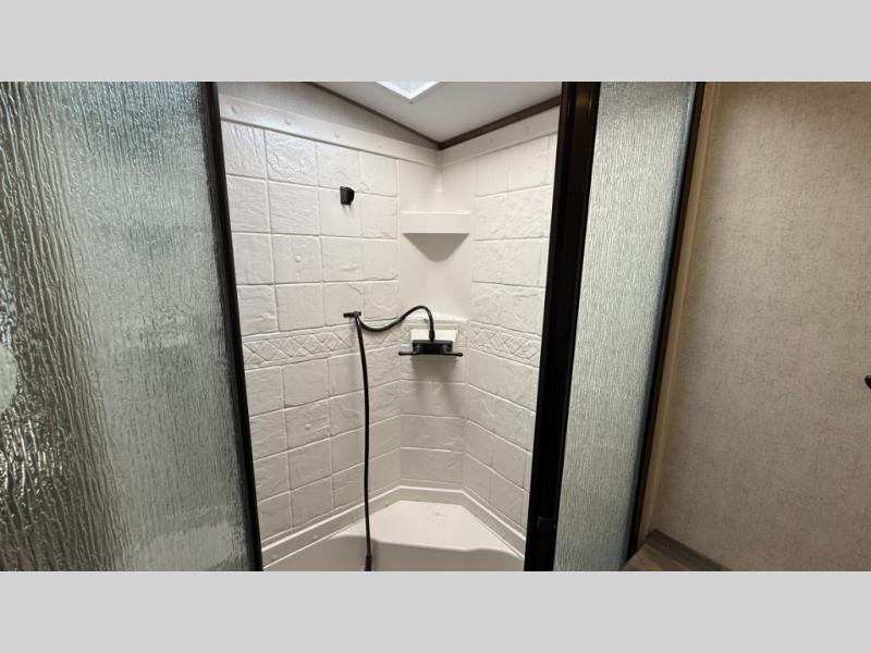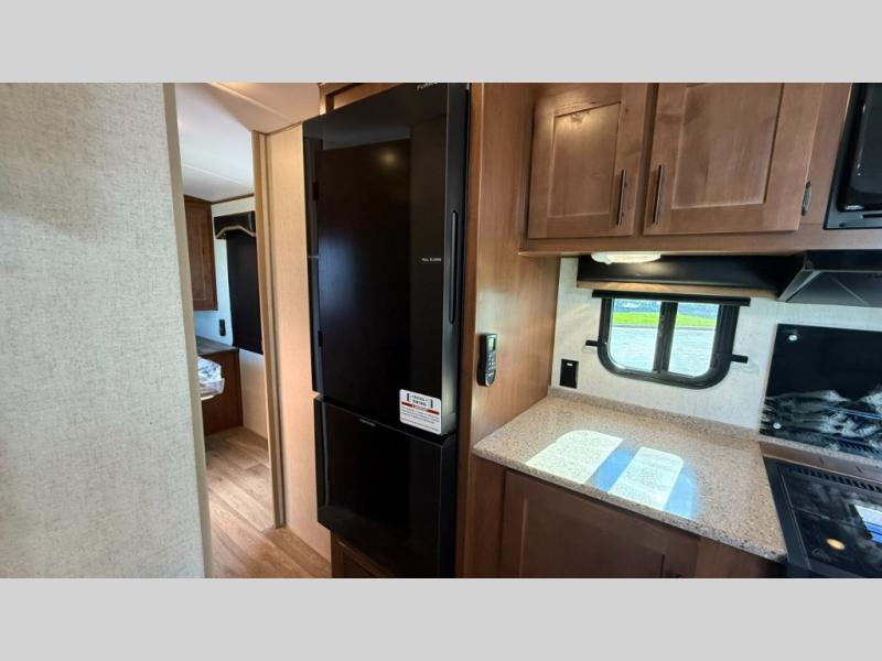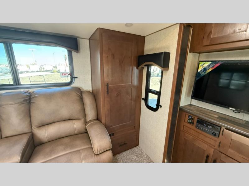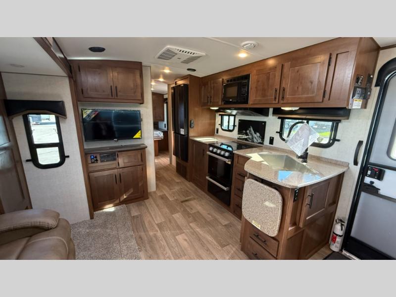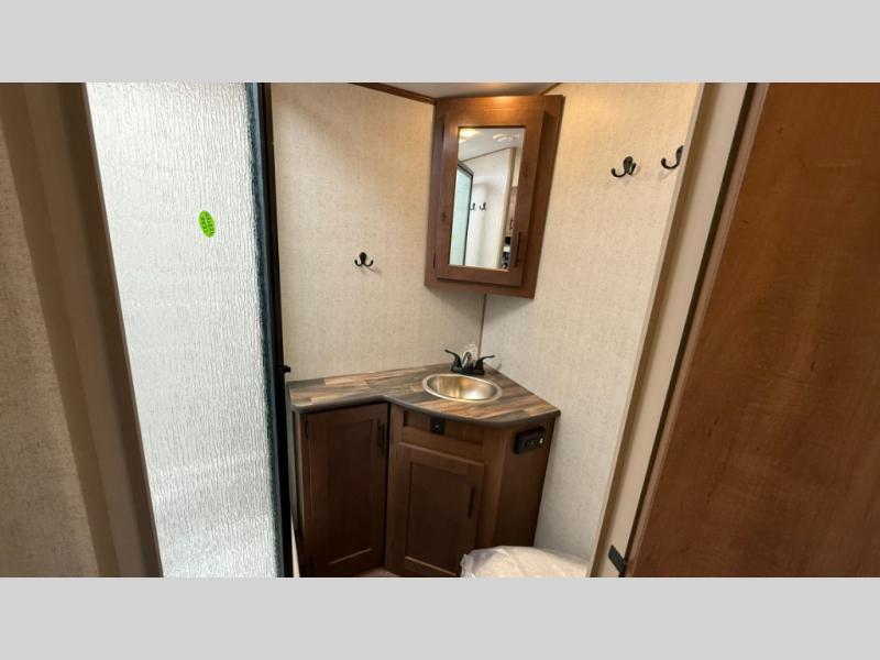 Camping trips are made complete when you have this travel trailer in tow. The rear mountain dinette provides a place to enjoy meals together, and the sleeper sofa slide out is close to the entertainment center for easy viewing of your movies. And if you're not needing the extra sleeping space, you can choose the optional residential sofa with built-in recliners! The chef of your group can prepare home-cooked meals in the kitchen, especially with a flip-up counter for more space. There is also a pantry, sunken range, 10 cu. ft. 12V refrigerator, plus a high-rise pull out faucet for easy clean up. The full bath is towards the front of the unit where you'll find the private bedroom, complete with a queen bed and plenty of storage space for clothes, shoes, and more!