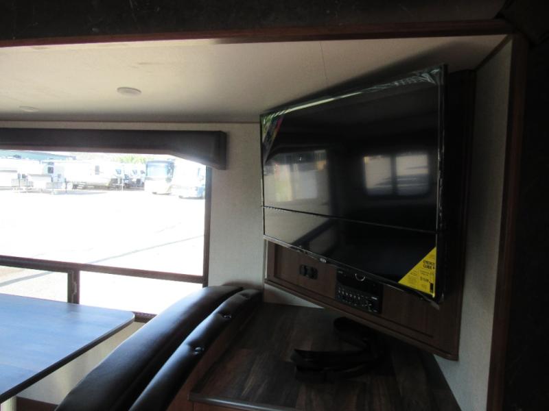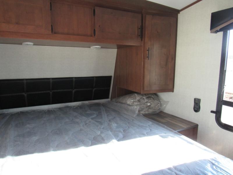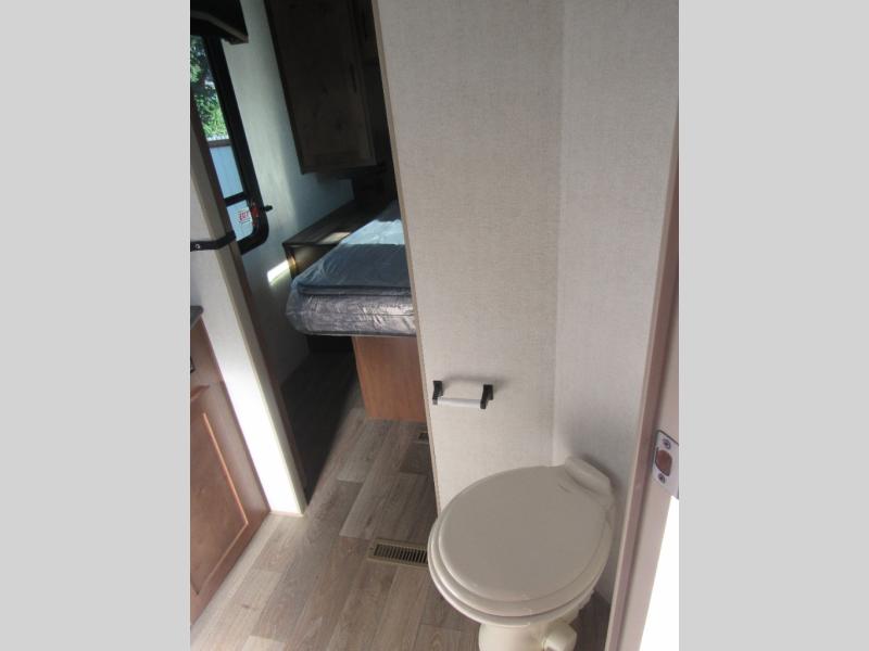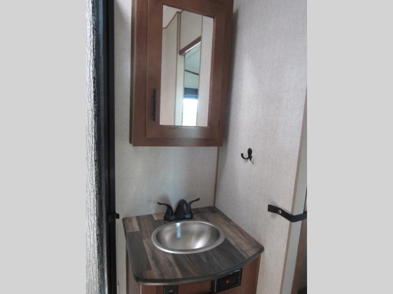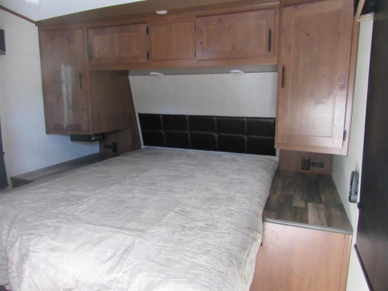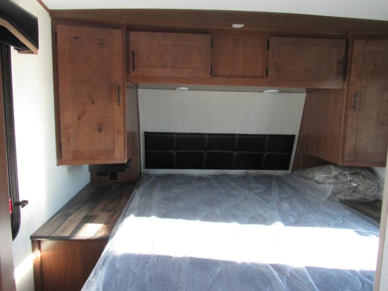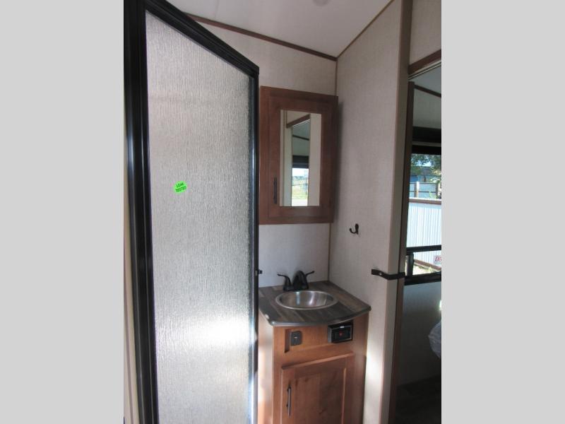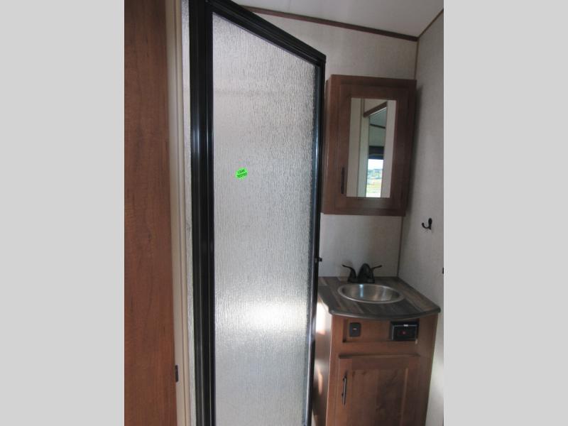 You'll love every minute spent in this cozy travel trailer. There is a rear patio deck with a rail system and stairs, along with a residential sliding glass door that leads to the rear living area. Your crew can play a game at the booth dinette or relax on the residential sofa with built-in recliners. If you're needing more sleeping space, just choose the optional sleeper sofa in place of the standard sofa. There are even optional TRX recliners if want that option as well! The fully-equipped kitchen includes everything you need to make meals each day, plus a 12V refrigerator and pantry for food storage. The flip-up counter will also come in handy when you need extra counter space. Head up front to find the dual entry bath and front master bedroom with a queen bed!