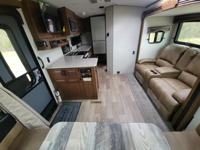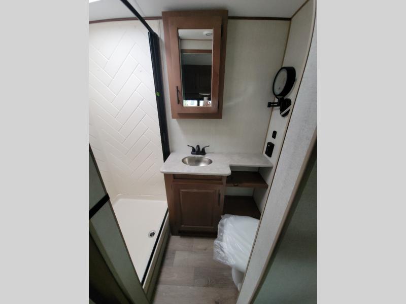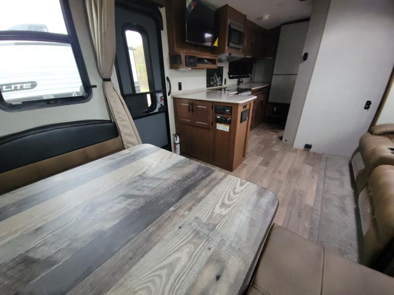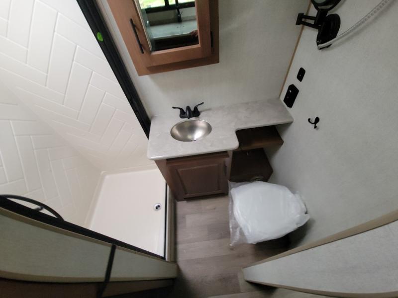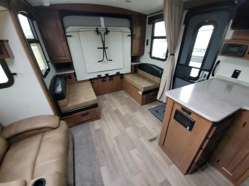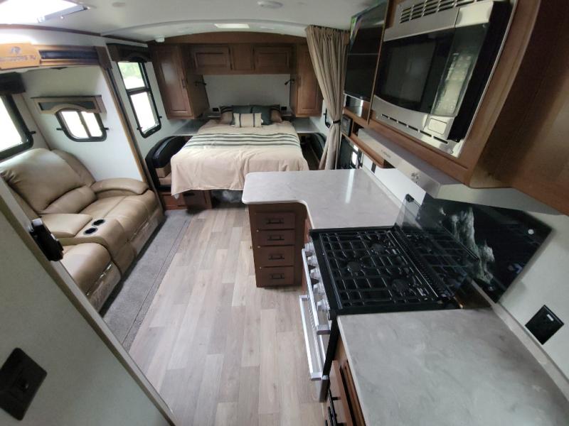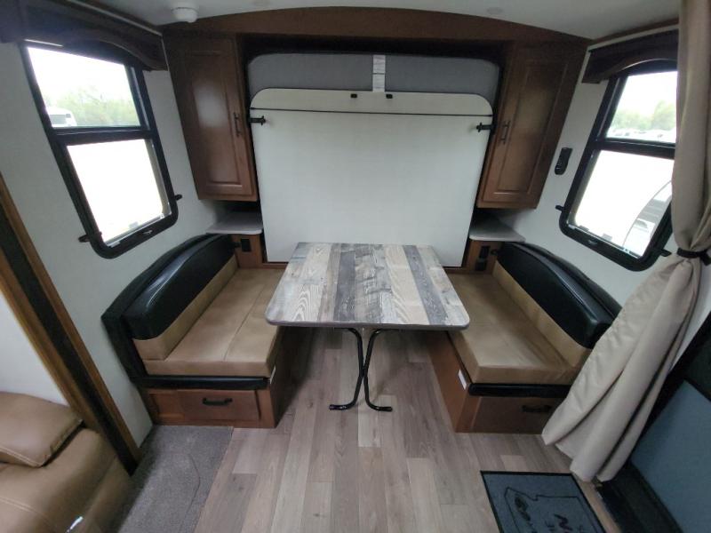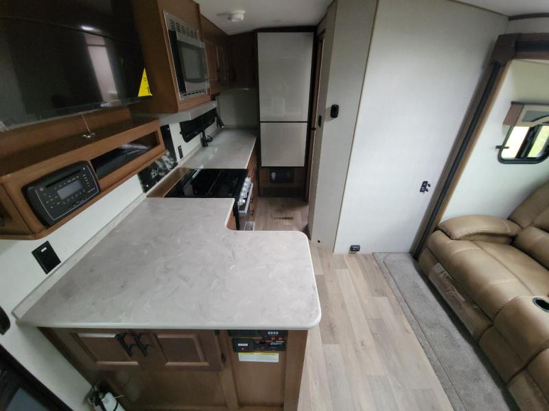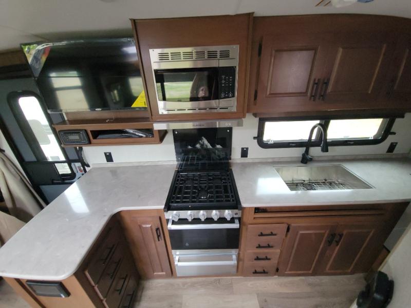 This versatile travel trailer is the perfect couple's unit! There is a front queen wall bed that can be put up each morning so you can dine at the fold down table/dinette. The full kitchen with a three-burner range and 12V refrigerator will let you make meals each day, and the residential sofa with built-in recliners are within a slide out for more space and comfort! And the sofa is in perfect view of the 32" swing-out TV! You can relax outdoors in the evenings under the 16' awning, then head inside to wash up in the full bath before bed!