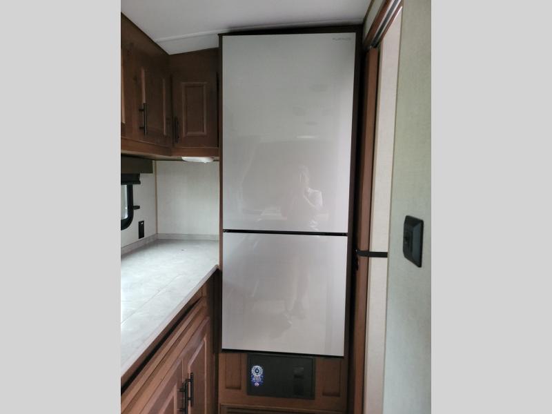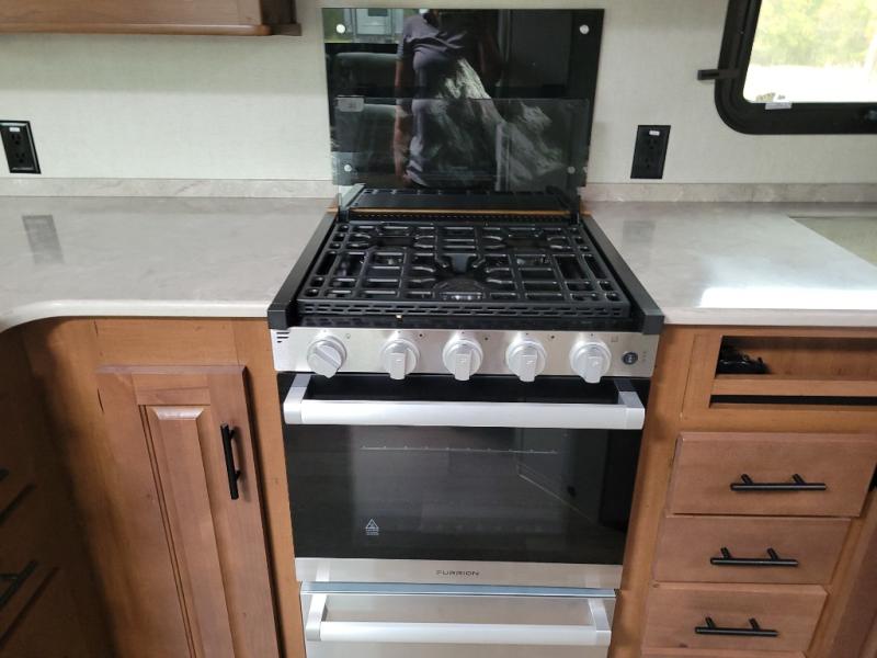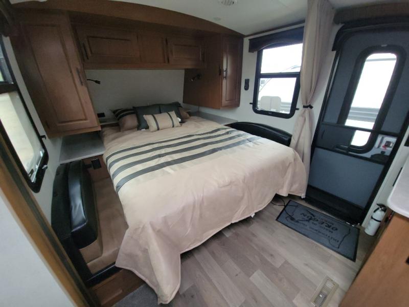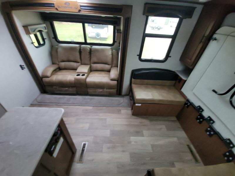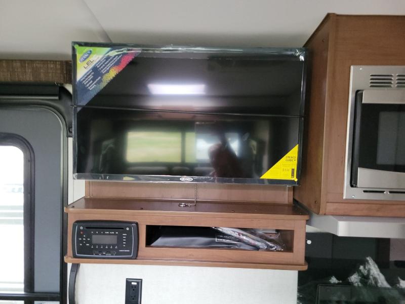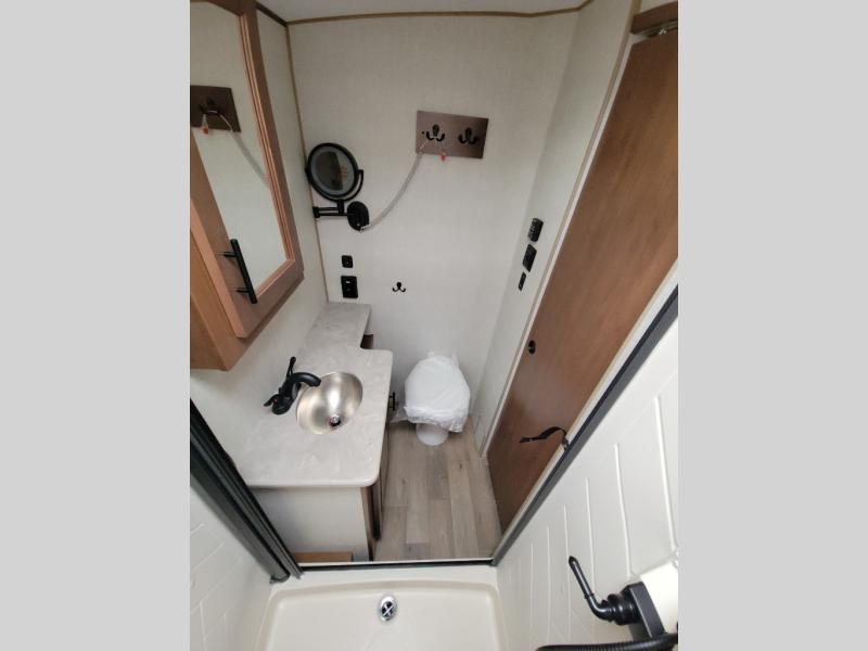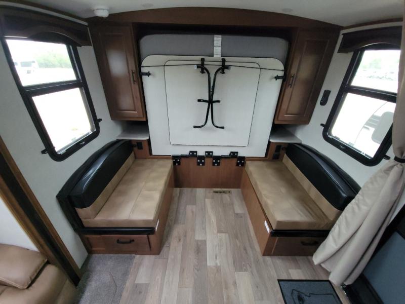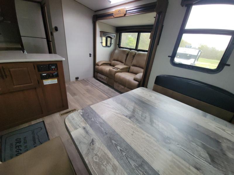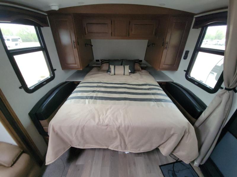 This versatile travel trailer is the perfect couple's unit! There is a front queen wall bed that can be put up each morning so you can dine at the fold down table/dinette. The full kitchen with a three-burner range and 12V refrigerator will let you make meals each day, and the residential sofa with built-in recliners are within a slide out for more space and comfort! And the sofa is in perfect view of the 32" swing-out TV! You can relax outdoors in the evenings under the 16' awning, then head inside to wash up in the full bath before bed!