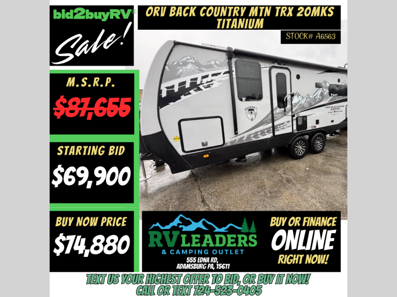 Each Back Country MTN TRX Titanium Series travel trailer by Outdoors RV is designed for camping off-grid plus you can go off-road, camp in national forest or even enjoy primitive style camping! There is a Lamilux HD 4000 high-gloss silver fiberglass exterior, sleek design frameless thermal pane windows, and a silver fiberglass front cap that gives these units a premium trim! You will also appreciate the Ground Control auto leveling and the wireless rear and side(s) turn camera system for hassle-free parking! The Mountain Lodge interior features hardwood throughout and all-leather designs, plus there are LG solid surface countertops, a premium memory foam mattress, and an upgraded shower head to name a few comforts!