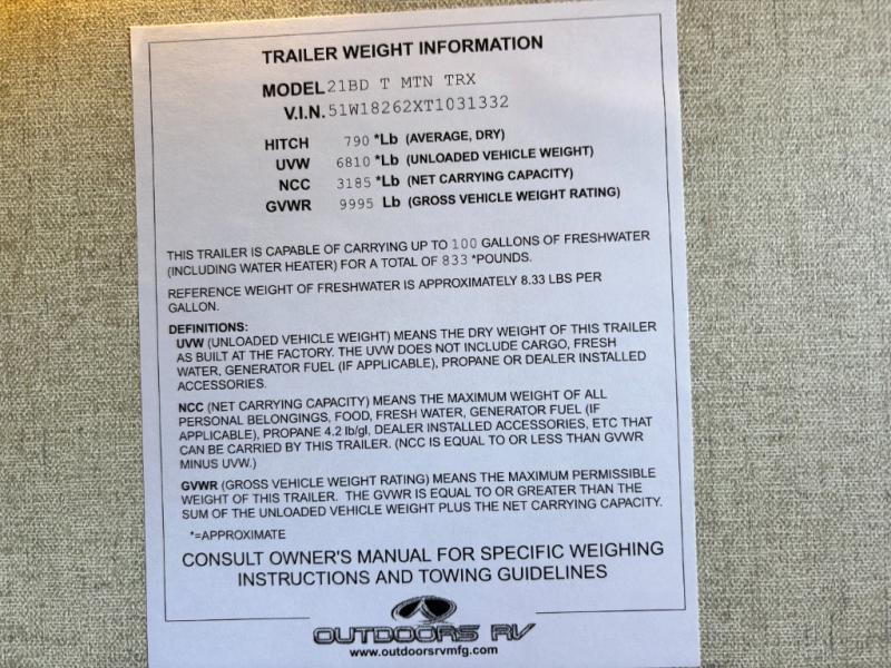 Outdoors RV Back Country Series MTN TRX Titanium Series travel trailer 21BD highlights: