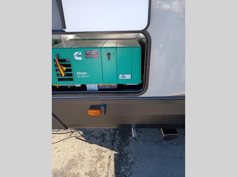 Calling all adventure seekers, this Back Country allows you to choose your destination be it at a state park or off-grid, thanks to the generator and solar panel. You and your friends or family of four will have enough sleeping space inside after your outdoor fun is over. You can take turns getting cleaned up in the double entry bathroom, then relax on the sleeper sofa or the mountain dinette that is within a slide, which also includes the entertainment center and 40" TV. The second entry leads into the front bedroom where you will enjoy privacy, storage, USB ports and your own queen bed. The furniture doubles as sleeping space, and you might like to add the residential sofa option in place of the sleeper sofa if you prefer that type of comfort.