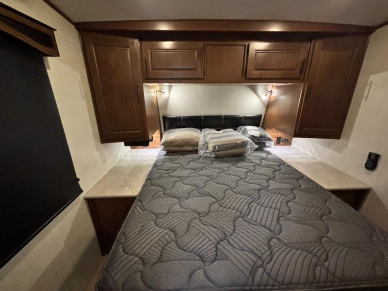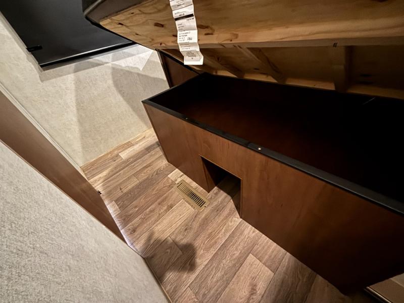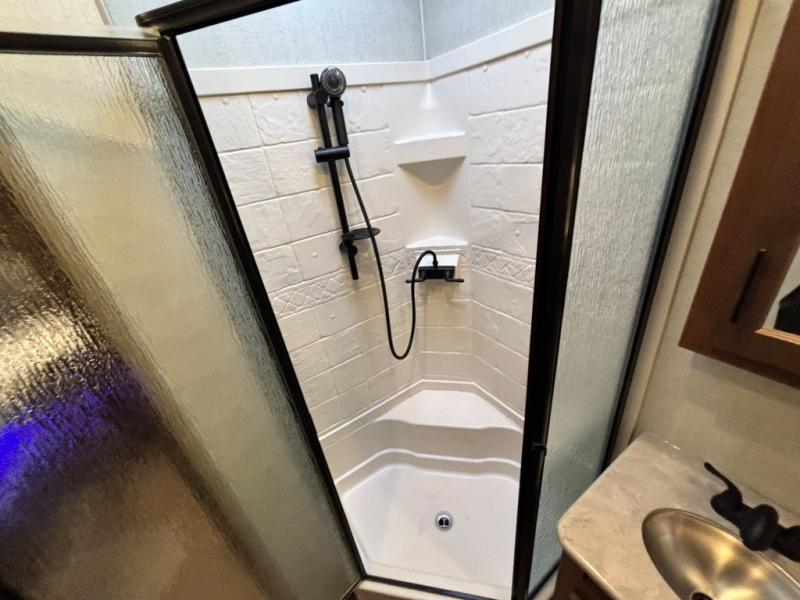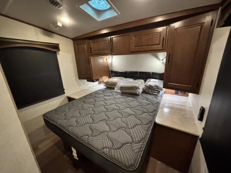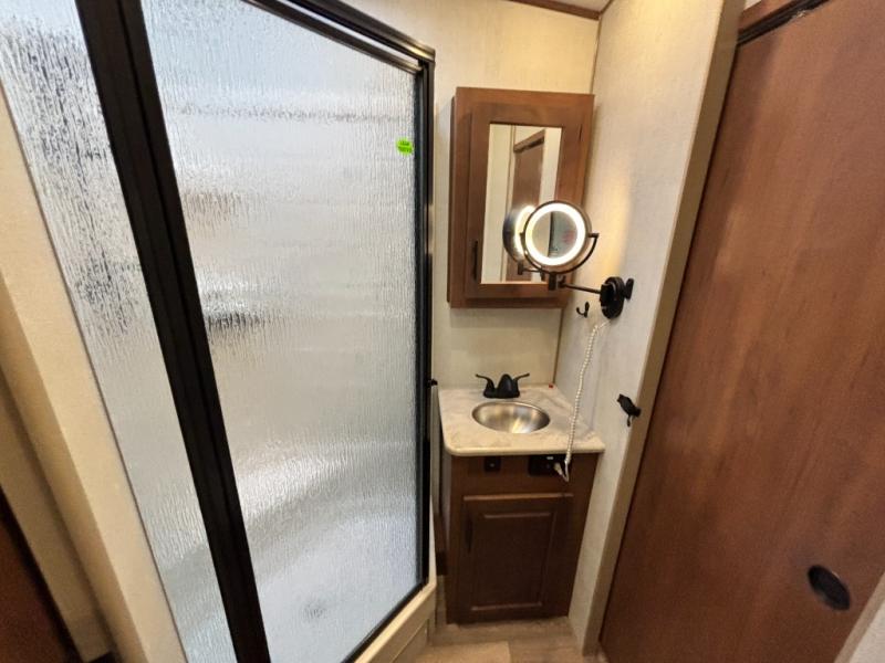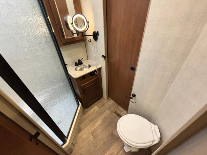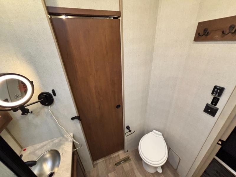 You'll love every minute spent in this cozy travel trailer. There is a rear patio deck with a rail system and stairs, along with a residential sliding glass door that leads to the rear living area. Your crew can play a game at the booth dinette or relax on the residential sofa with built-in recliners. If you're needing more sleeping space, just choose the optional sleeper sofa in place of the standard sofa. There are even optional TRX recliners if want that option as well! The fully-equipped kitchen includes everything you need to make meals each day, plus a 12V refrigerator and pantry for food storage. The flip-up counter will also come in handy when you need extra counter space. Head up front to find the dual entry bath and front master bedroom with a queen bed!