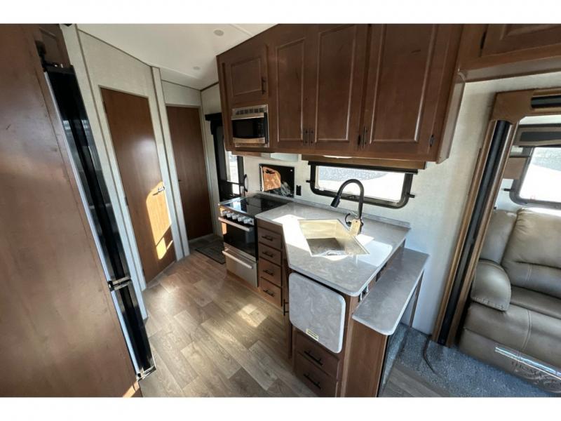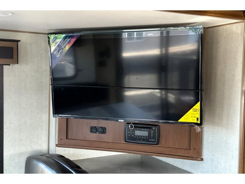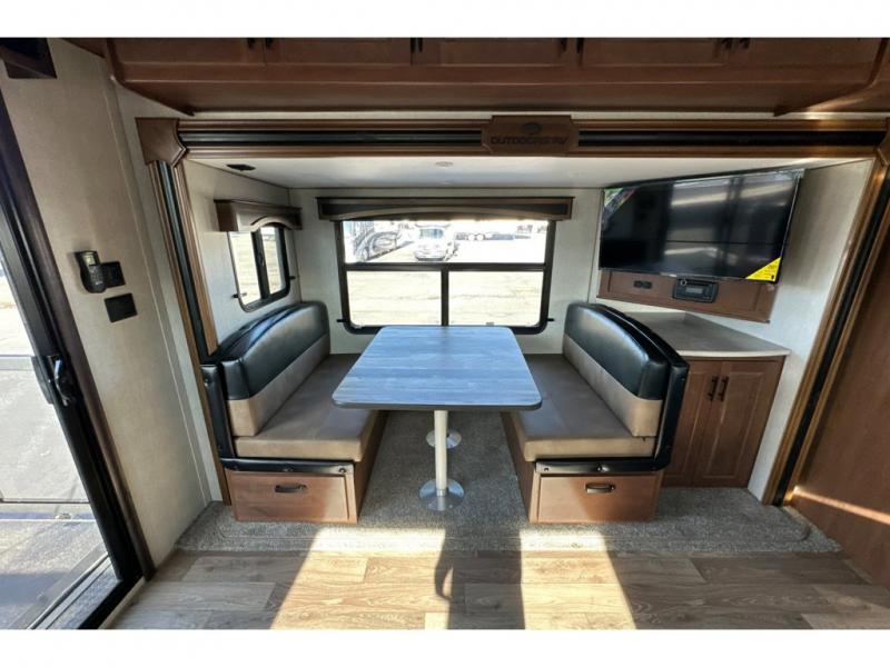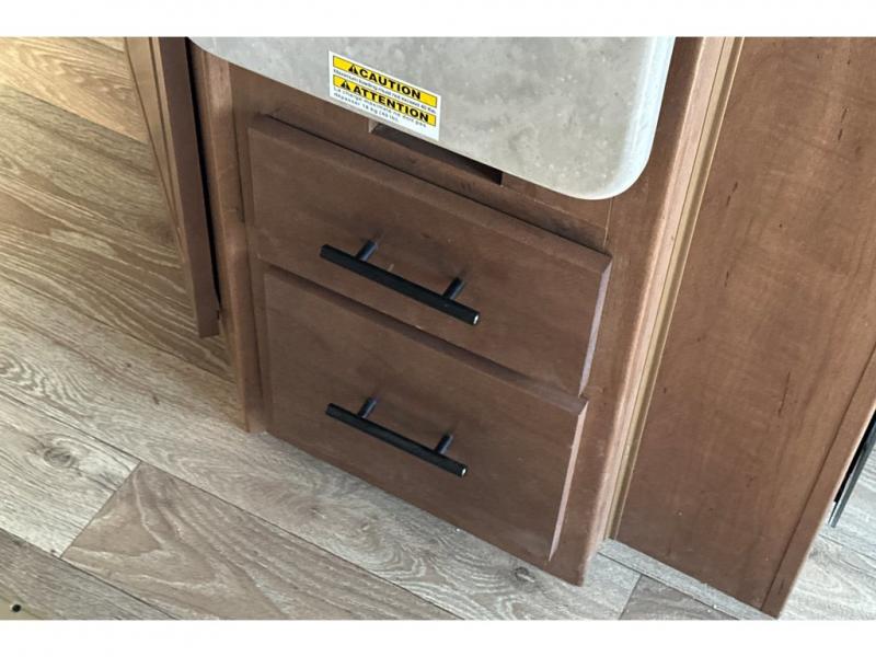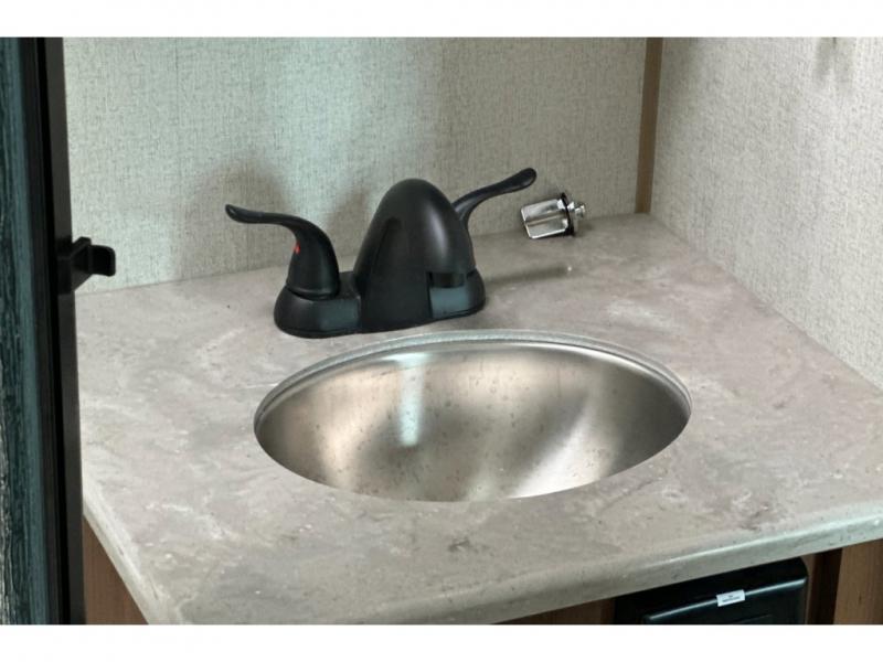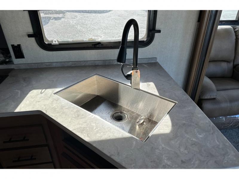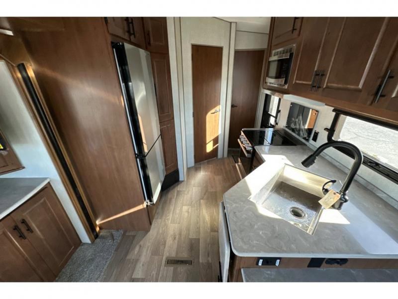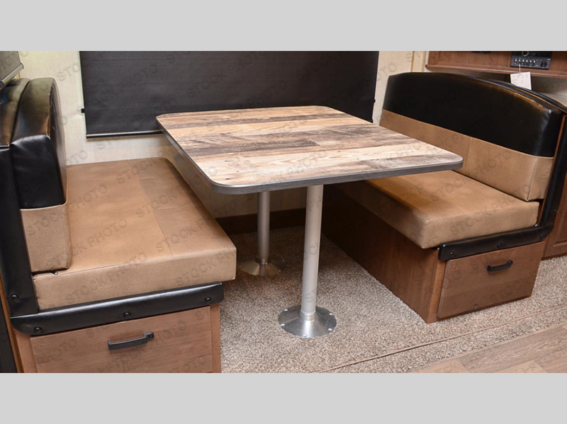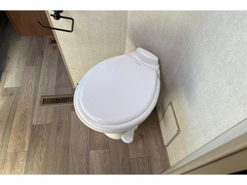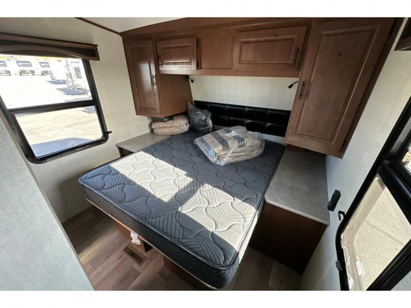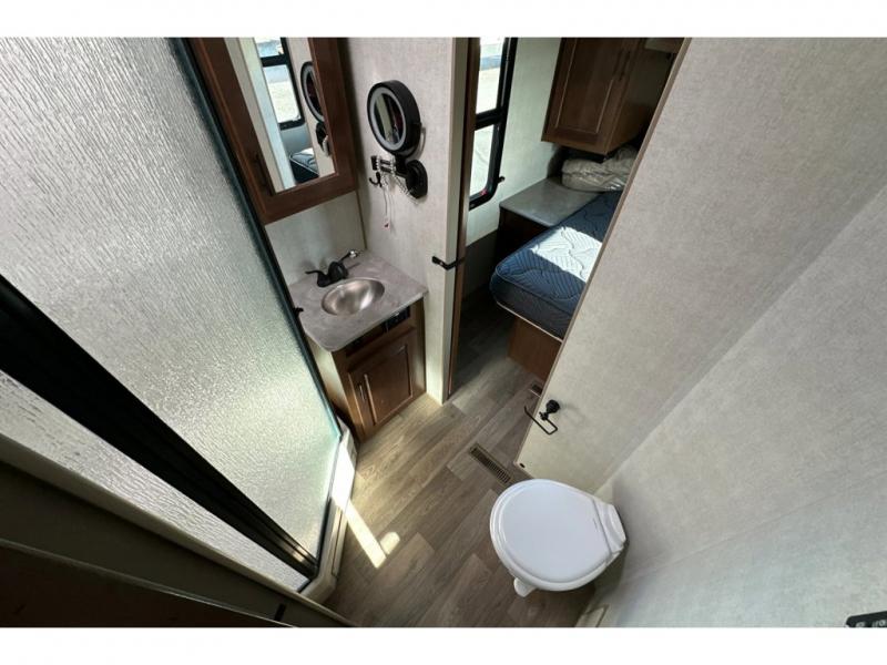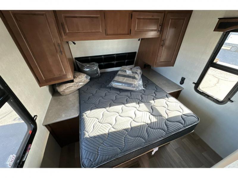 You'll love every minute spent in this cozy travel trailer. There is a rear patio deck with a rail system and stairs, along with a residential sliding glass door that leads to the rear living area. Your crew can play a game at the booth dinette or relax on the residential sofa with built-in recliners. If you're needing more sleeping space, just choose the optional sleeper sofa in place of the standard sofa. There are even optional TRX recliners if want that option as well! The fully-equipped kitchen includes everything you need to make meals each day, plus a 12V refrigerator and pantry for food storage. The flip-up counter will also come in handy when you need extra counter space. Head up front to find the dual entry bath and front master bedroom with a queen bed!