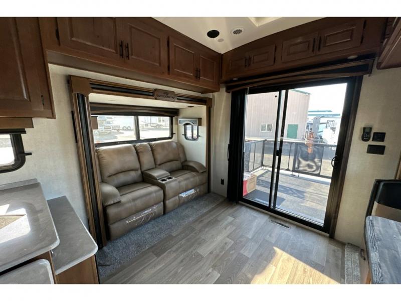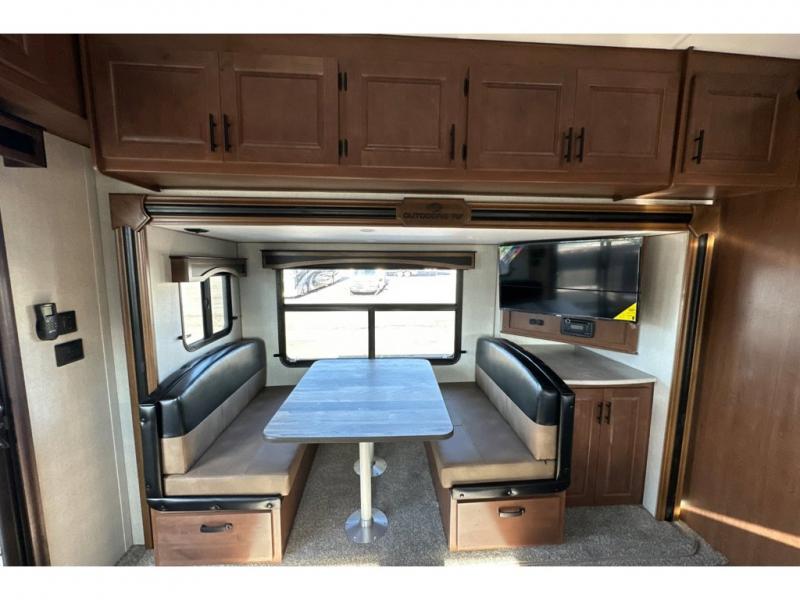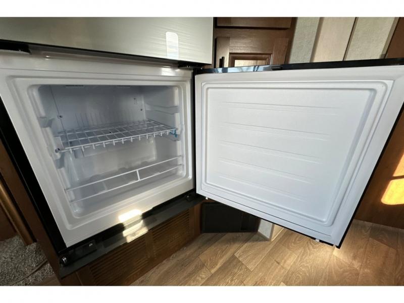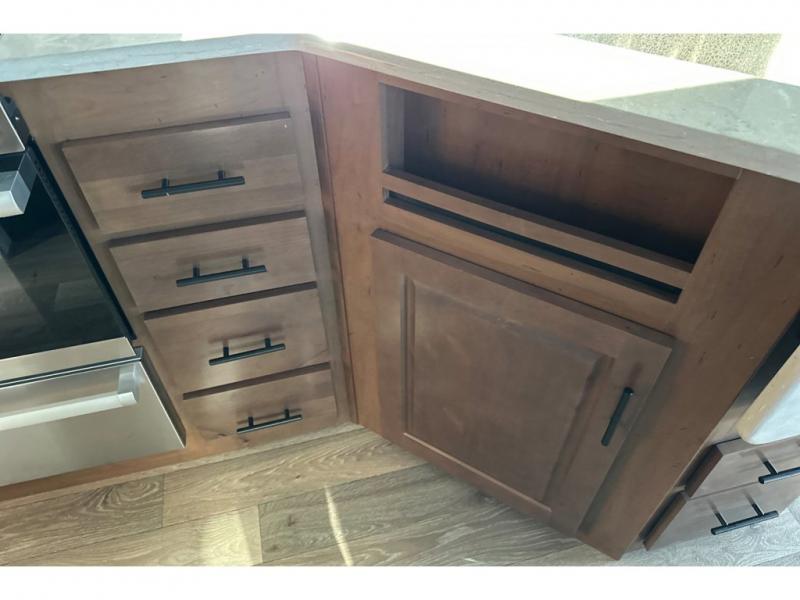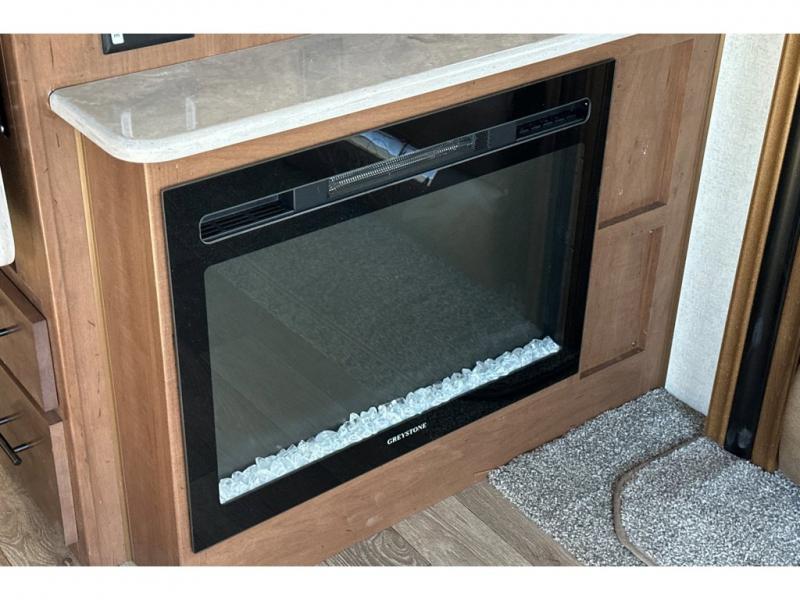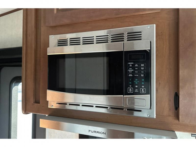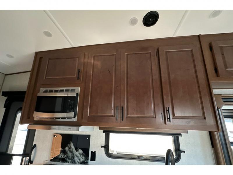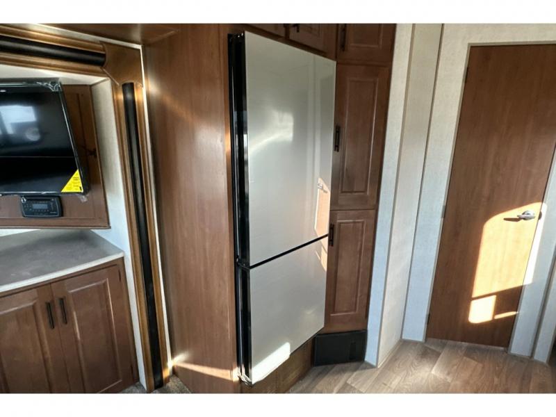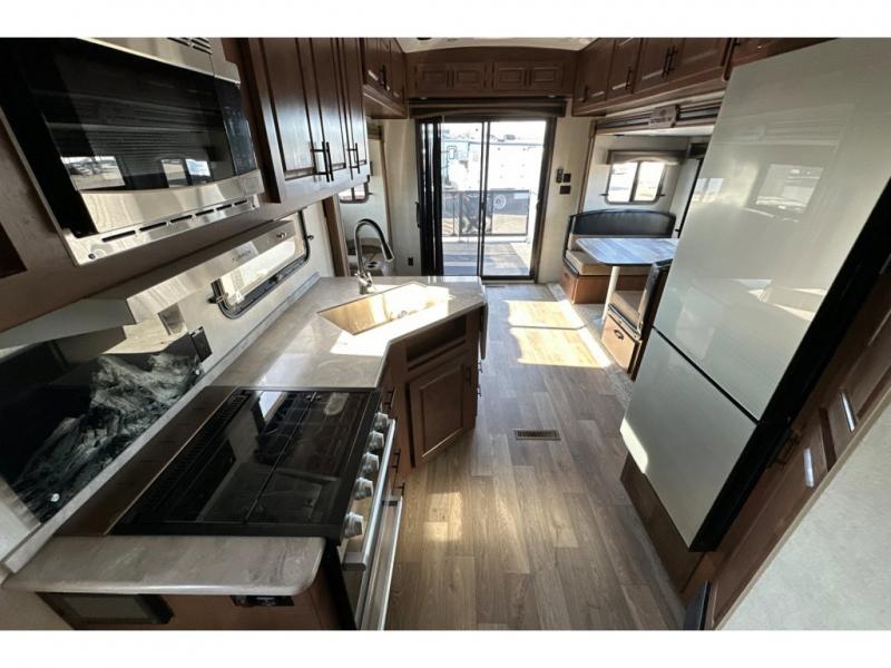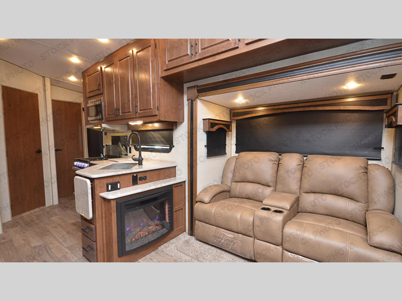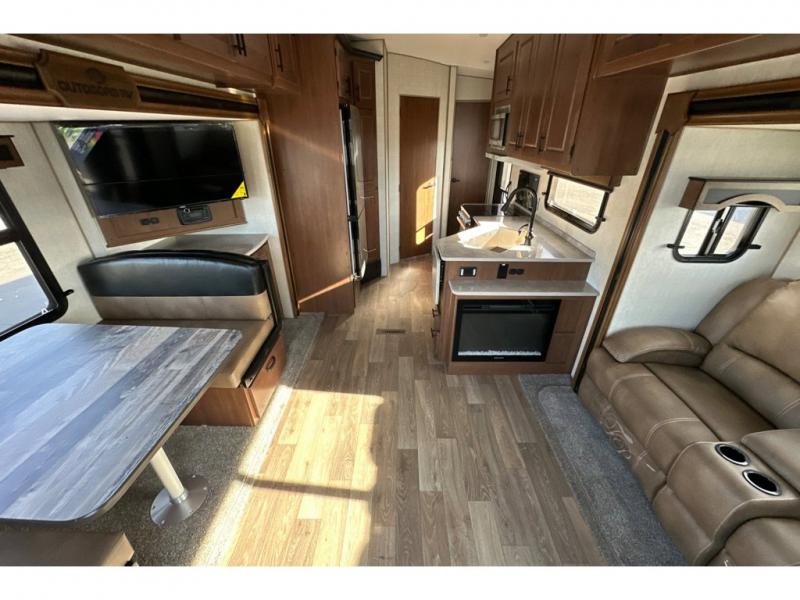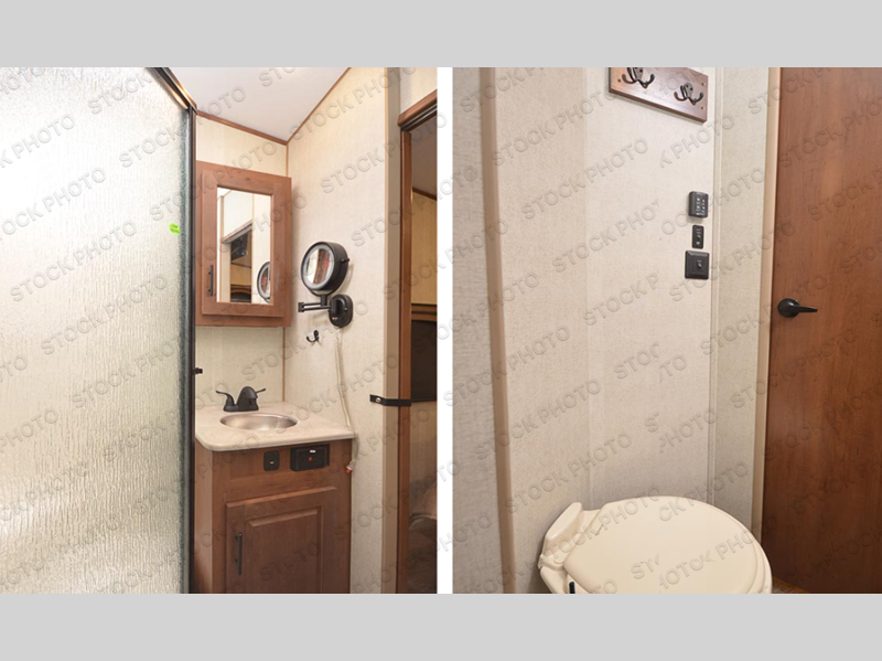 You'll love every minute spent in this cozy travel trailer. There is a rear patio deck with a rail system and stairs, along with a residential sliding glass door that leads to the rear living area. Your crew can play a game at the booth dinette or relax on the residential sofa with built-in recliners. If you're needing more sleeping space, just choose the optional sleeper sofa in place of the standard sofa. There are even optional TRX recliners if want that option as well! The fully-equipped kitchen includes everything you need to make meals each day, plus a 12V refrigerator and pantry for food storage. The flip-up counter will also come in handy when you need extra counter space. Head up front to find the dual entry bath and front master bedroom with a queen bed!