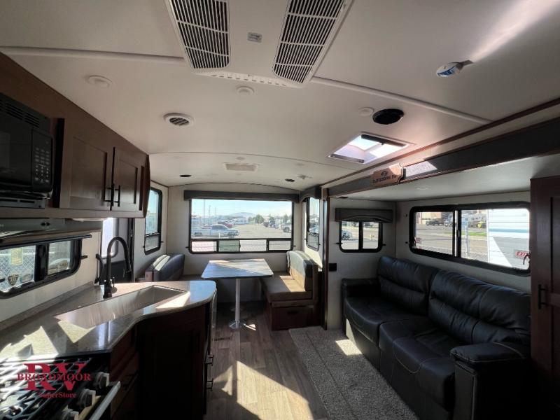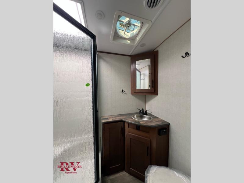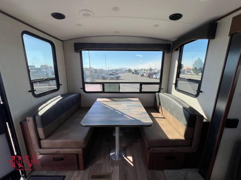 This dual entry travel trailer will be perfect for your trips to the mountains. The rear mountain dinette includes a large window for outdoor views, and you'll find additional seating space on the sleeper sofa. The chef of your group can work up their magic in the full kitchen that includes a sunken range and a flip-up counter for more counter space. Within the front private bedroom you'll find a queen bed, wardrobes on either side of the bed, plus a wardrobe slide for more space and storage.