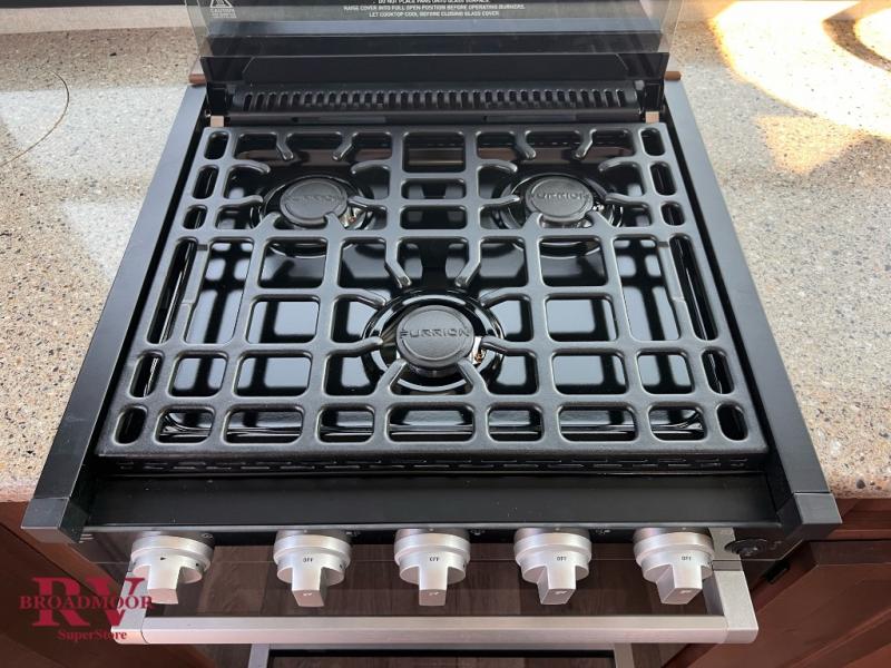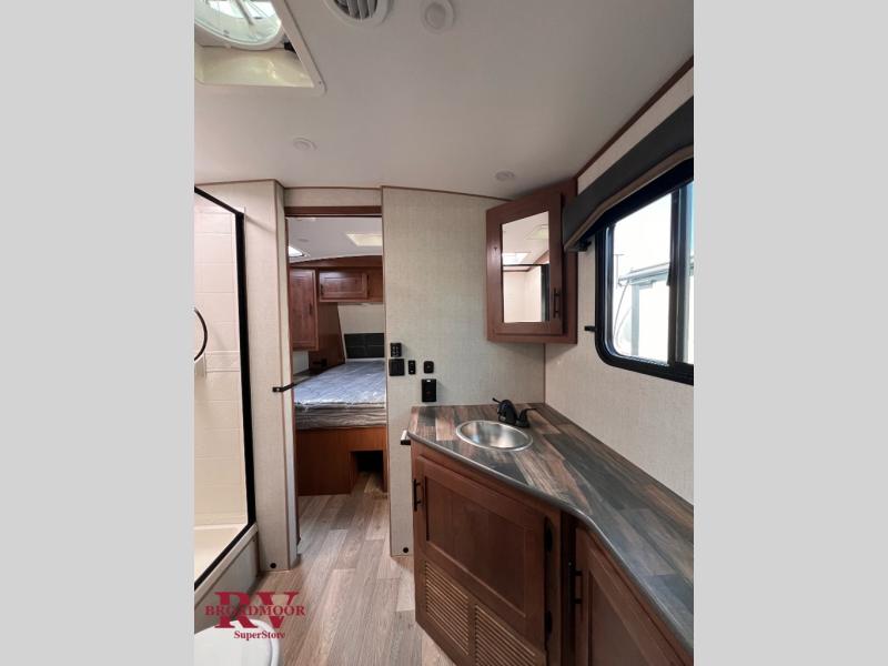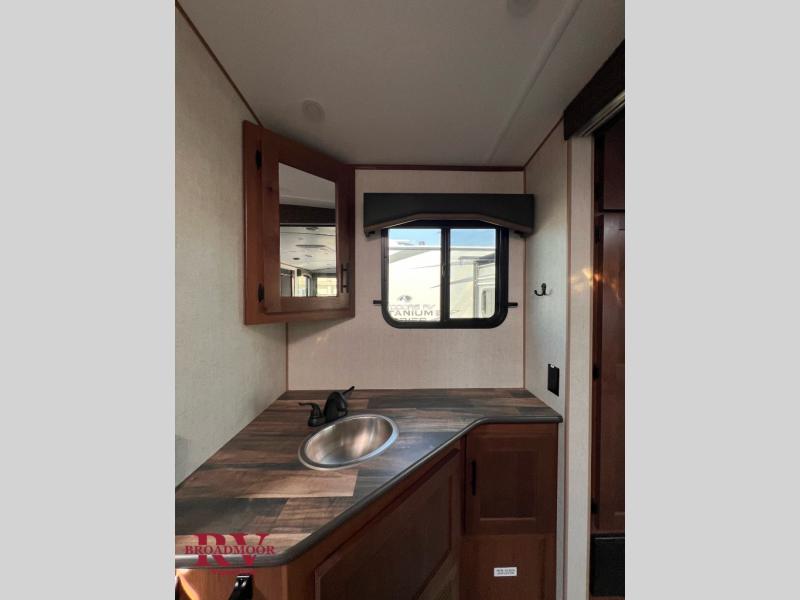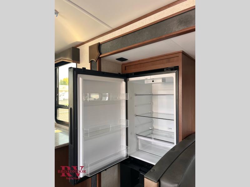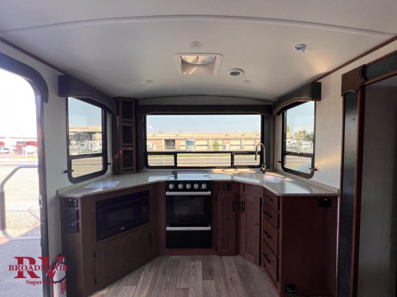 Dual entry doors in this travel trailer will allow you to enter in through the rear kitchen or the front master bedroom. A walk-through bath is easily accessible for everyone, and the main living area is made open thanks to the dual opposing slides. While dinner is being made on the three burner cooktop, you can play a game at the mountain dinette, or relax on the sofa with built-in recliners and watch a movie on the swing-out 40" TV. You'll appreciate plenty of storage space in this model, including a pantry, wardrobes on either side of the bed, plus a wardrobe slide in the bedroom for your favorite outfits!