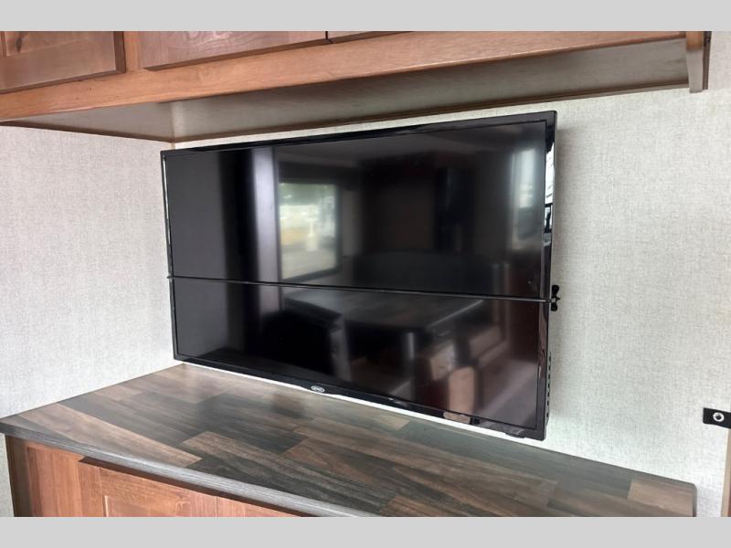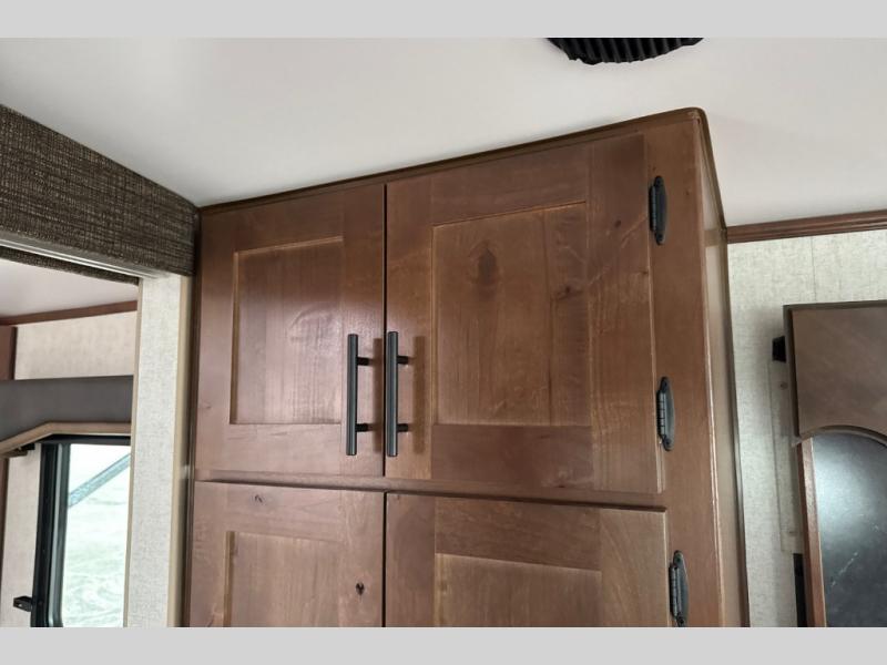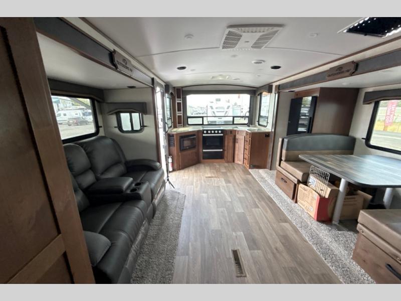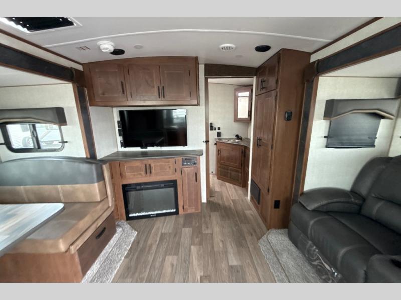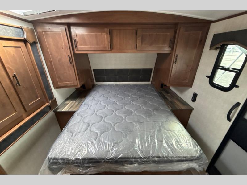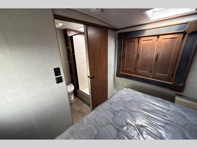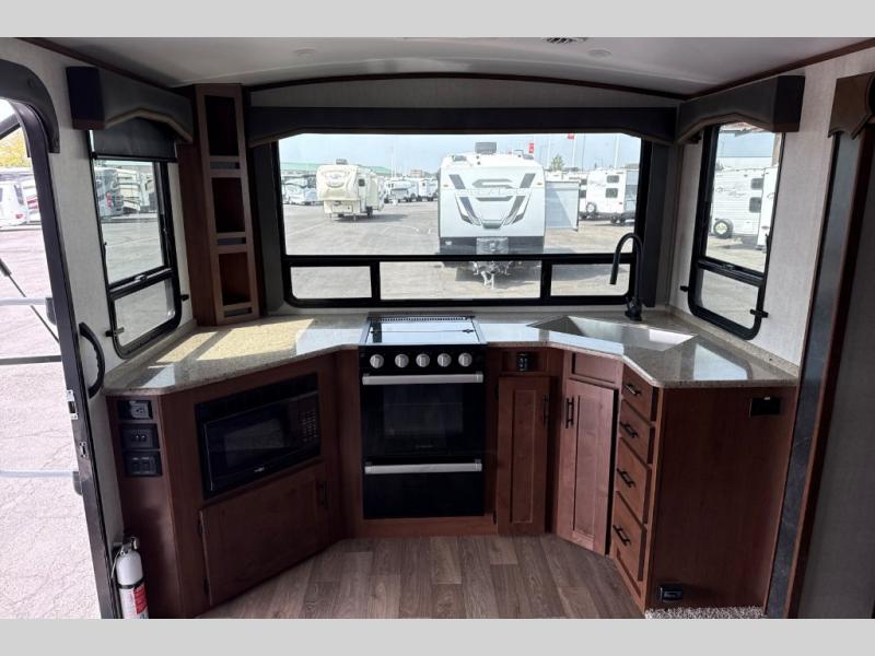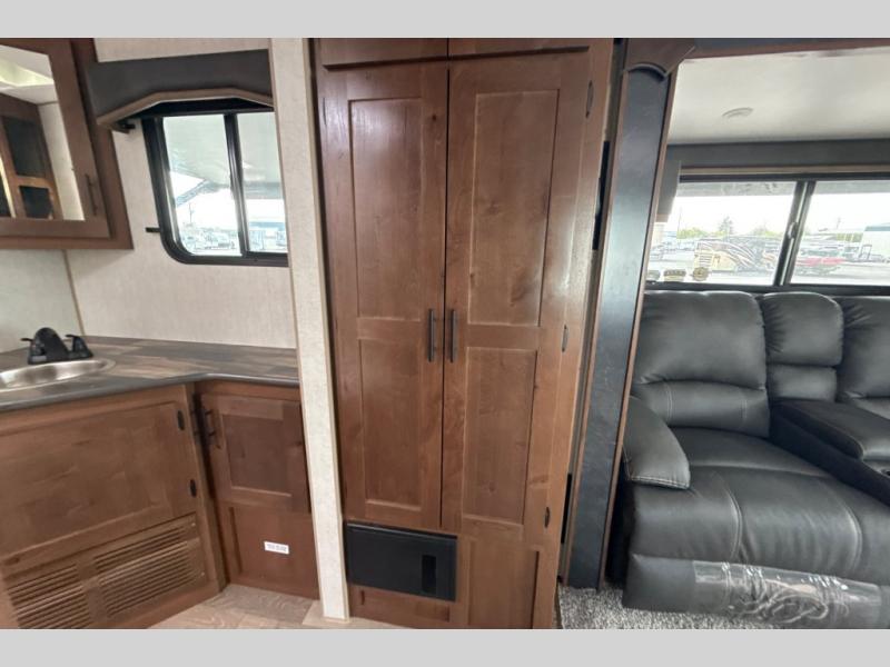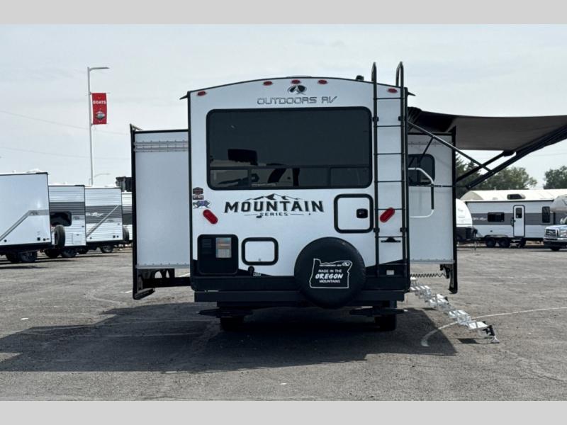Dual entry doors in this travel trailer will allow you to enter in through the rear kitchen or the front master bedroom. A walk-through bath is easily accessible for everyone, and the main living area is made open thanks to the dual opposing slides. While dinner is being made on the three burner cooktop, you can play a game at the mountain dinette, or relax on the sofa with built-in recliners and watch a movie on the swing-out 40" TV. You'll appreciate plenty of storage space in this model, including a pantry, wardrobes on either side of the bed, plus a wardrobe slide in the bedroom for your favorite outfits!