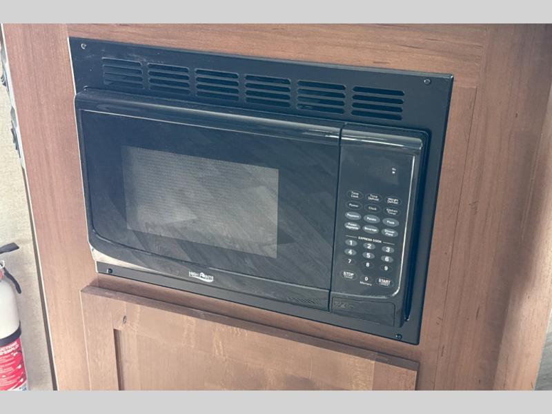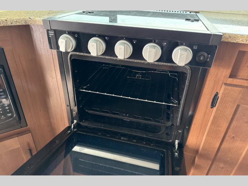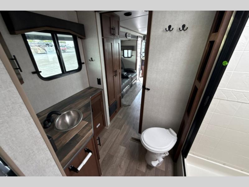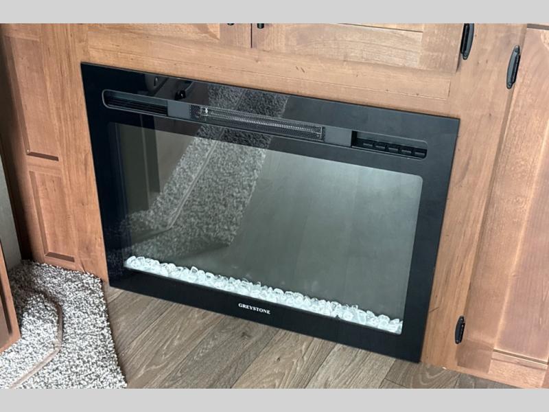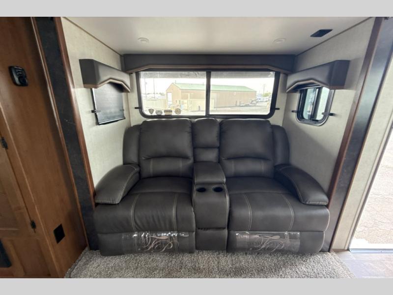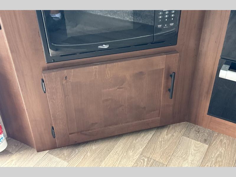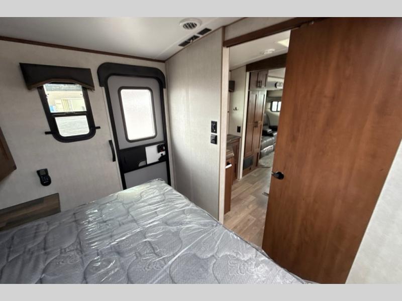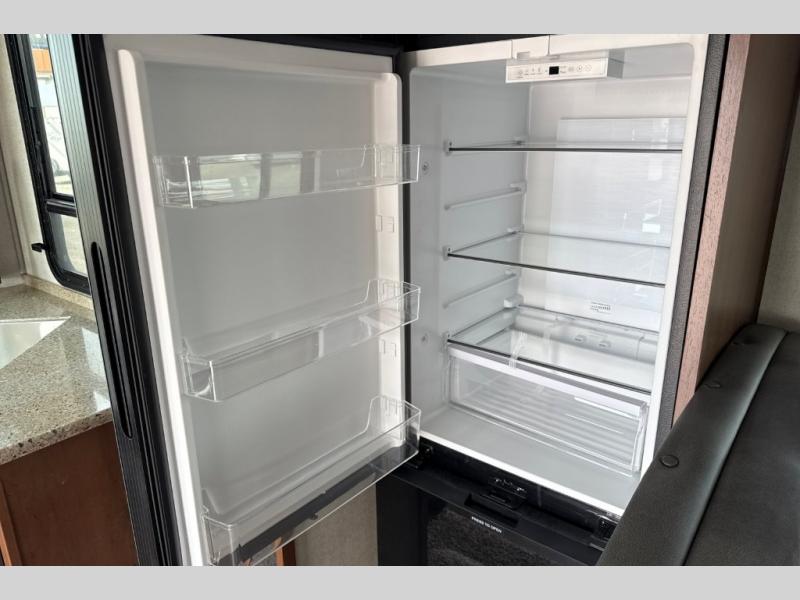 Dual entry doors in this travel trailer will allow you to enter in through the rear kitchen or the front master bedroom. A walk-through bath is easily accessible for everyone, and the main living area is made open thanks to the dual opposing slides. While dinner is being made on the three burner cooktop, you can play a game at the mountain dinette, or relax on the sofa with built-in recliners and watch a movie on the swing-out 40" TV. You'll appreciate plenty of storage space in this model, including a pantry, wardrobes on either side of the bed, plus a wardrobe slide in the bedroom for your favorite outfits!