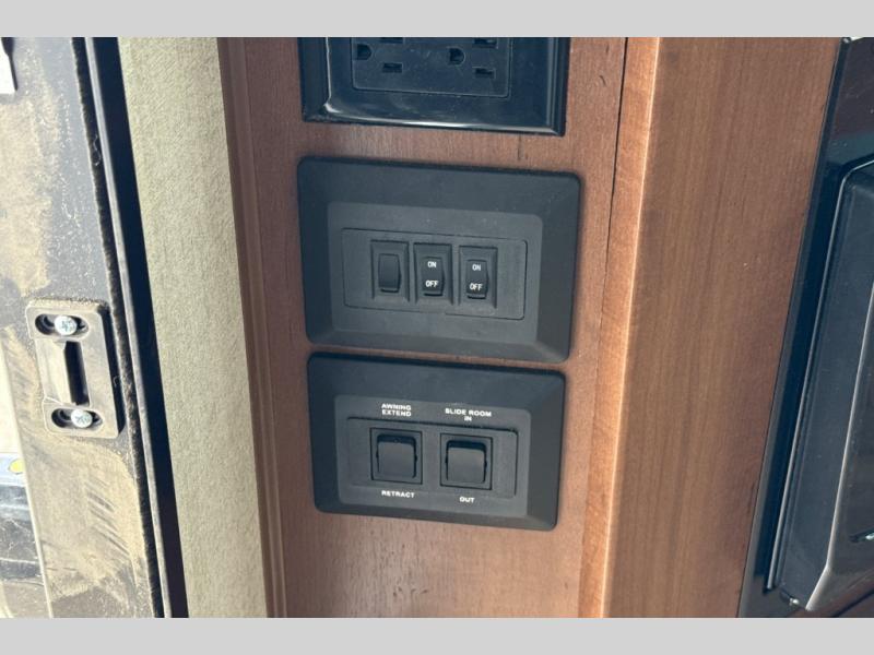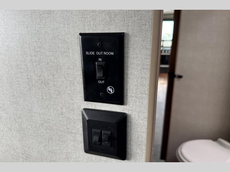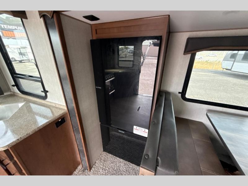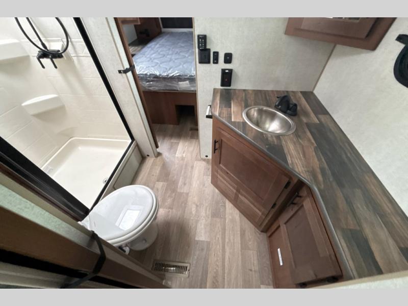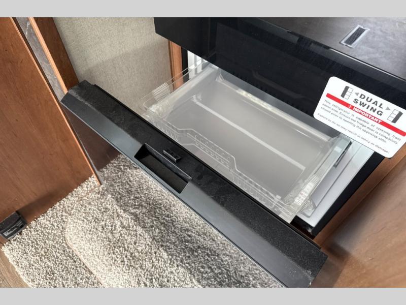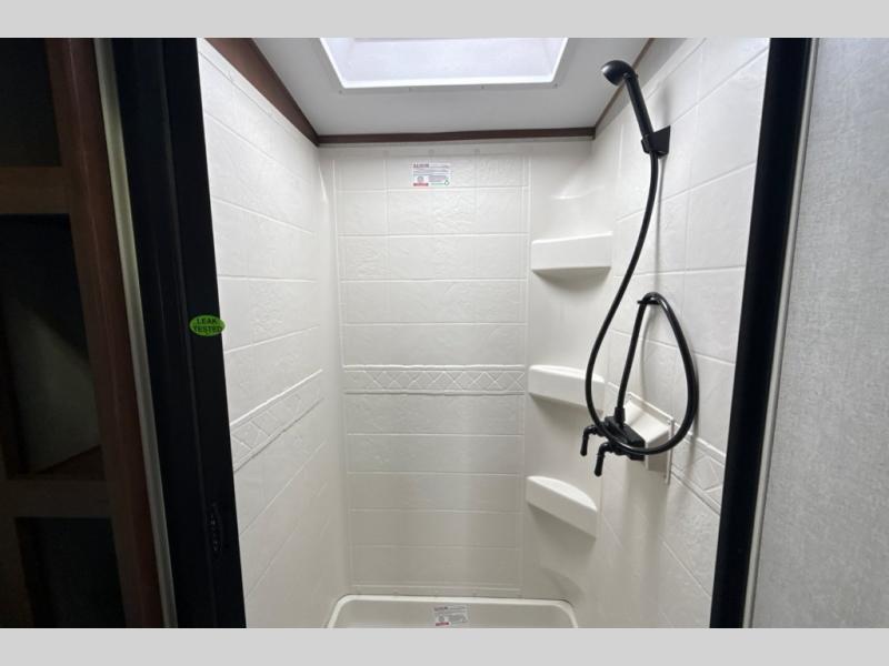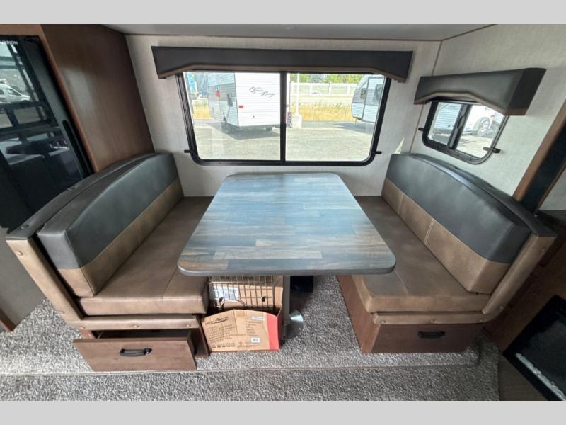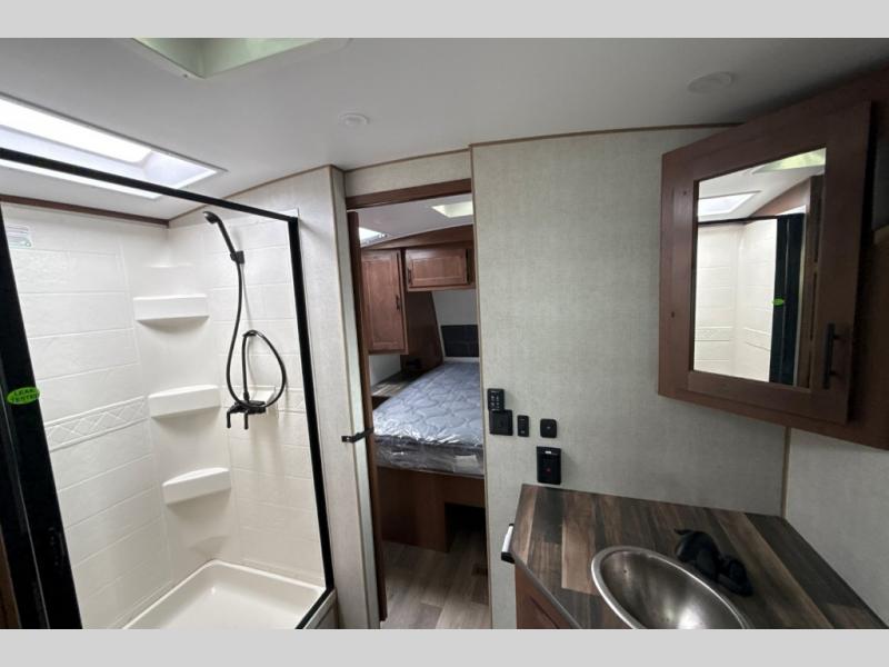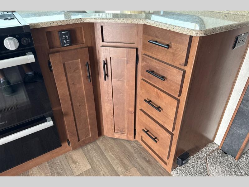 Dual entry doors in this travel trailer will allow you to enter in through the rear kitchen or the front master bedroom. A walk-through bath is easily accessible for everyone, and the main living area is made open thanks to the dual opposing slides. While dinner is being made on the three burner cooktop, you can play a game at the mountain dinette, or relax on the sofa with built-in recliners and watch a movie on the swing-out 40" TV. You'll appreciate plenty of storage space in this model, including a pantry, wardrobes on either side of the bed, plus a wardrobe slide in the bedroom for your favorite outfits!
