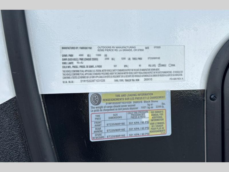 New 2026 Outdoors RV Black Stone Mountain Series 260KVS Travel Trailer
