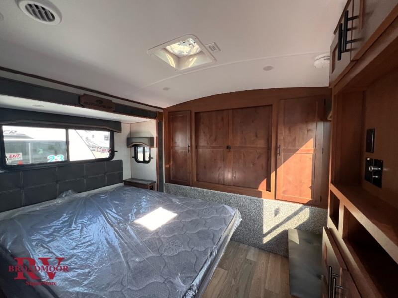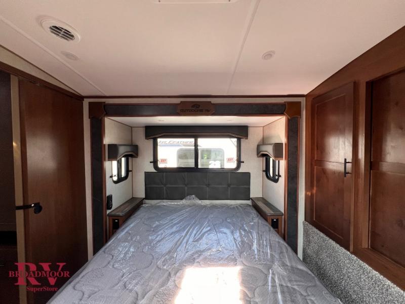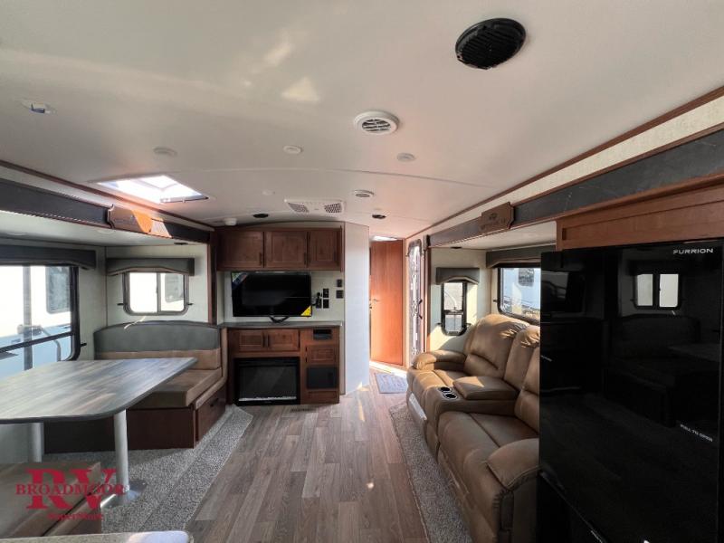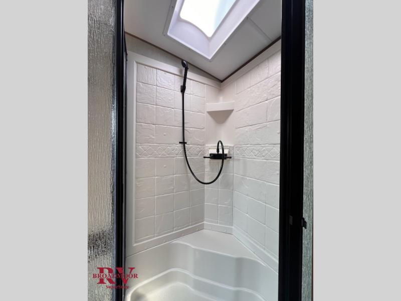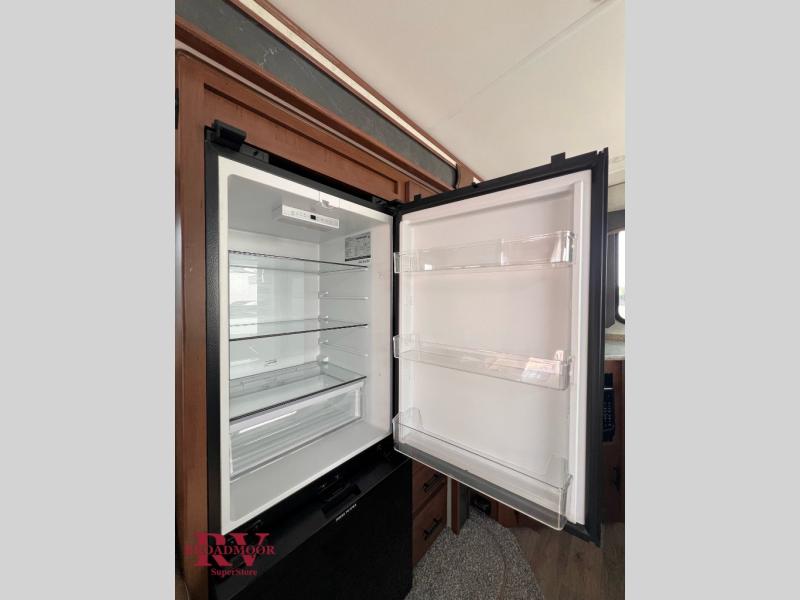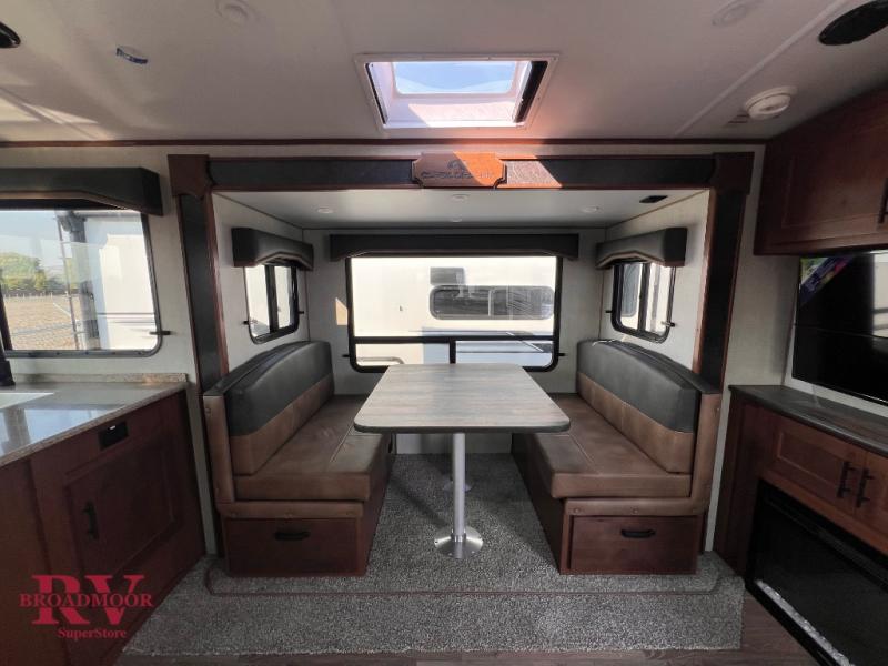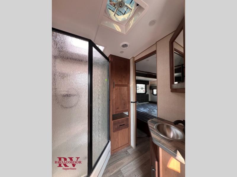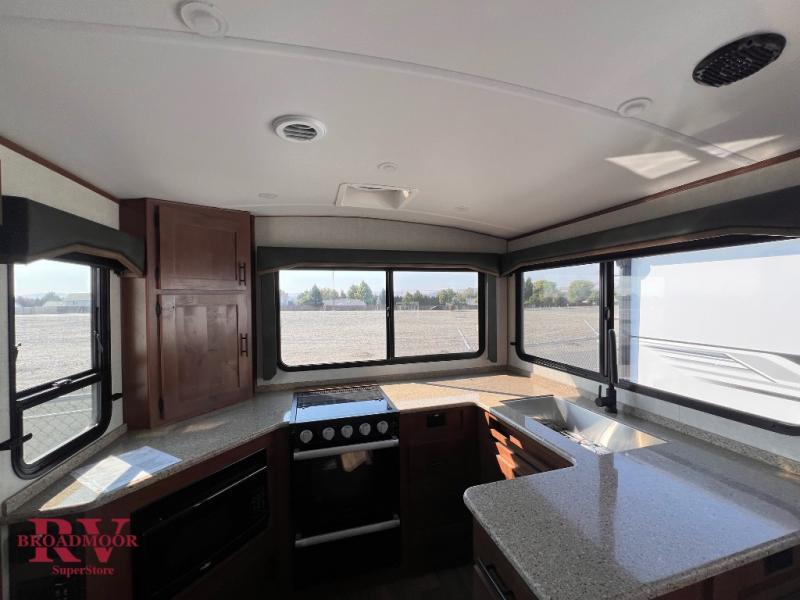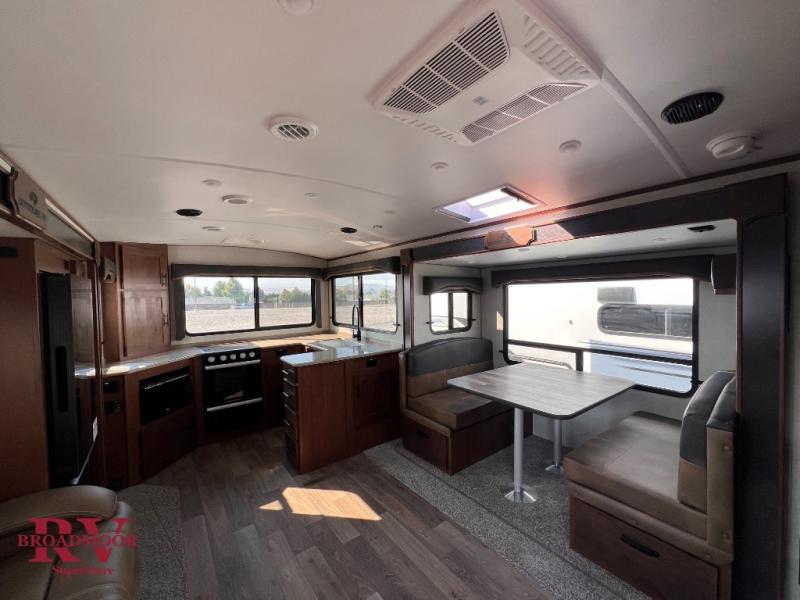 One step inside this roomy travel trailer and you'll be hooked! Your crew will love to visit in the main living area that includes dual opposing slides for tons of space, and there is a residential sofa with built-in recliners here to relax. The mountain dinette with a skylight will be the perfect place for a game of cards, and don't overlook the swing-out 40" TV here as well. This model abundant counter space in the rear kitchen and plenty of windows to take in the outdoor views as you cook. A dual entry bath is super convenient to have, and the front master bedroom will have you feeling right at home. Here, you'll find a queen bed slide out, a large front closet, plus a bench hamper to keep your space tidy.