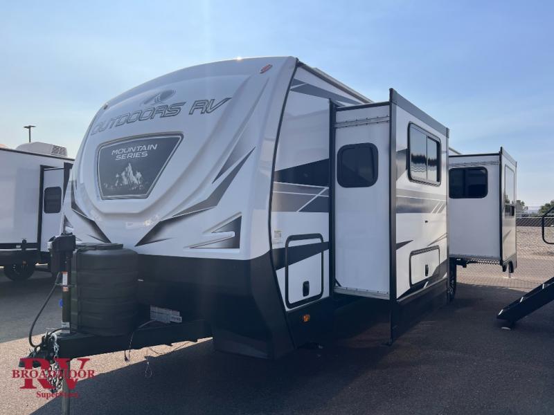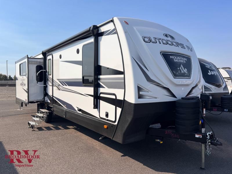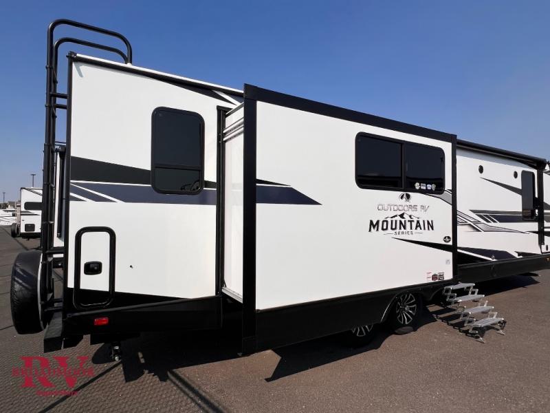 With any Black Stone Mountain Series travel trailer by Outdoors RV, you will enjoy climate designed four seasons camping thanks to the thermal pane windows and unique heated, insulated holding tank design. The custom-built chassis and rugged integrated A-frame are built for strength and durability, along with the rugged 2" bonded aluminum frame walls. Each model includes LG solid surface countertops, granite designed backsplash, vaulted radius ceilings, and a mountain comfort premium mattress for all-around comfort. You will also love the XL panoramic slide out windows and the dual pane living room skylight with a shade to let natural light in!