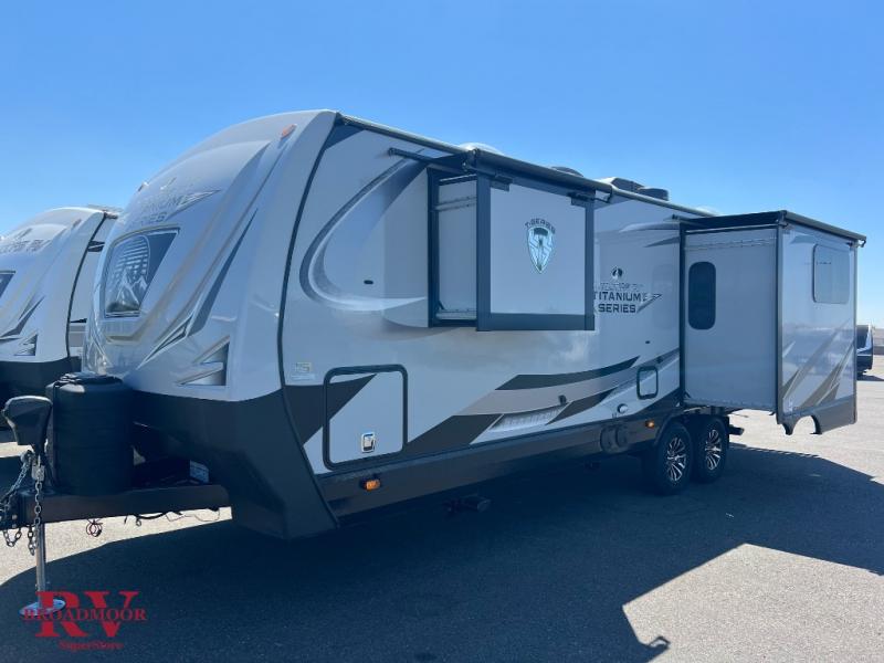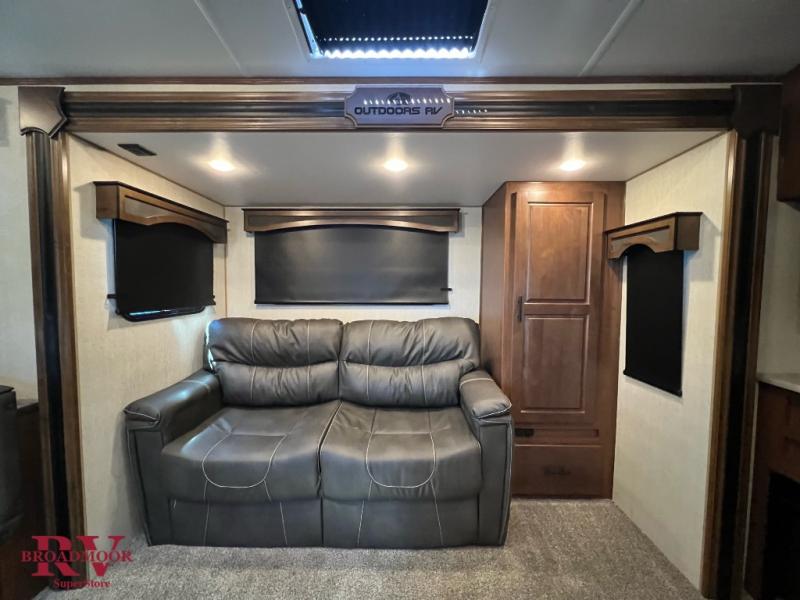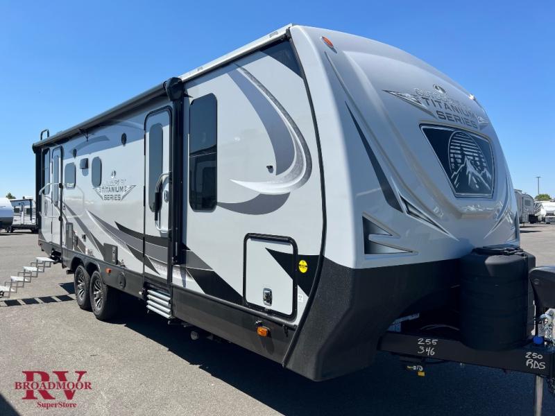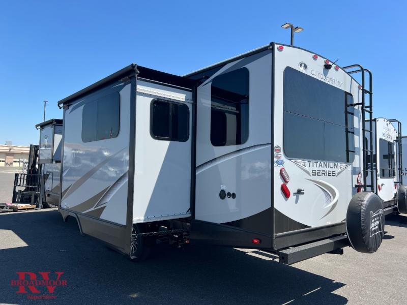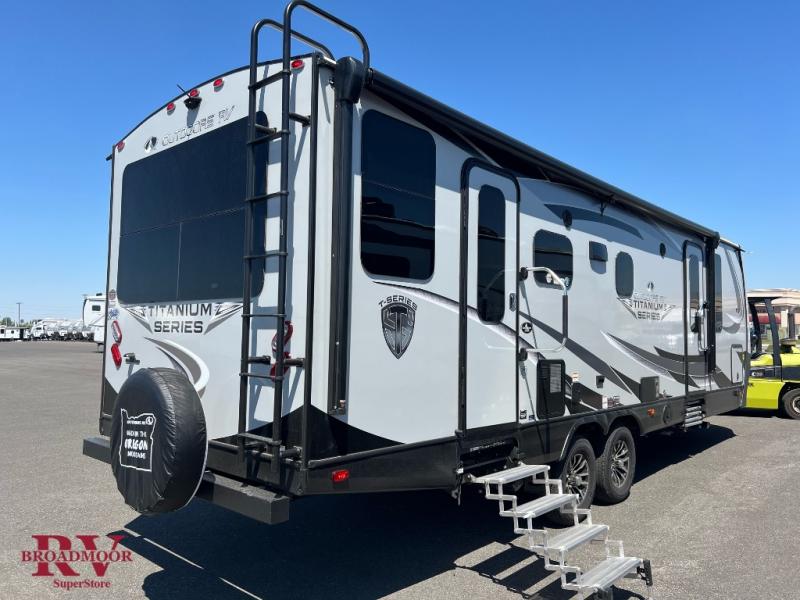 With any Black Stone Titanium Series travel trailer by Outdoors RV you will enjoy the sleek design frameless thermal pane windows, along with the silver fiberglass front cap and Titanium Series graphics package. The rugged 8' chassis with 5,200 lb. axles and XL ground clearance will make maneuvering tougher terrain easier than ever, and there is a ground control TT auto leveling system for hassle-free set-up. Each model includes LG solid surface countertops, mountain lodge interiors, hardwood slide out fascia(s), and many more comforts!
