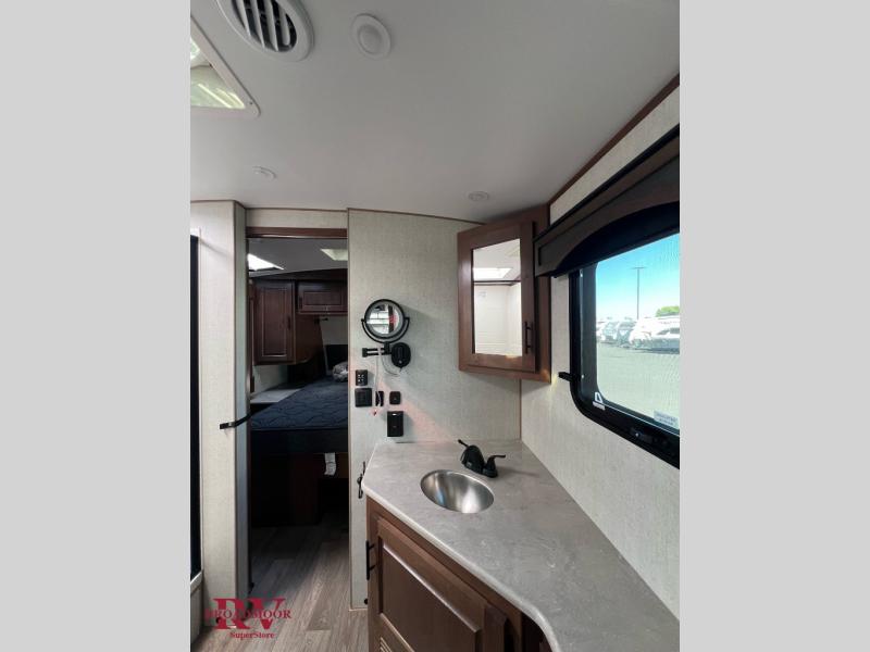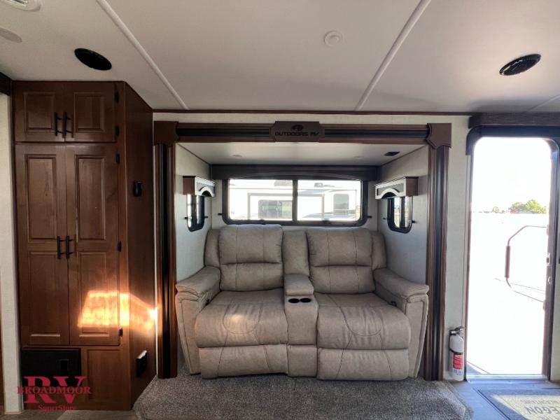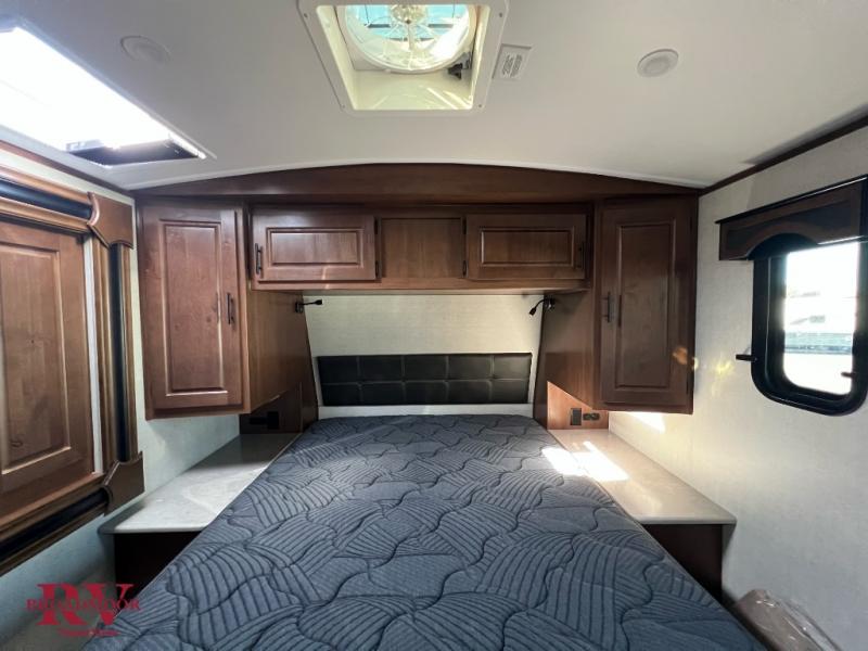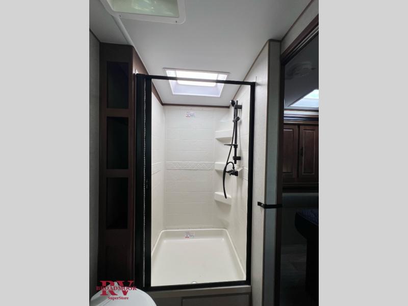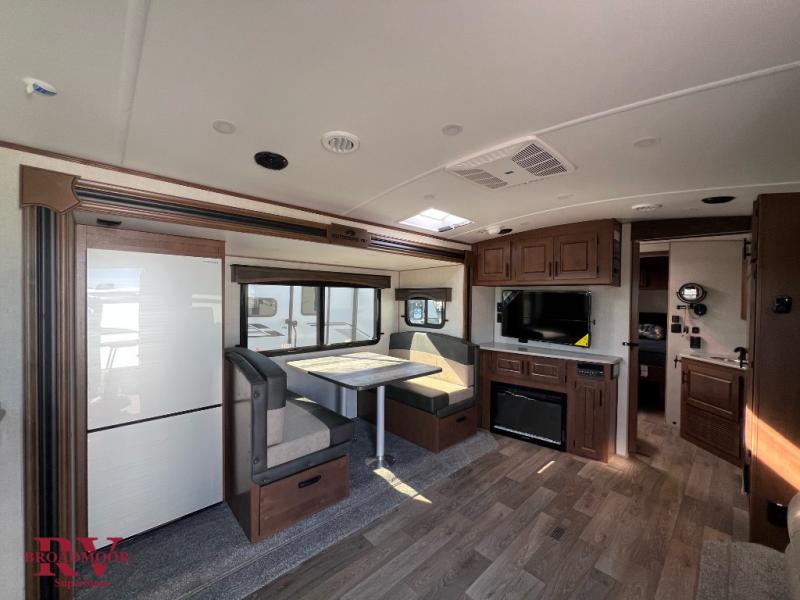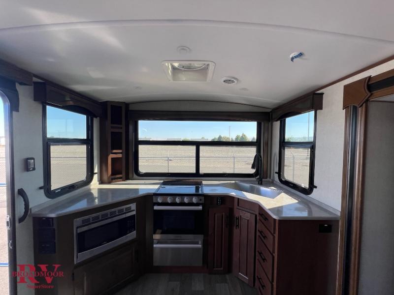 Dual entry doors in this travel trailer will allow you to enter in through the rear kitchen or the front master bedroom. A walk-through bath is easily accessible for everyone, and the main living area is made open thanks to the dual opposing slides. While dinner is being made on the three burner cooktop, you can play a game at the mountain dinette, or relax on the sofa with built-in recliners and watch a movie on the swing-out 40" TV. You'll appreciate plenty of storage space in this model, including a pantry, wardrobes on either side of the bed, plus a wardrobe slide in the bedroom for your favorite outfits!
