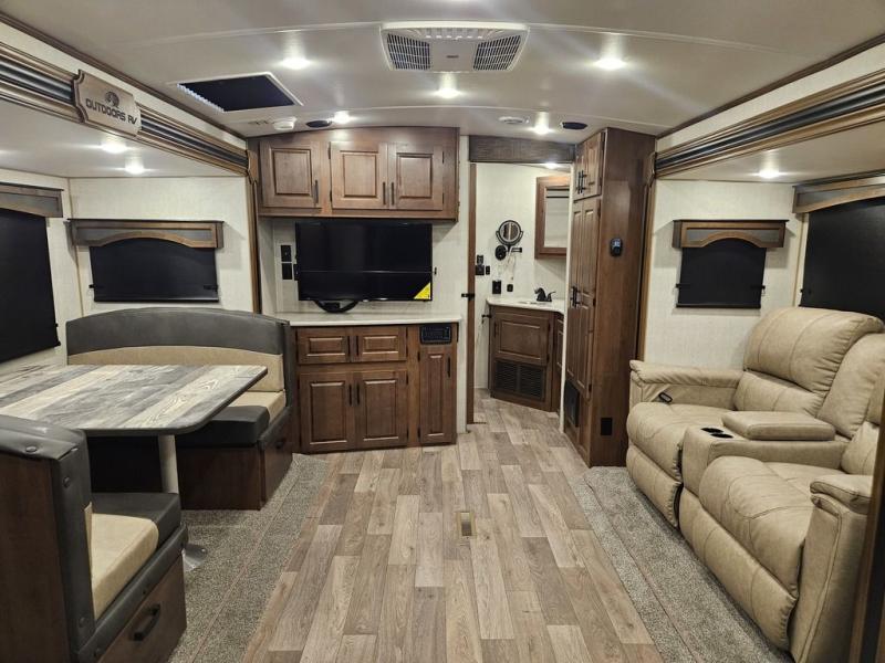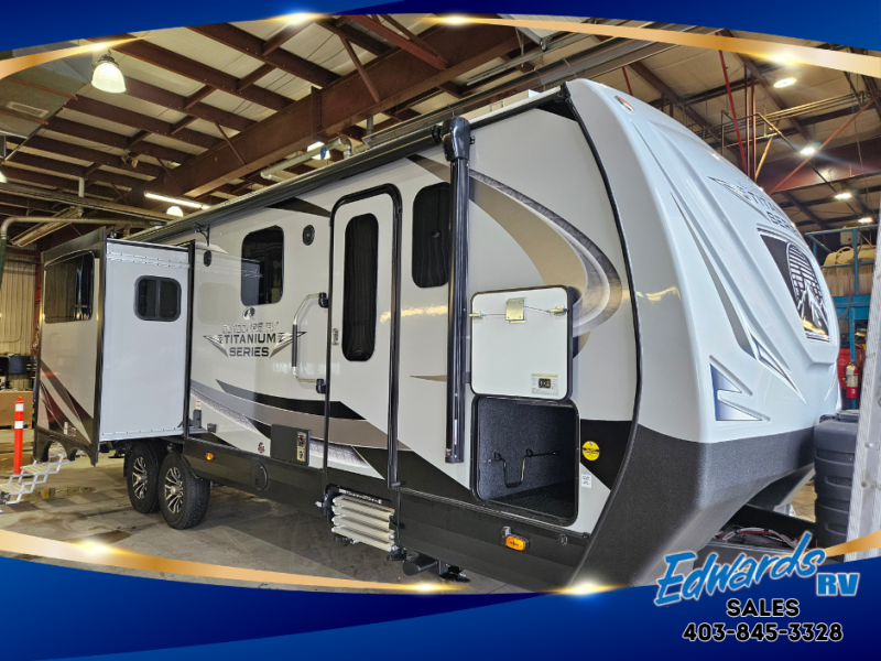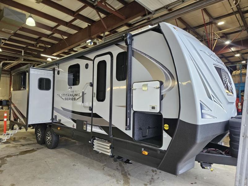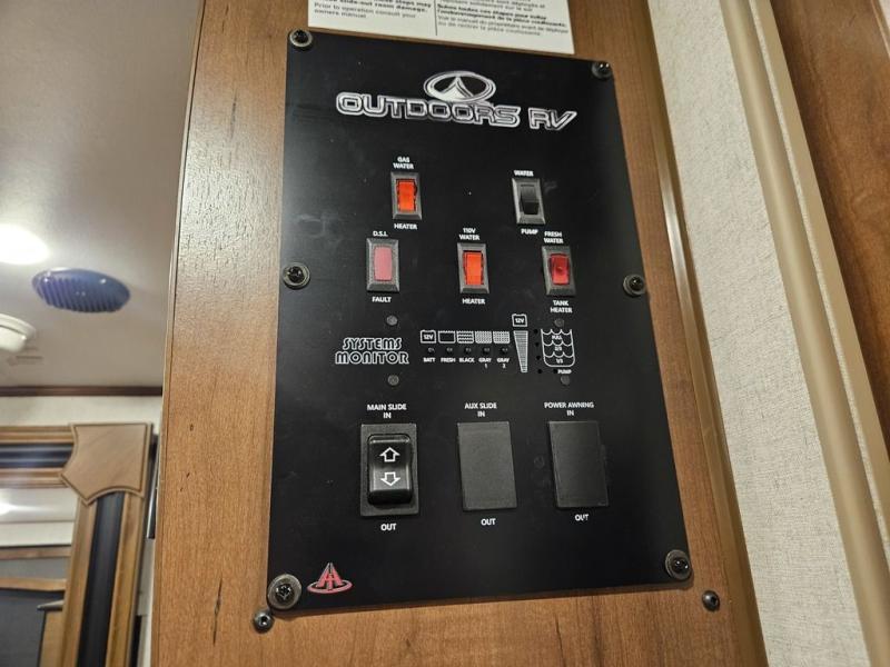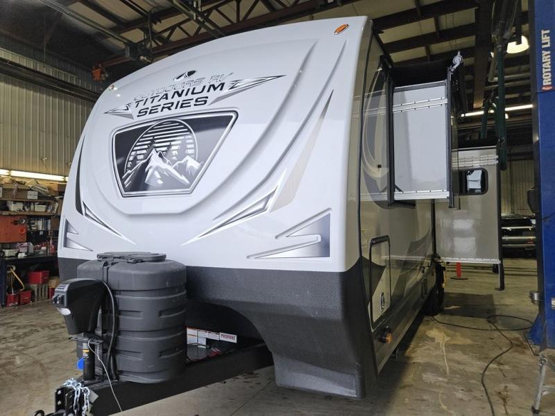 With any Black Stone Titanium Series travel trailer by Outdoors RV you will enjoy the sleek design frameless thermal pane windows, along with the silver fiberglass front cap and Titanium Series graphics package. The rugged 8' chassis with 5,200 lb. axles and XL ground clearance will make maneuvering tougher terrain easier than ever, and there is a ground control TT auto leveling system for hassle-free set-up. Each model includes LG solid surface countertops, mountain lodge interiors, hardwood slide out fascia(s), and many more comforts!