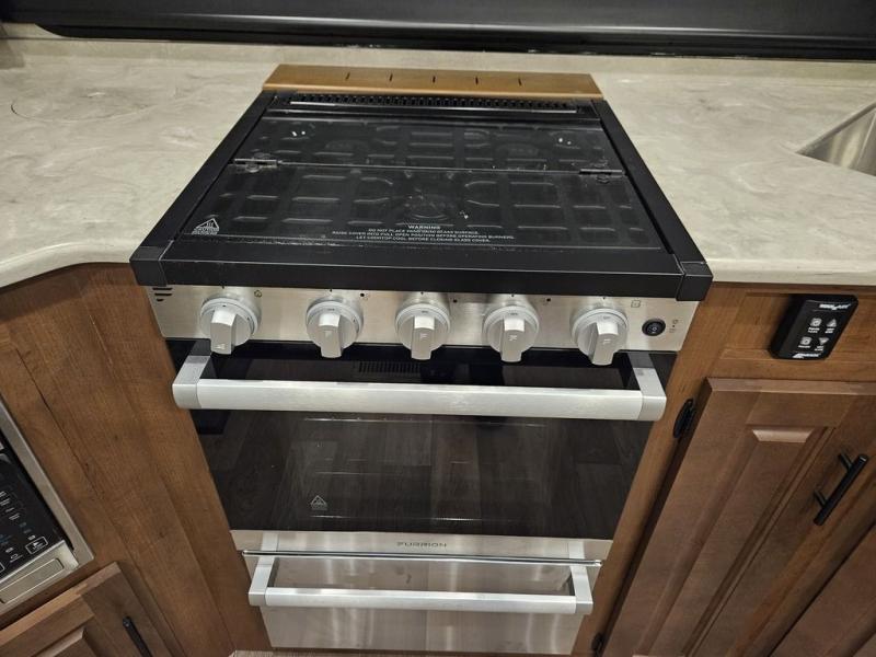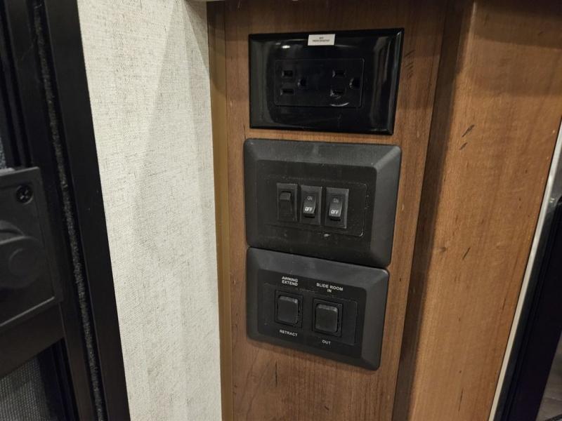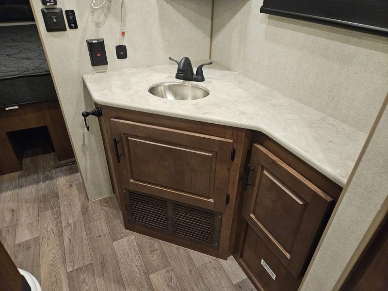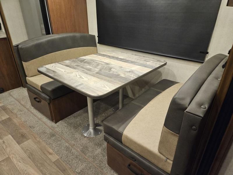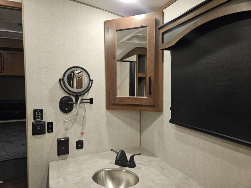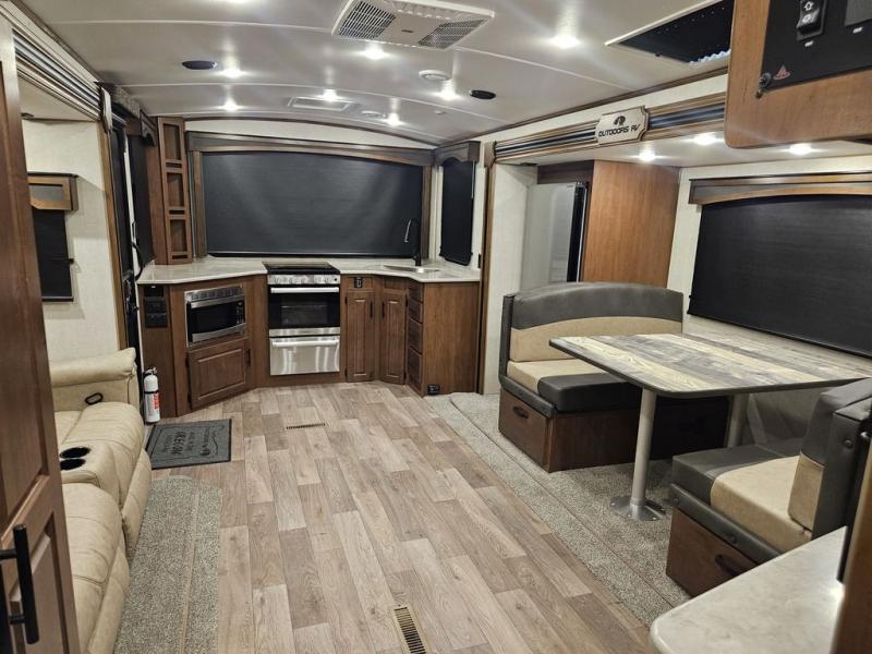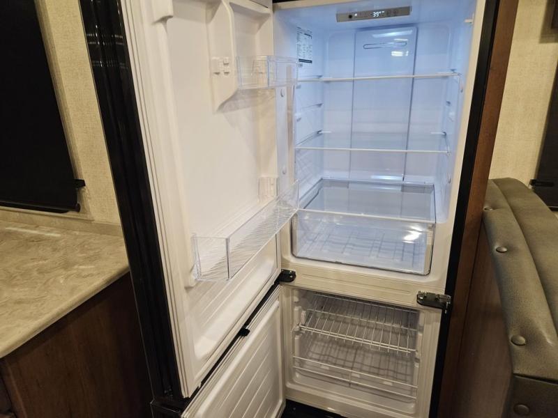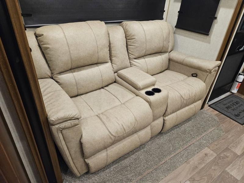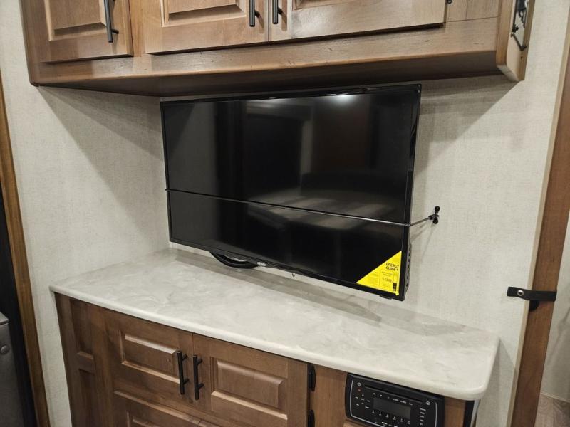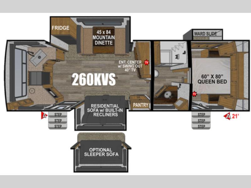 Dual entry doors in this travel trailer will allow you to enter in through the rear kitchen or the front master bedroom. A walk-through bath is easily accessible for everyone, and the main living area is made open thanks to the dual opposing slides. While dinner is being made on the three burner cooktop, you can play a game at the mountain dinette, or relax on the sofa with built-in recliners and watch a movie on the swing-out 40" TV. You'll appreciate plenty of storage space in this model, including a pantry, wardrobes on either side of the bed, plus a wardrobe slide in the bedroom for your favorite outfits!